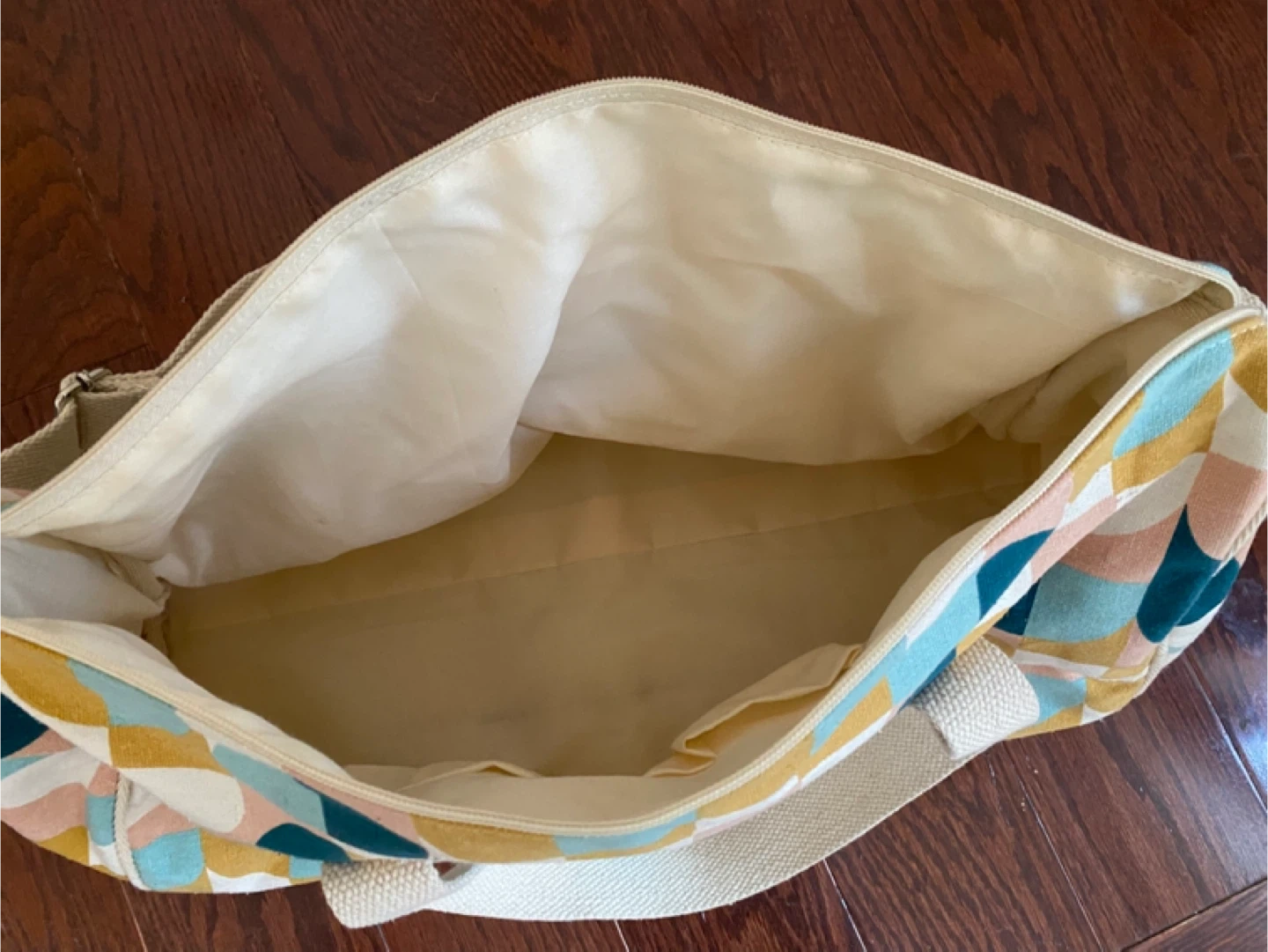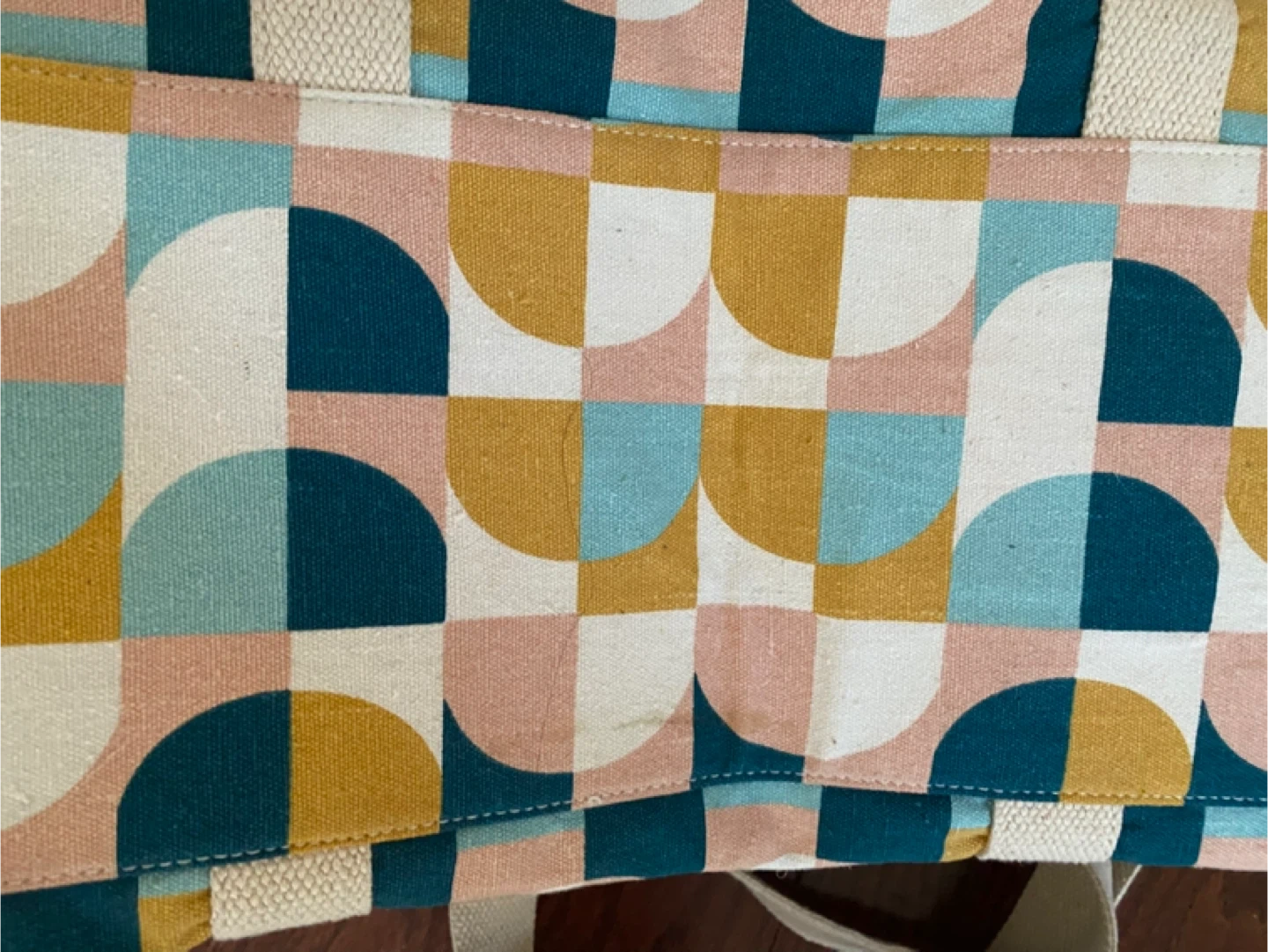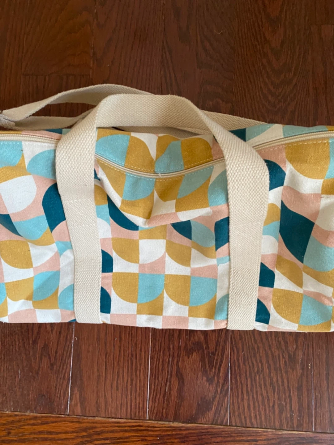 Here's a colourful duffle bag with a geometric pattern! It's in great condition and ready for your next trip to the gym or a weekend getaway. The bag features sturdy handles and a spacious interior. Cotton material Approx 18”x11” Brand New Cash only