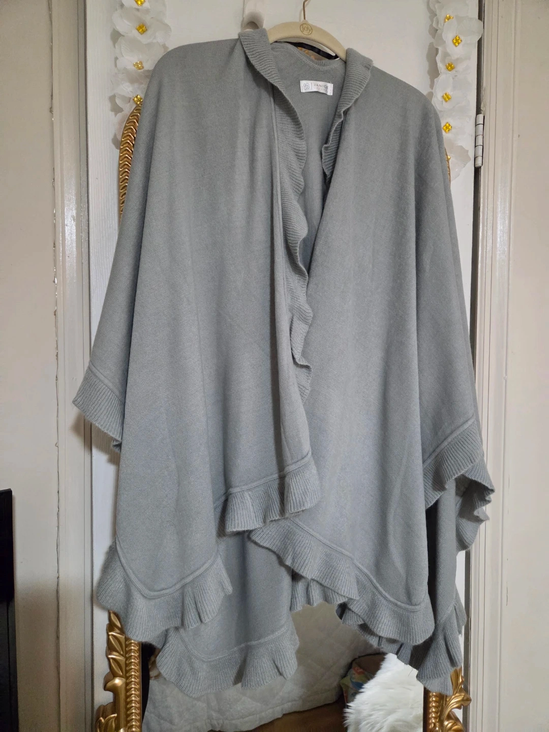 Selling a Tanice poncho in a lovely shade of gray! It features a charming ruffle design. This poncho is perfect for adding a touch of elegance to any outfit. It's in great condition and ready for a new owner!