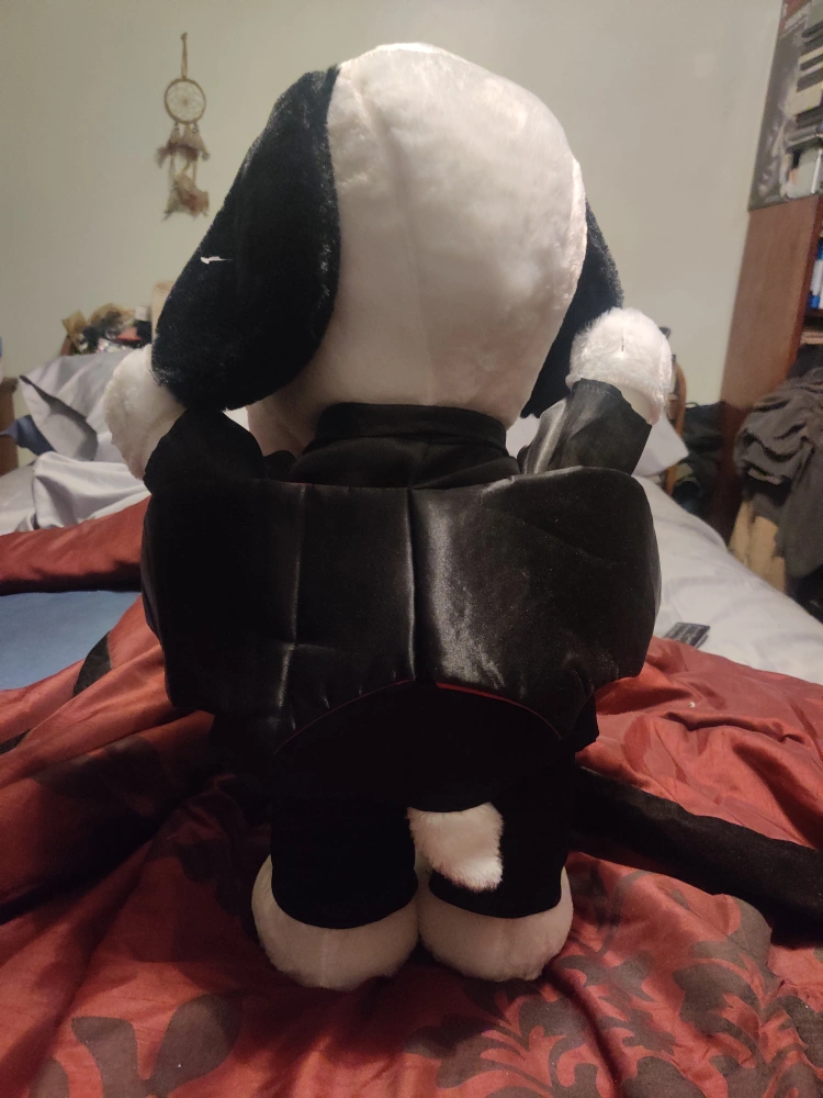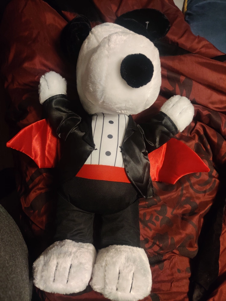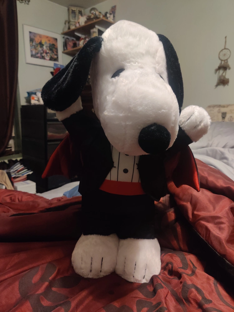 Here's a cute Snoopy plush dressed up as a vampire! It's in great condition and ready to add some spooky charm to your collection or Halloween decor. This plush toy features Snoopy in a black tuxedo with a red cummerbund and a cape, complete with his signature floppy ears. a Hallmark product a expensive Snoopy well made