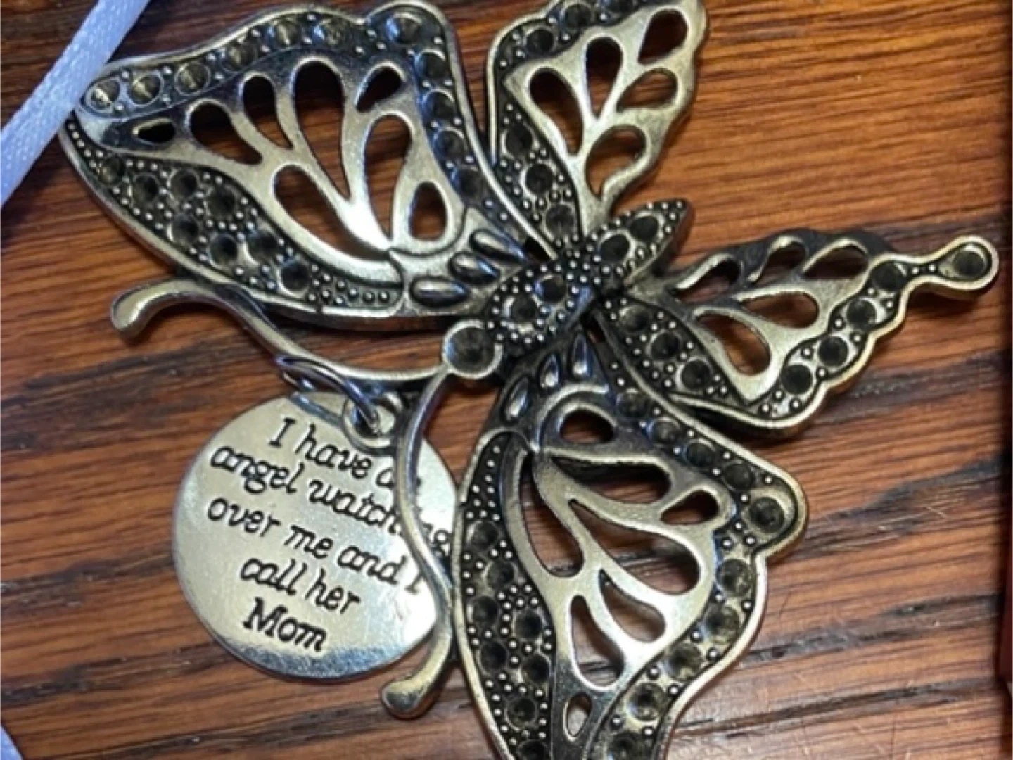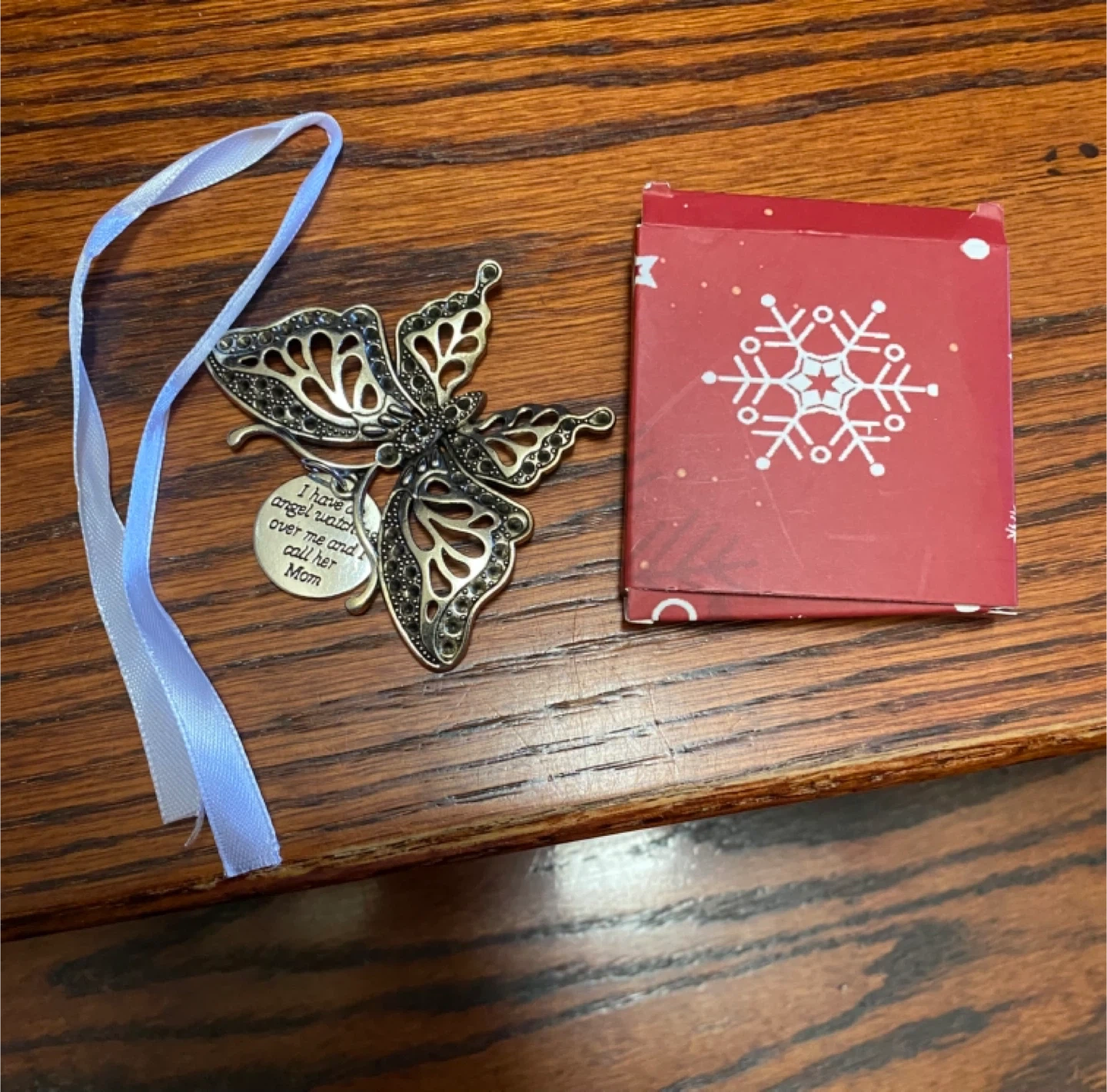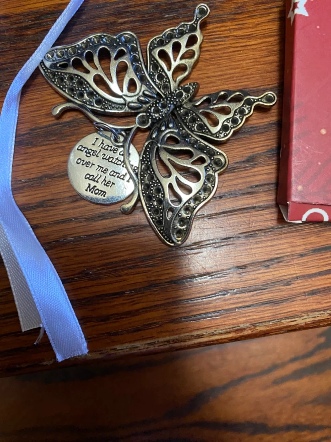 This is a butterfly ornament with a pendant that reads, "I have an angel watching over me and I call her Mom". It comes with a box, perfect for gifting or keeping it safe for years to come