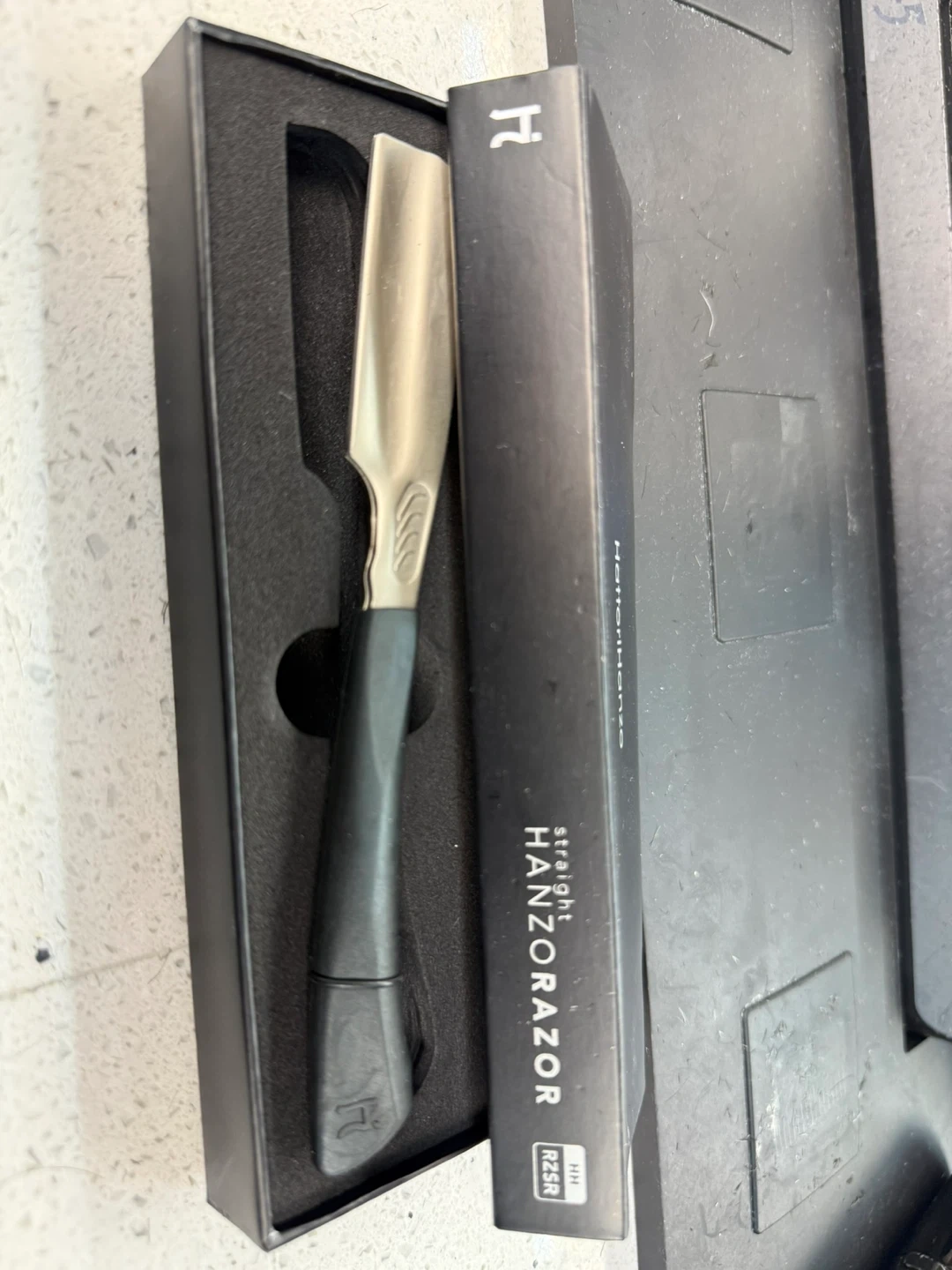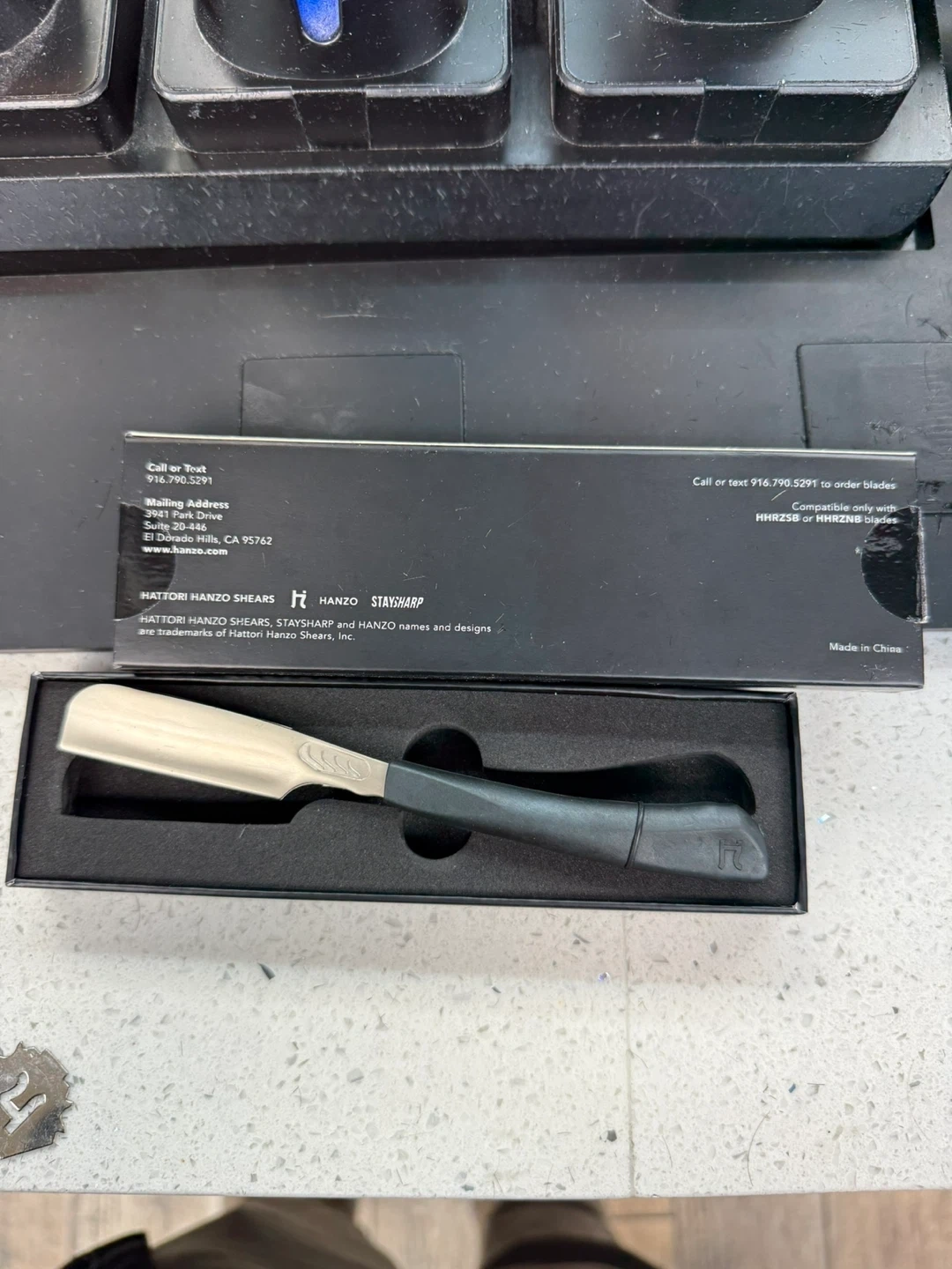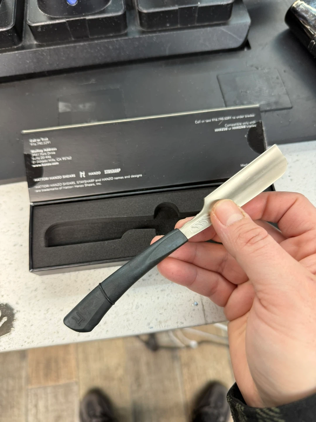 Premium stainless steel straight razor with silicon resin handle designed for stylists and barbers. Spring-mounted clamp mechanism holds blades firmly in place and allows stylists to easily load and unload disposable blades. Compatible with Hanzo straight (HHRZSB) and nano/guarded (HHRZNB) blades.