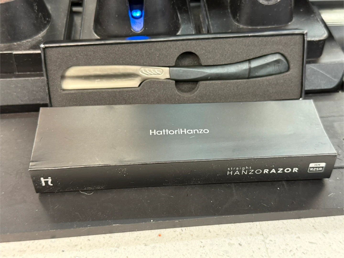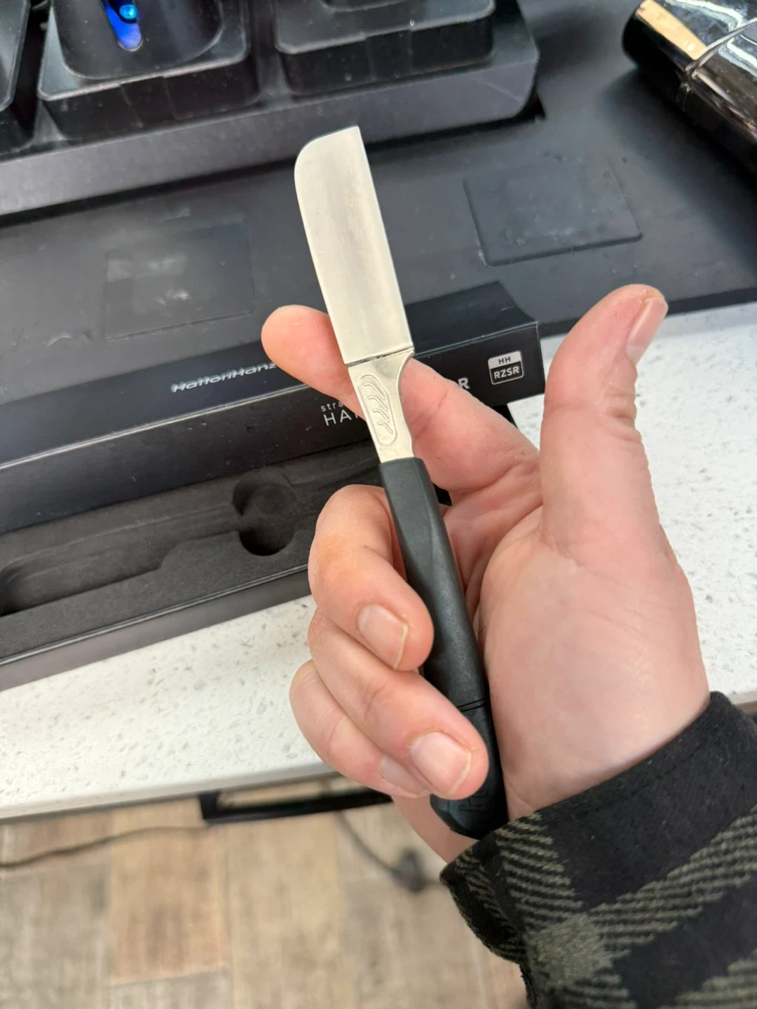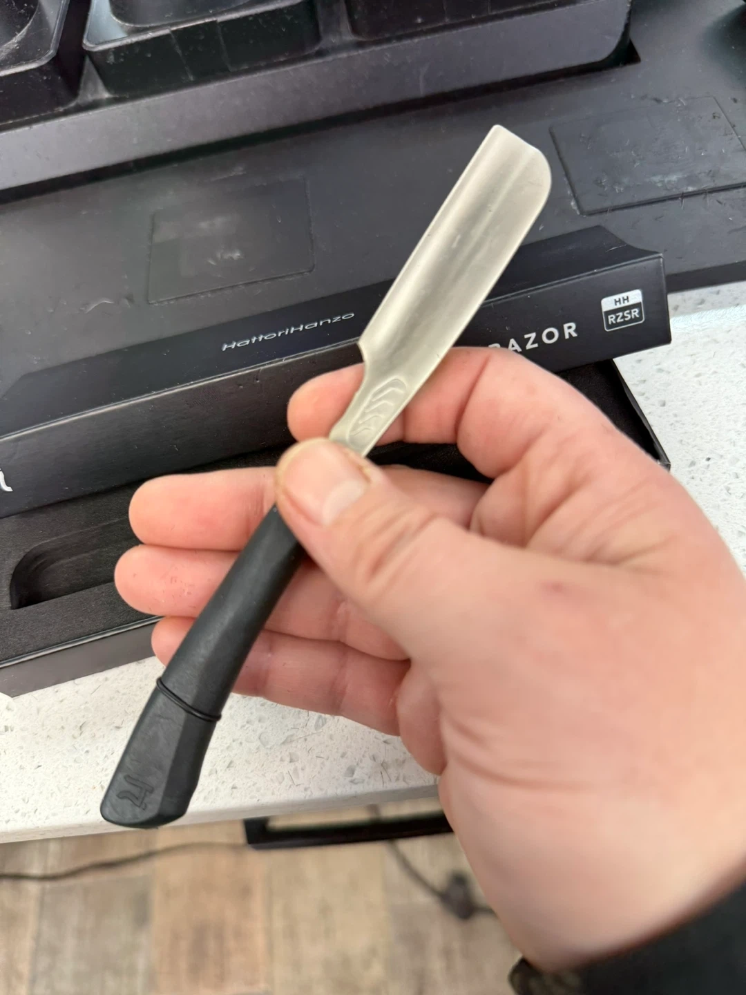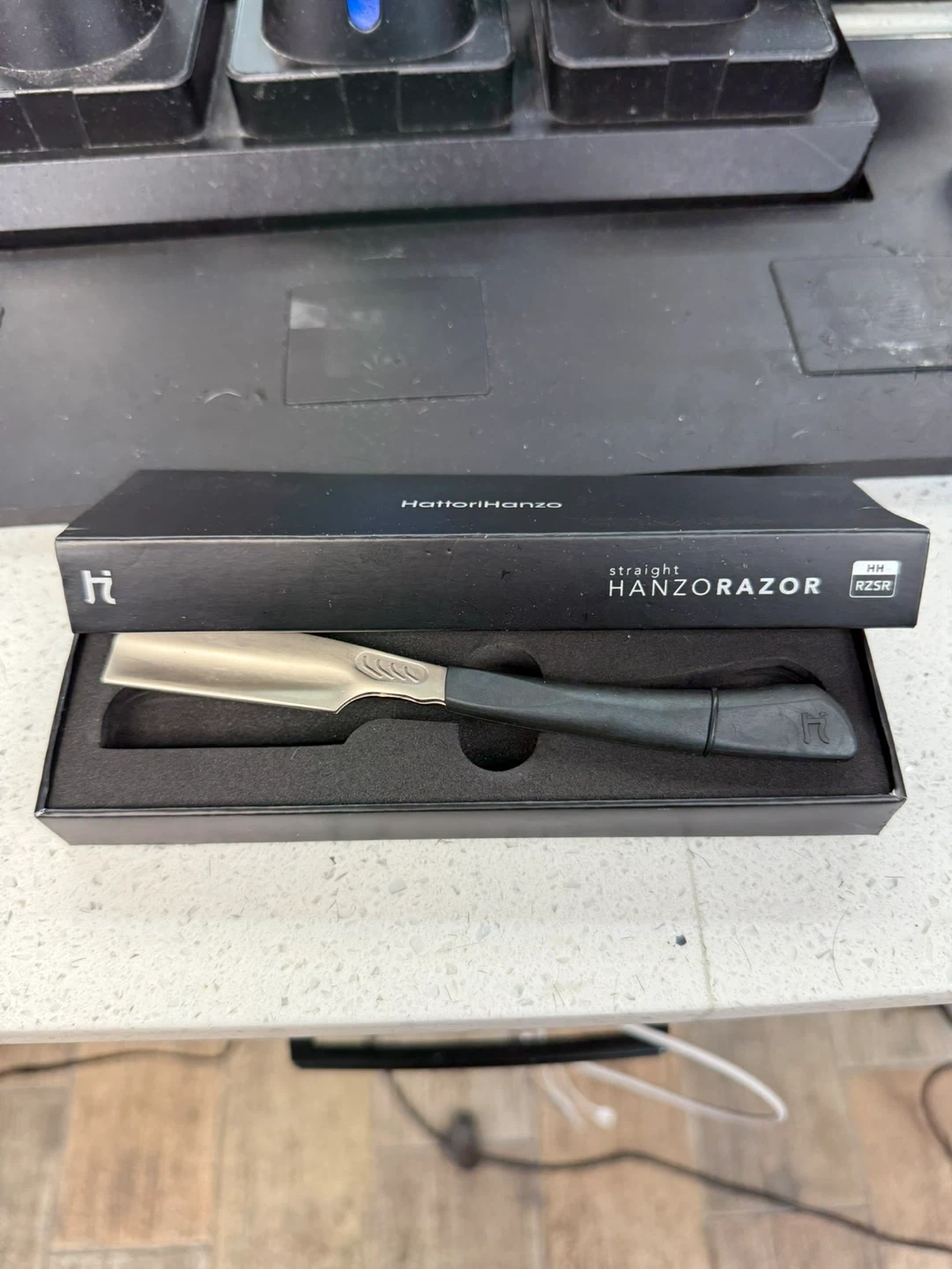 Premium stainless steel straight razor with silicon resin handle designed for stylists and barbers. Spring-mounted clamp mechanism holds blades firmly in place and allows stylists to easily load and unload disposable blades. Compatible with Hanzo straight (HHRZSB) and nano/guarded (HHRZNB) blades.
