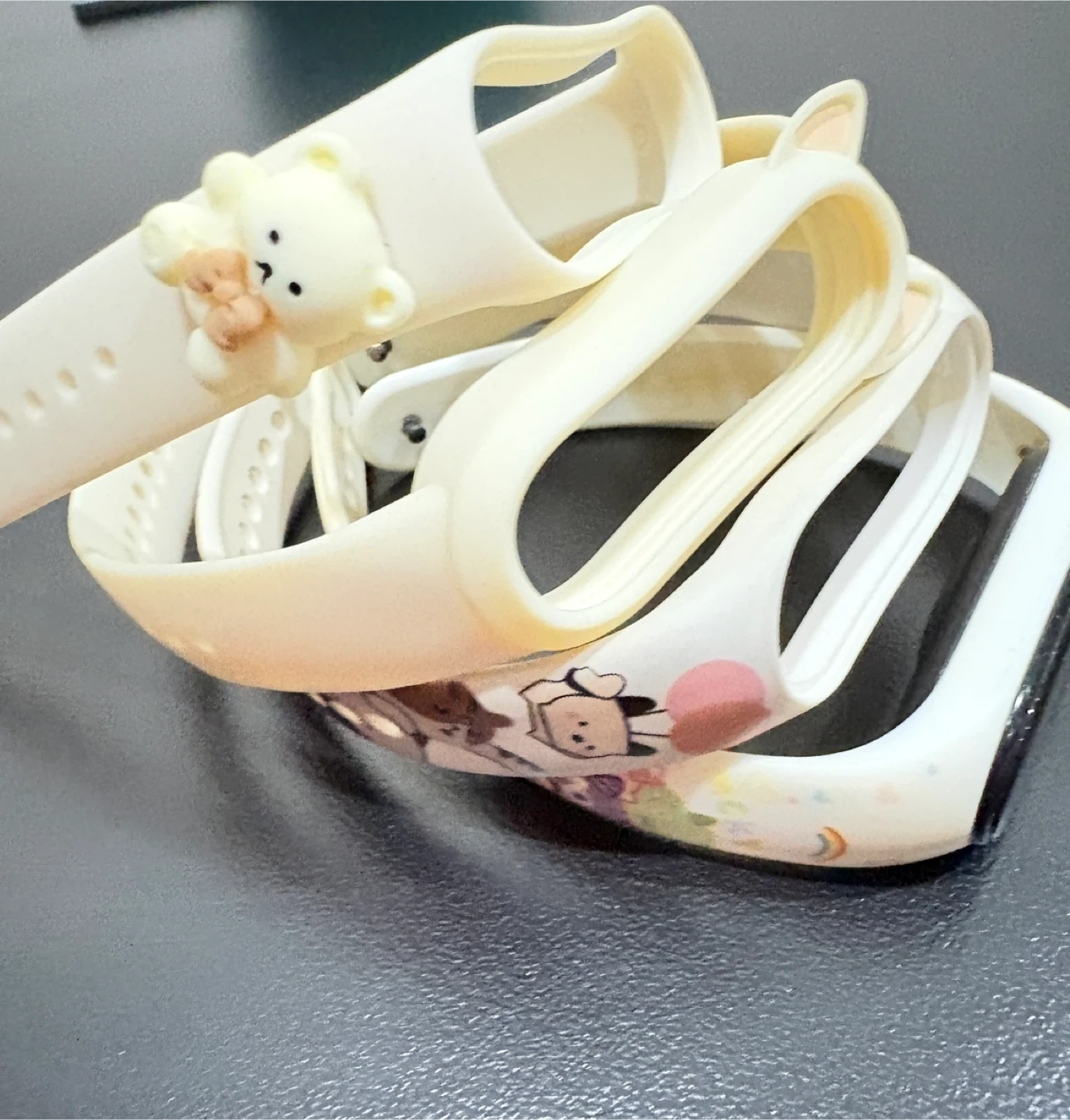 Here are some cute activity tracker bands! They're white and feature fun designs like a bear and other cute characters. Perfect for adding a touch of fun to your fitness routine