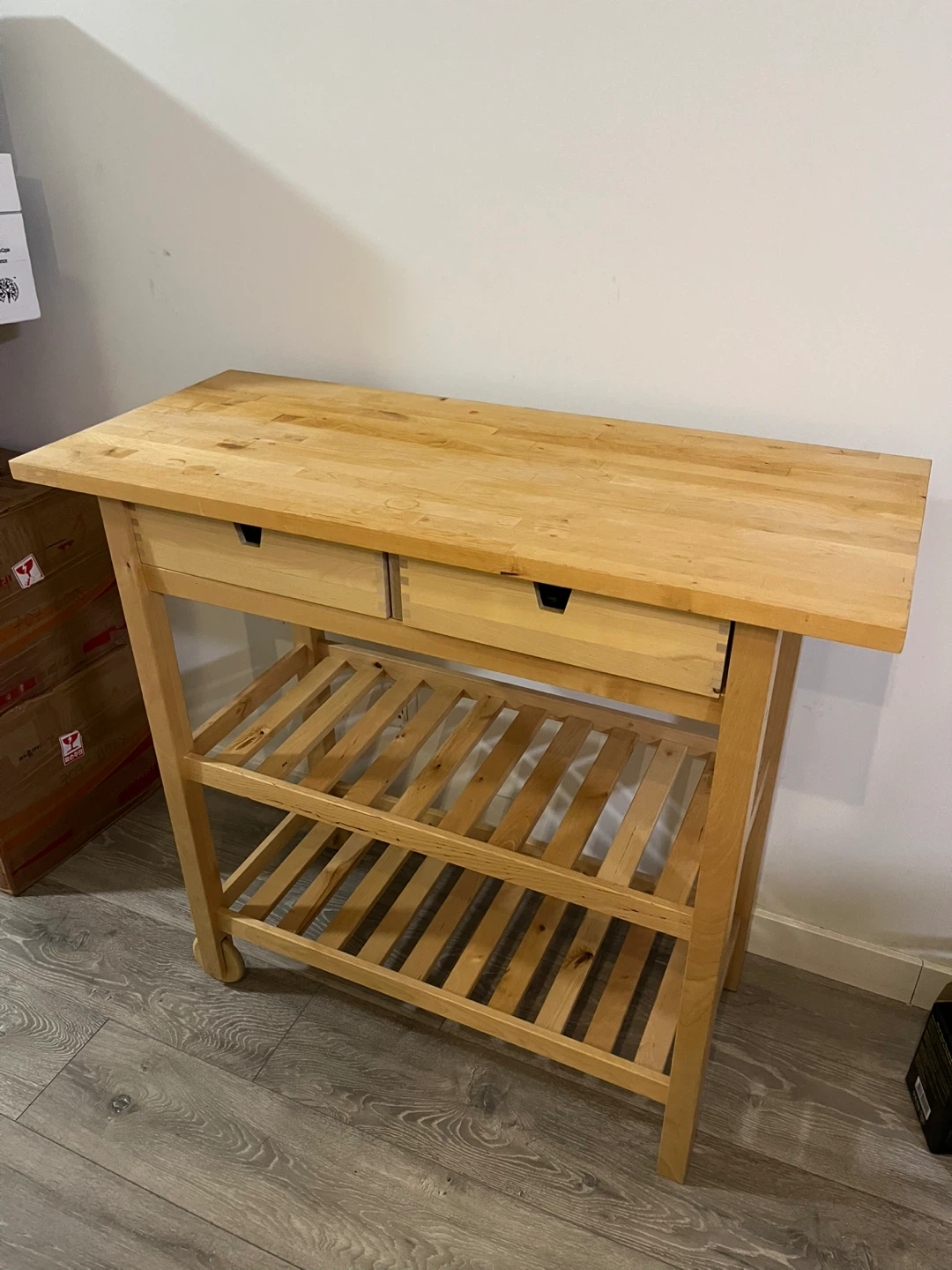 Selling an IKEA Bekväm kitchen cart in birch. It's in good condition and ready to help you with extra kitchen storage and prep space. Perfect for small kitchens or as a mobile workstation. (However it does have some coffee stains, not too noticeable)