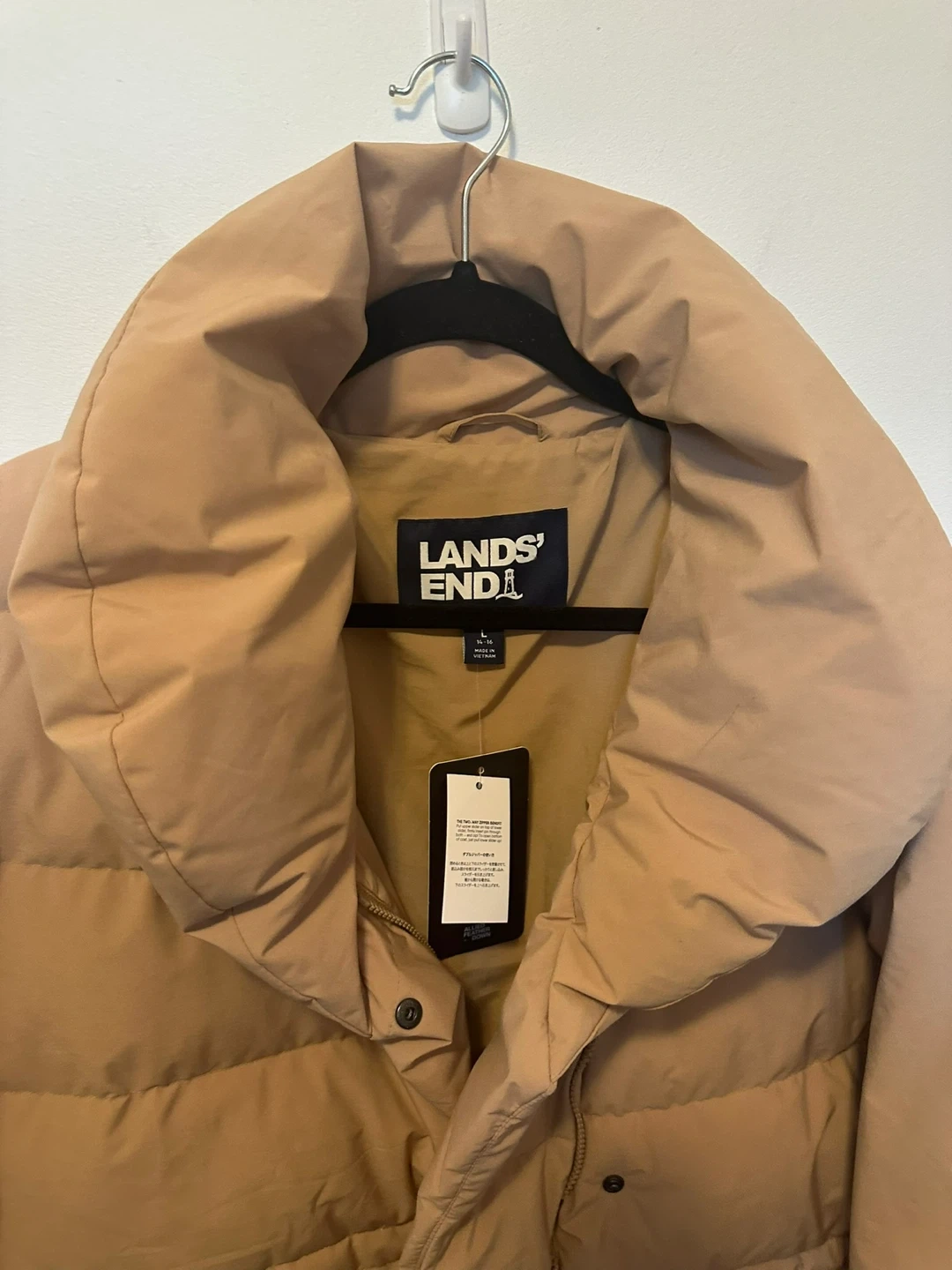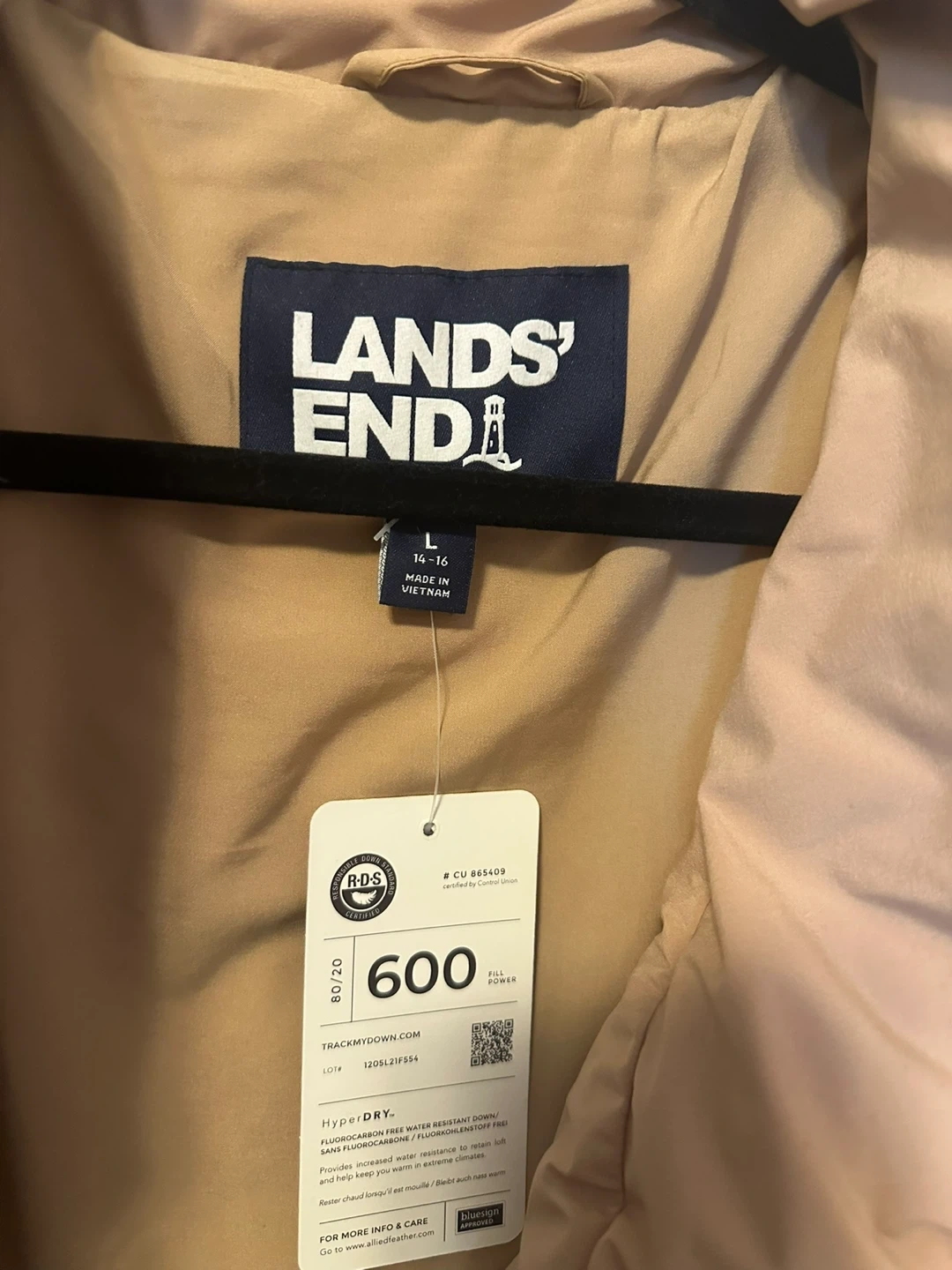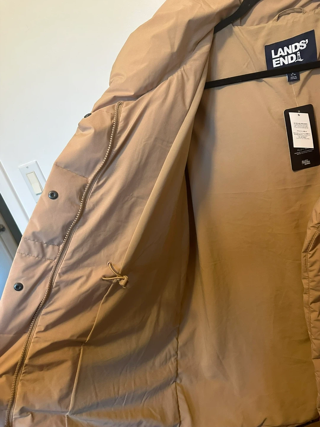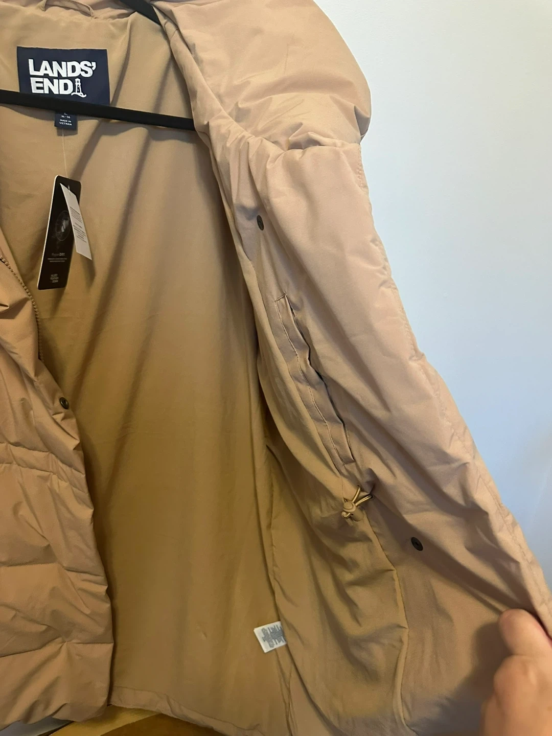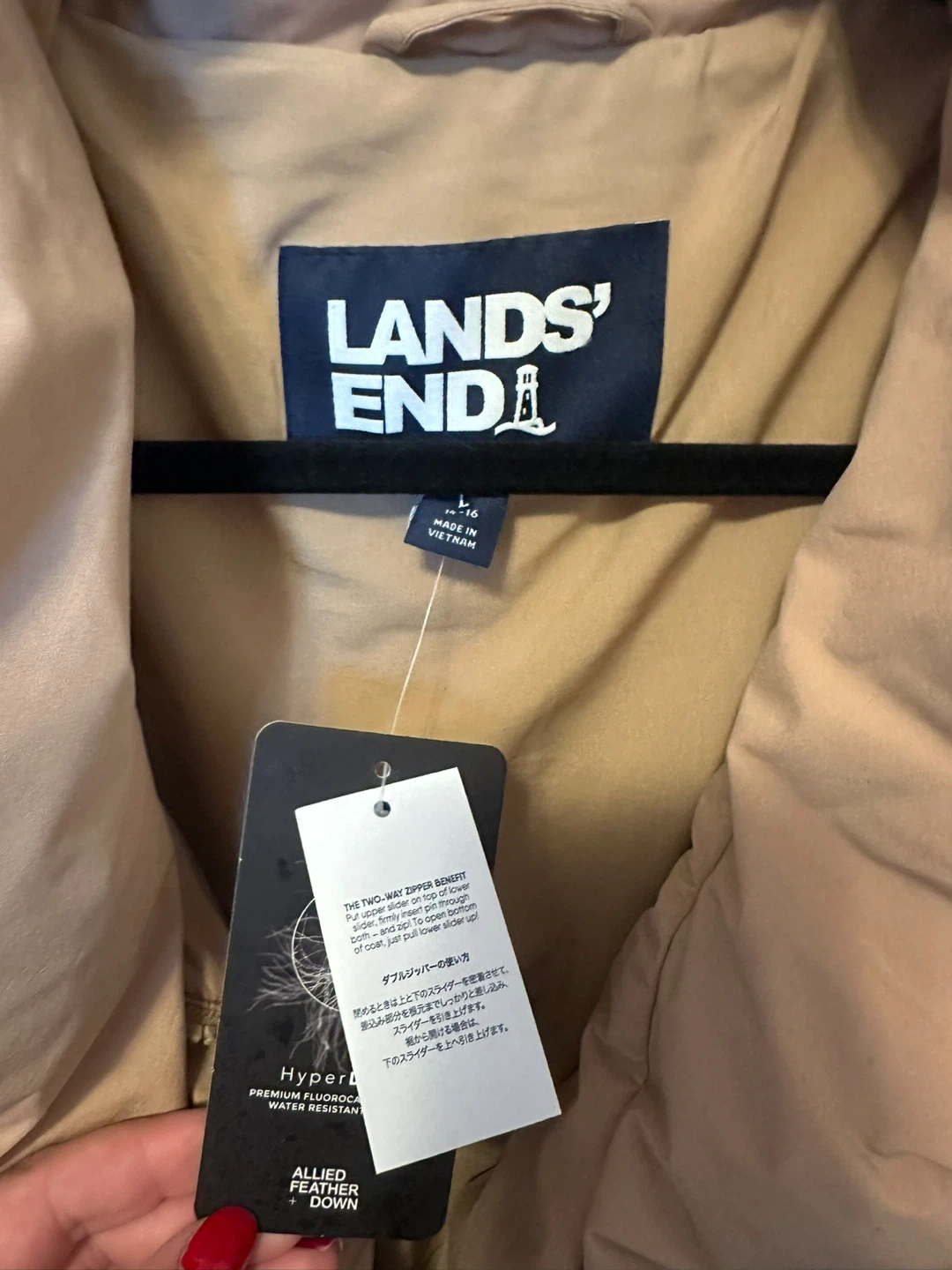 I'm selling a brand new Lands' End women's puffer jacket! It's a size large and still has the original tags attached. This jacket features HyperDRY technology, providing premium fluorocarbon-free water resistance to keep you warm and dry