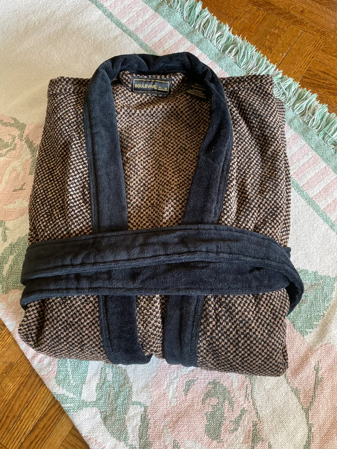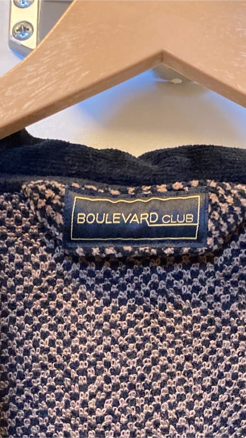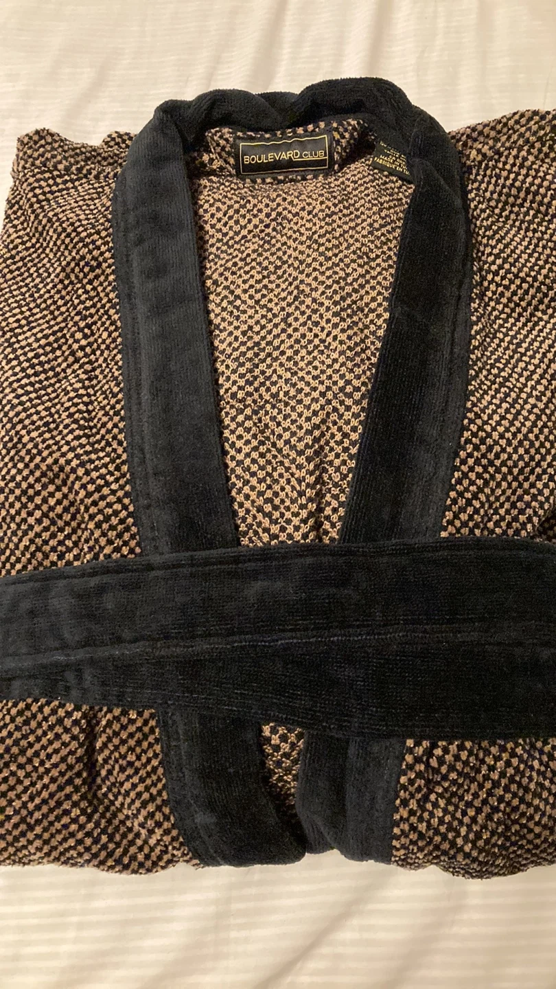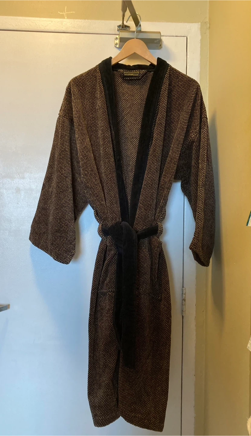 Here's a cozy Boulevard Club robe! It features a brown and black patterned design with a black velvet-like trim and belt. Perfect for lounging around the house.