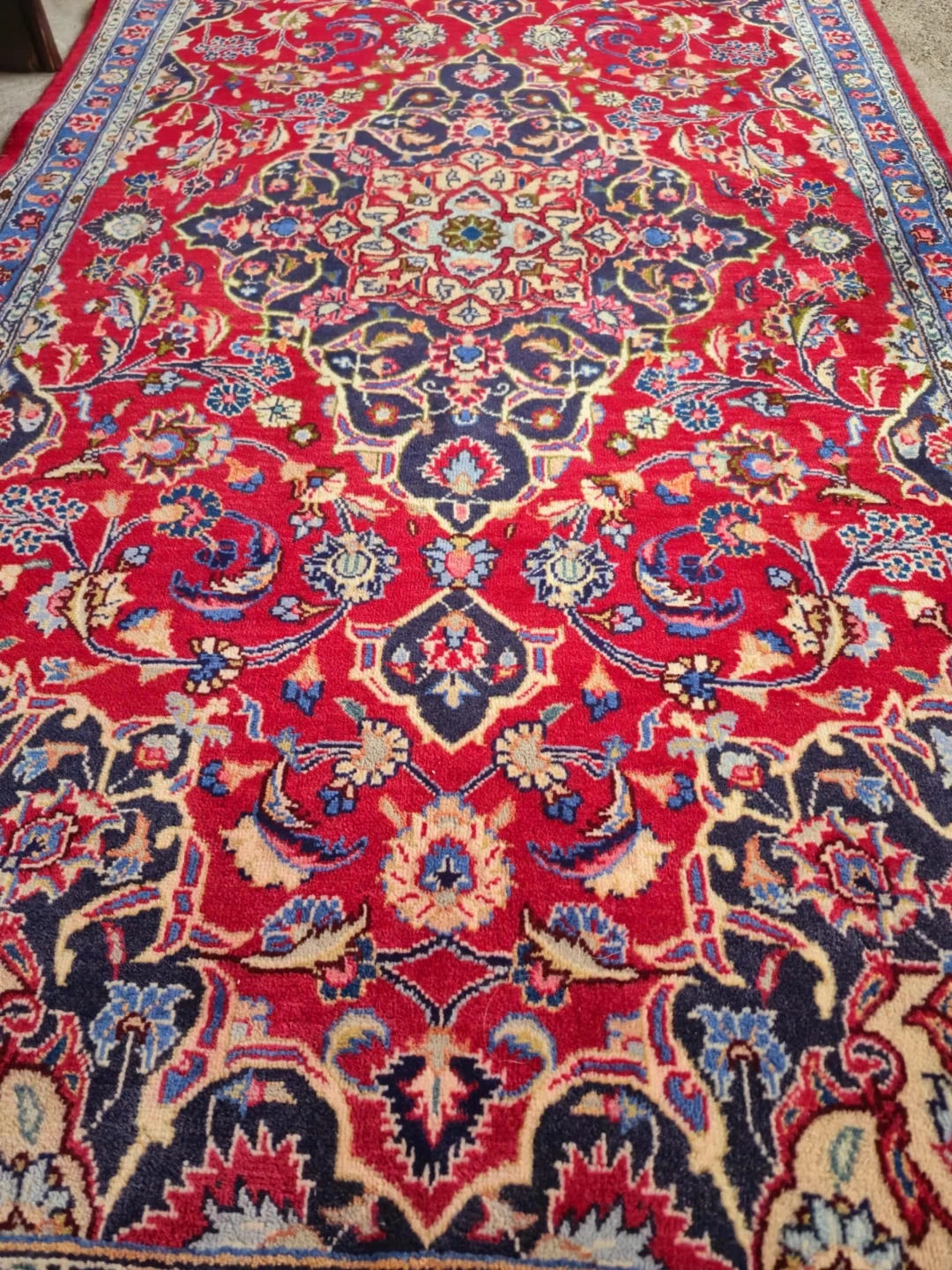 It features a rich red field with intricate floral and medallion patterns, framed by classic blue and cream borders.