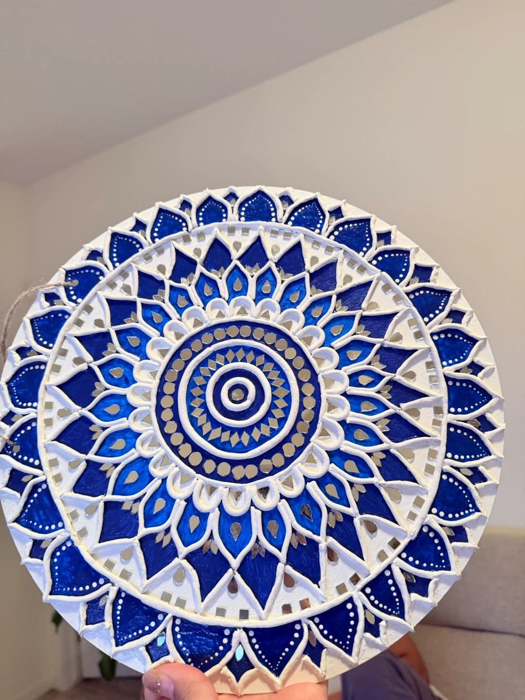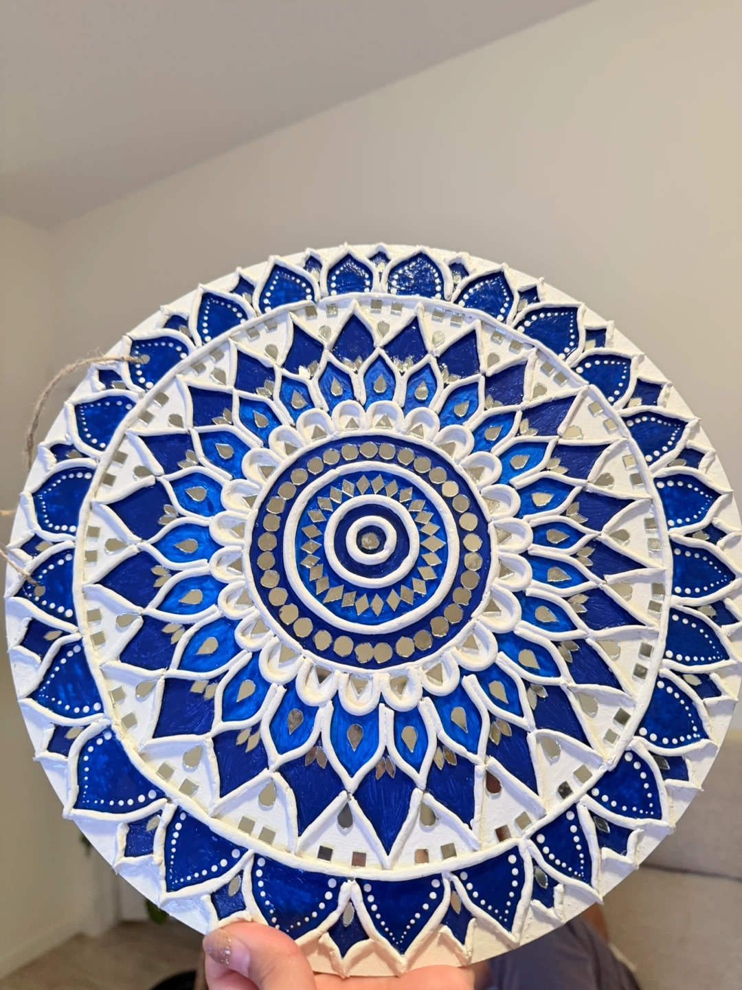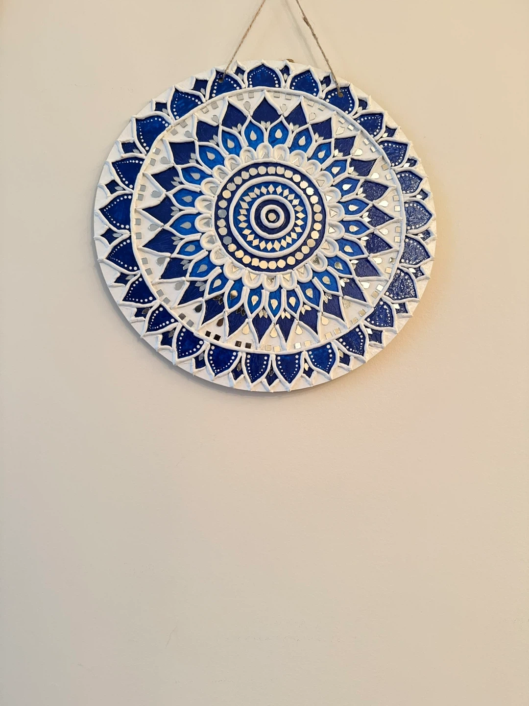 This is a beautiful piece of wall decor featuring a blue and white mandala design. It's in great condition and would add a lovely touch to any room