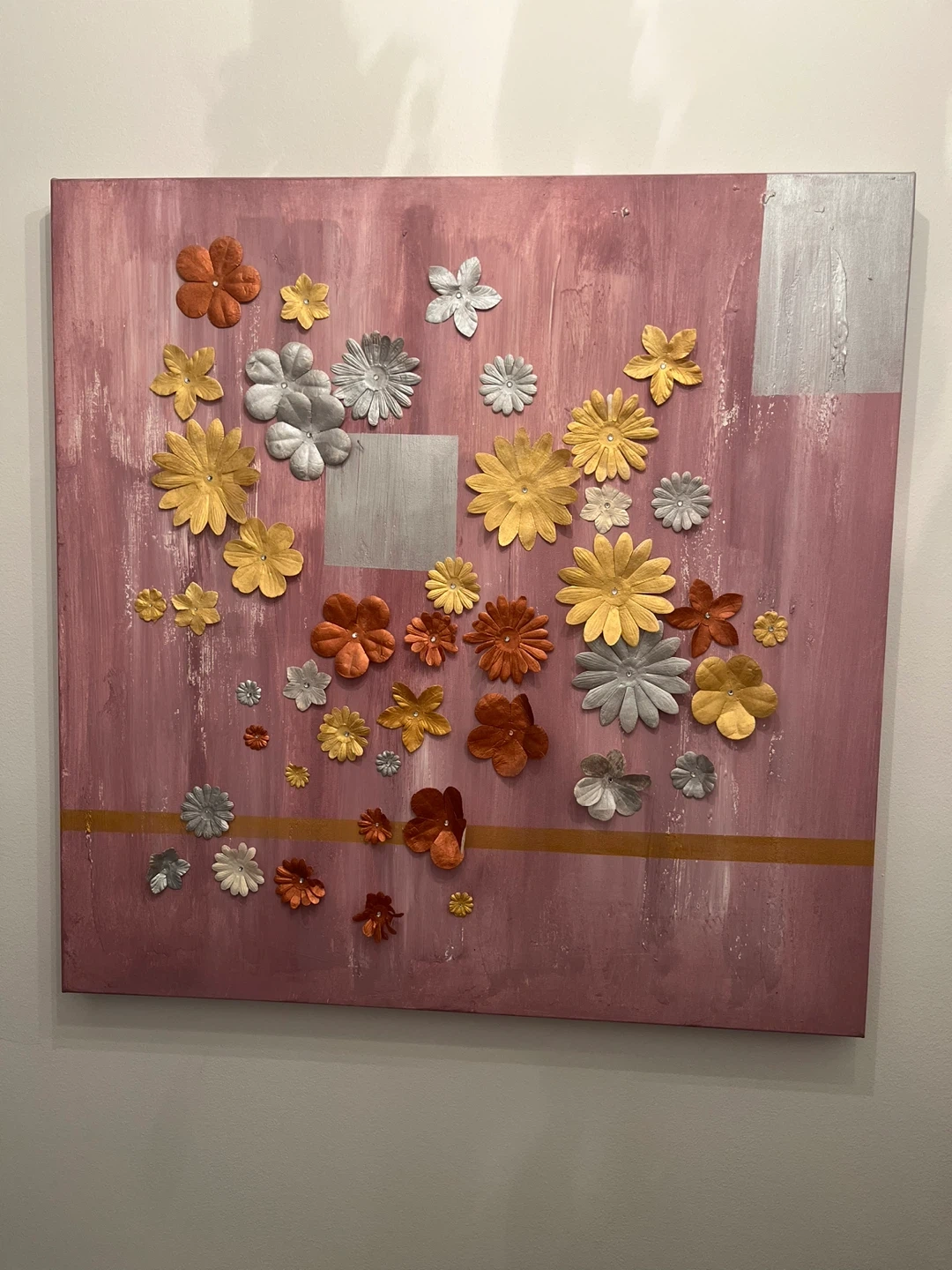 Unique floral wall art featuring a mix of silver, gold, and orange flowers on a pink background. Adds a touch of elegance to any room!