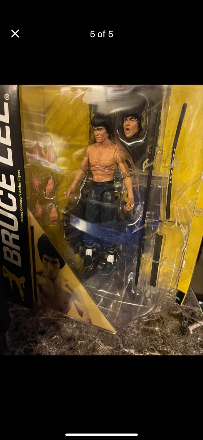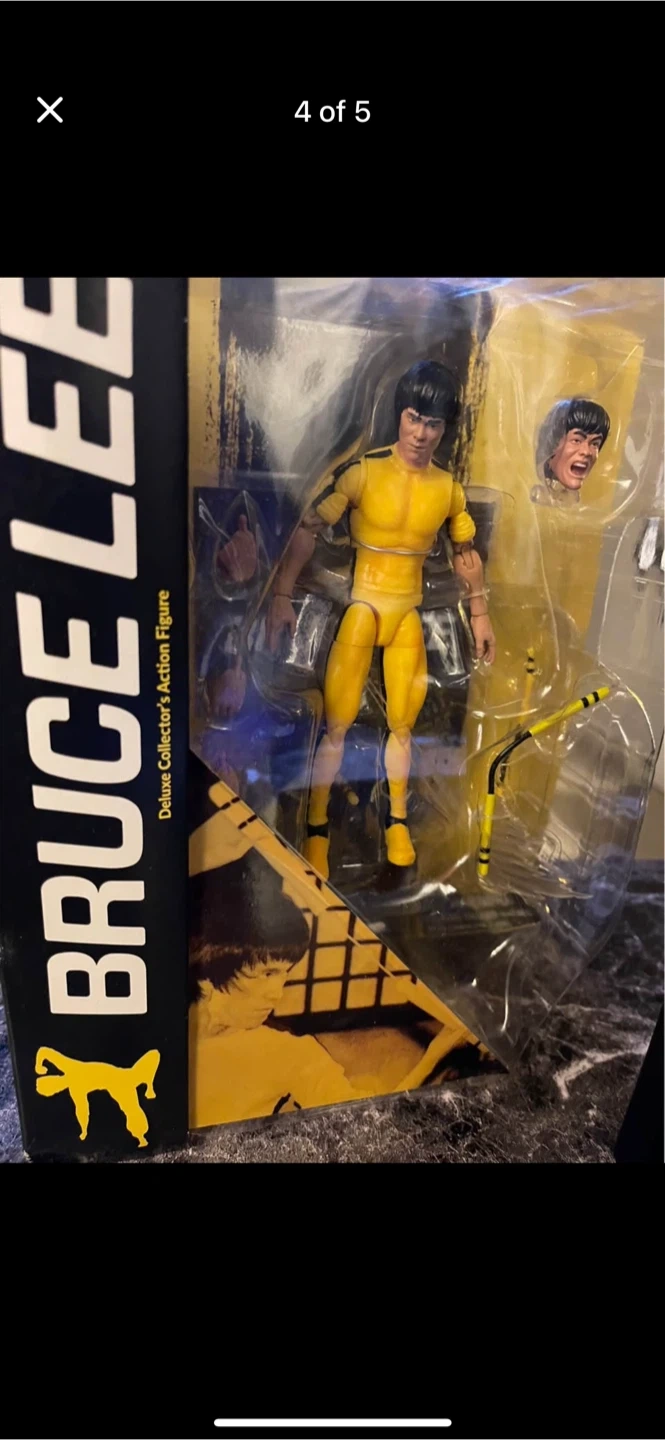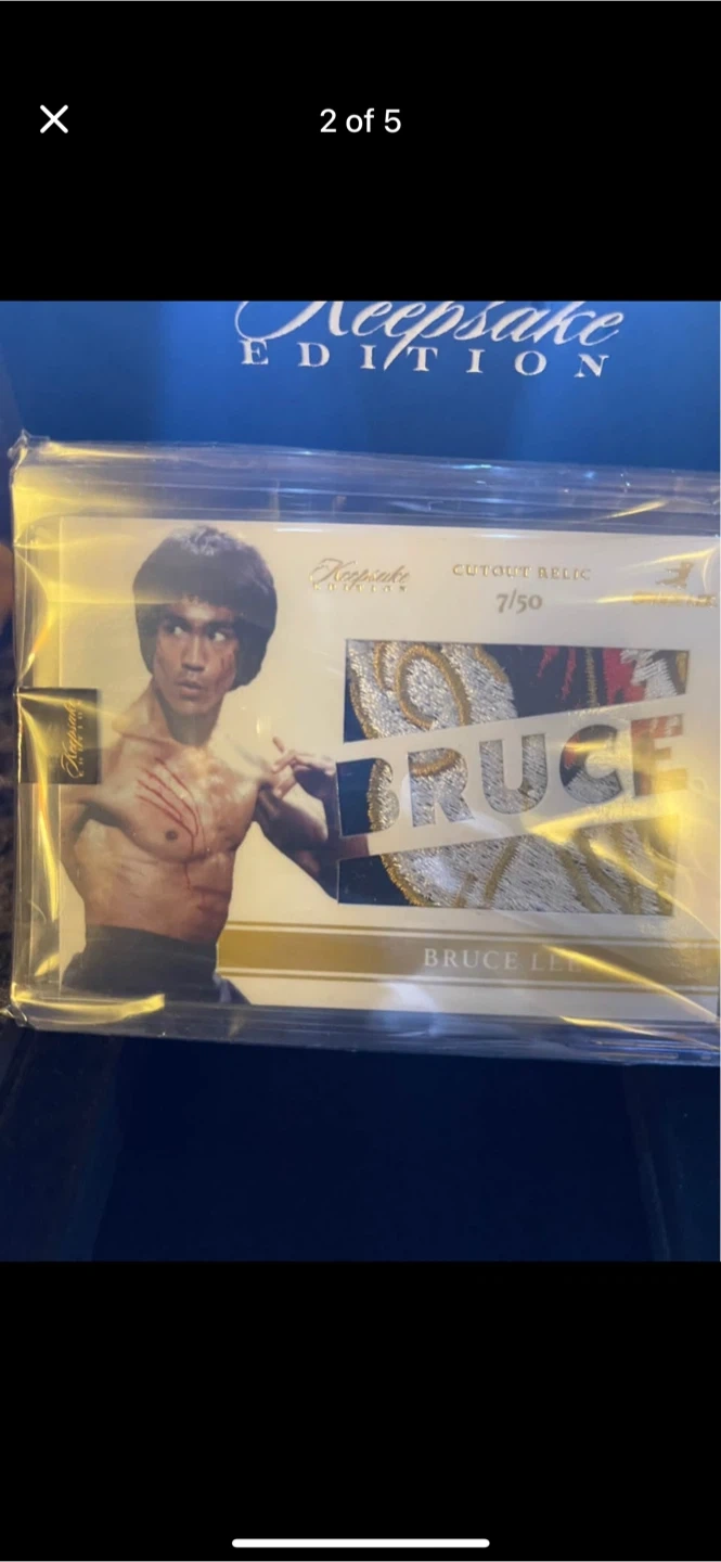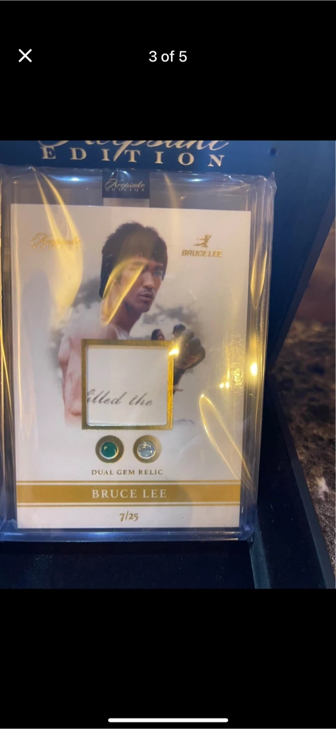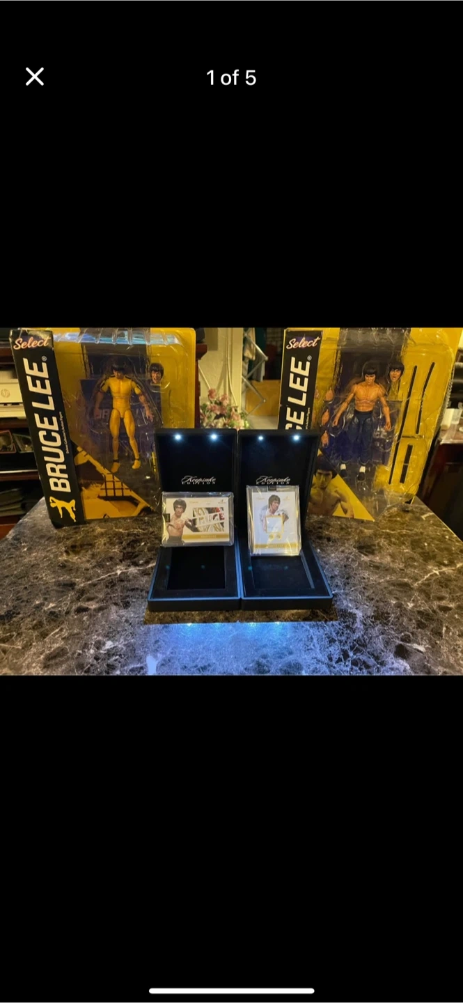 Selling a Bruce Lee action figure and relic card lot. The action figure is a Deluxe Collector's Action Figure. The cards are Keepsake and Sapphire Edition Relic cards. both cards come with display case.