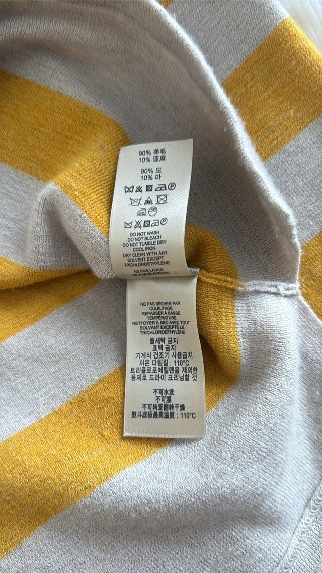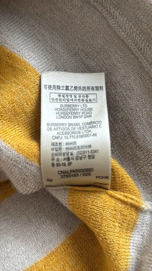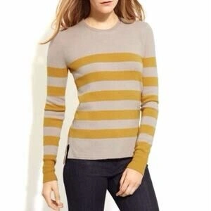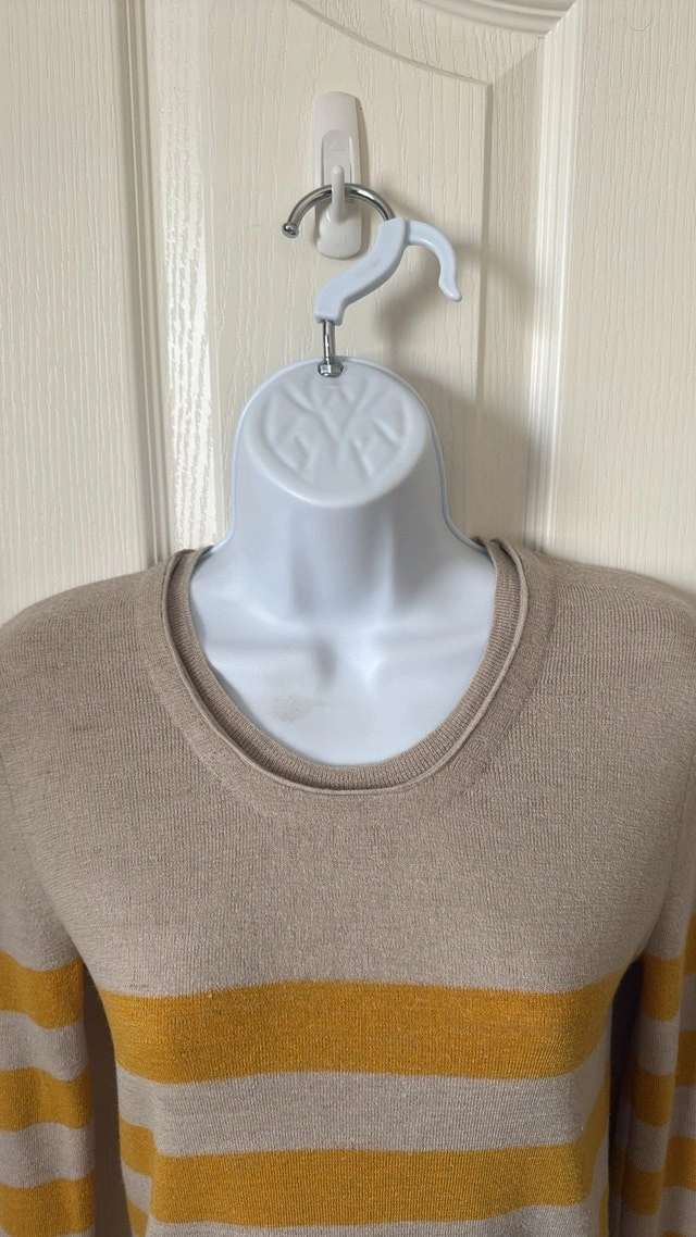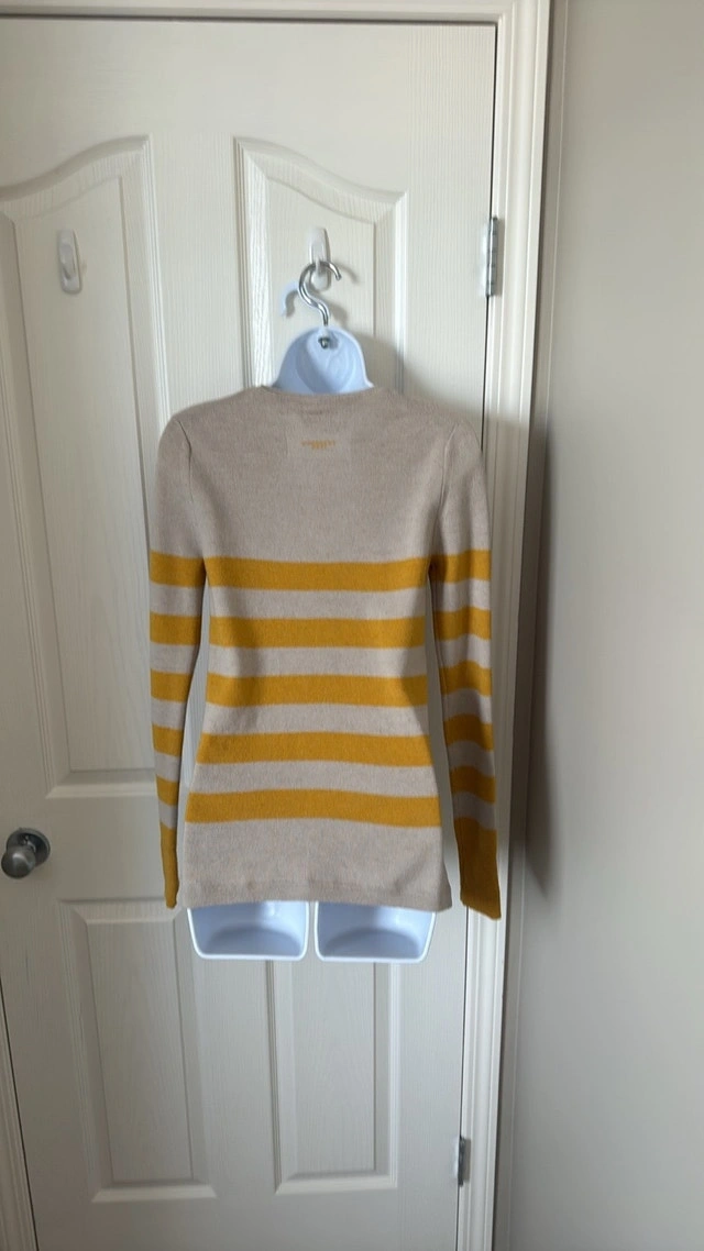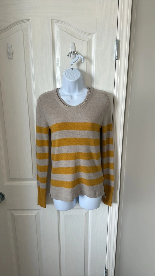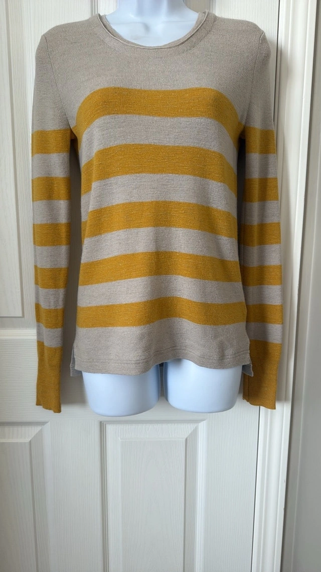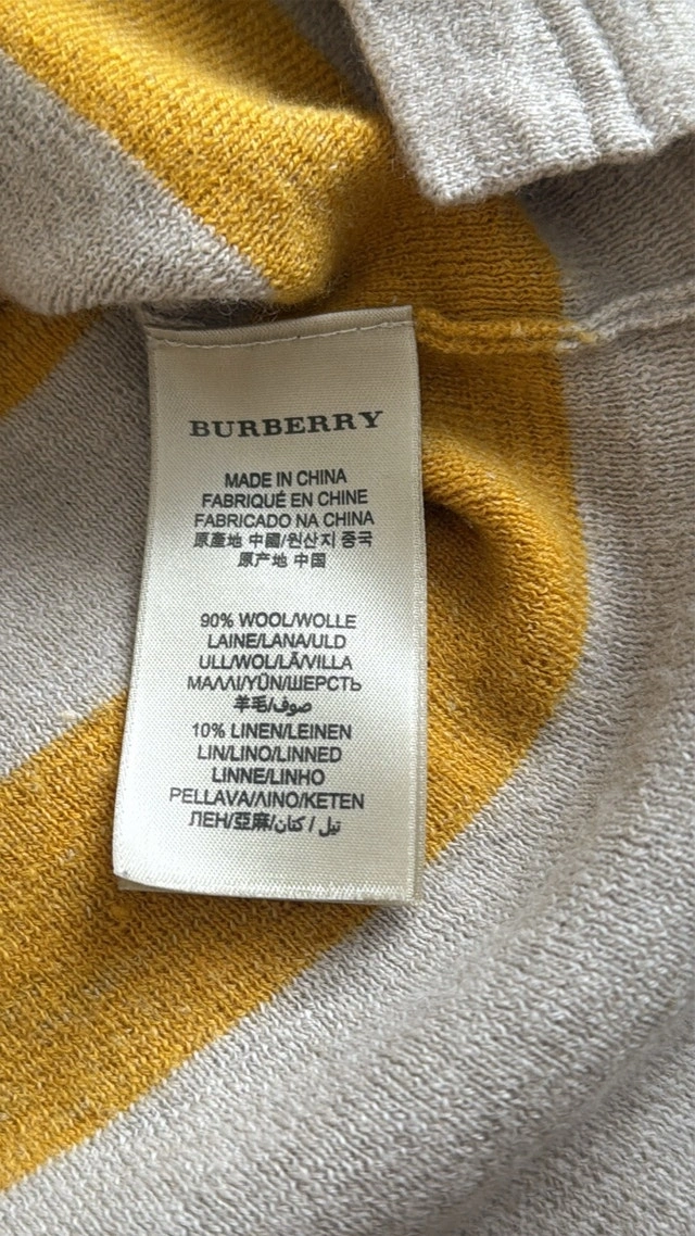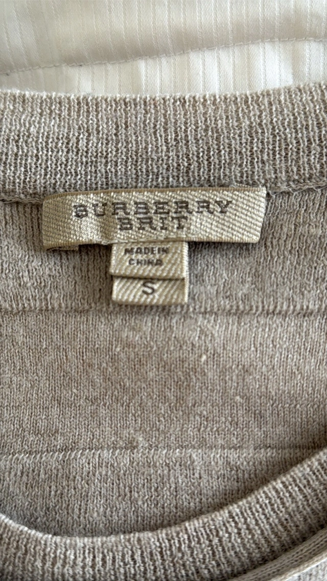 Burberry Brit Brenton striped sweater in excellent condition, hardly worn. Beige with mustard yellow stripes and small slits on the bottom sides. Size Small. Measurements: 16 inches pit to pit, 25 1/2 inches top to bottom. Smoke-free home. Pick up in Wolf Willow SE.