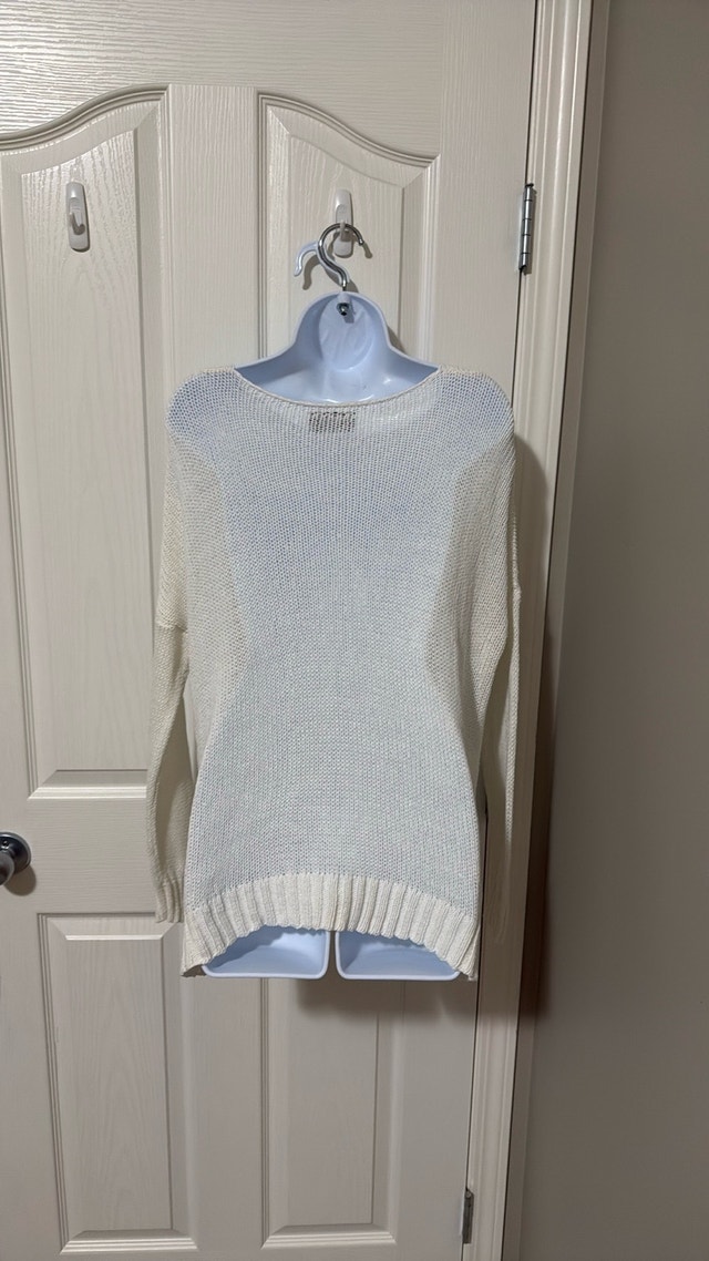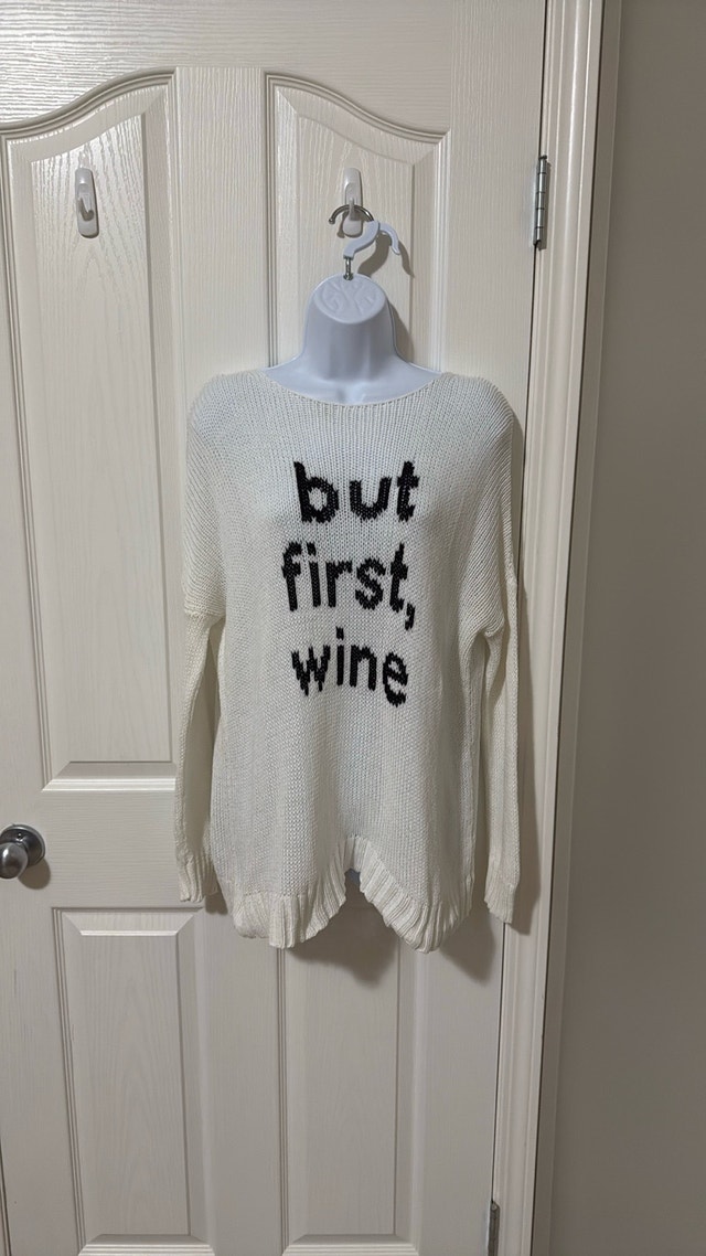 Wooden ships sweater “but first wine” Excellent Condition Worn only once Size Small Measurements: 23 inches pit to pit, 26 inches top to bottom Smoke free home Pick up in Wolf Willow SE