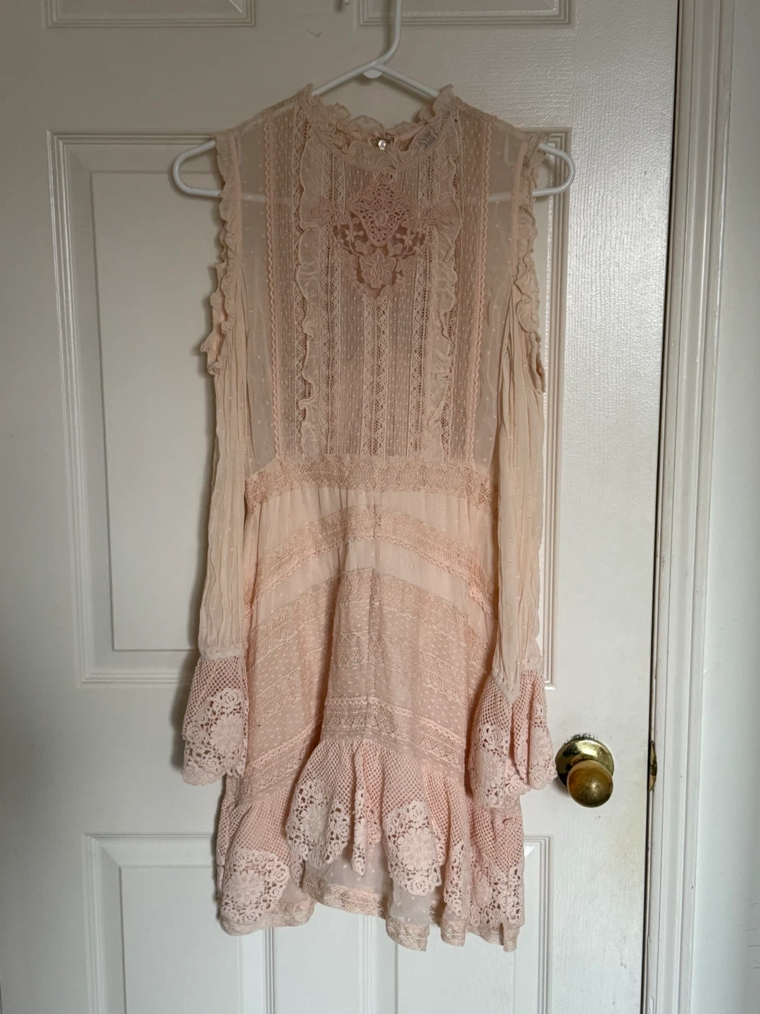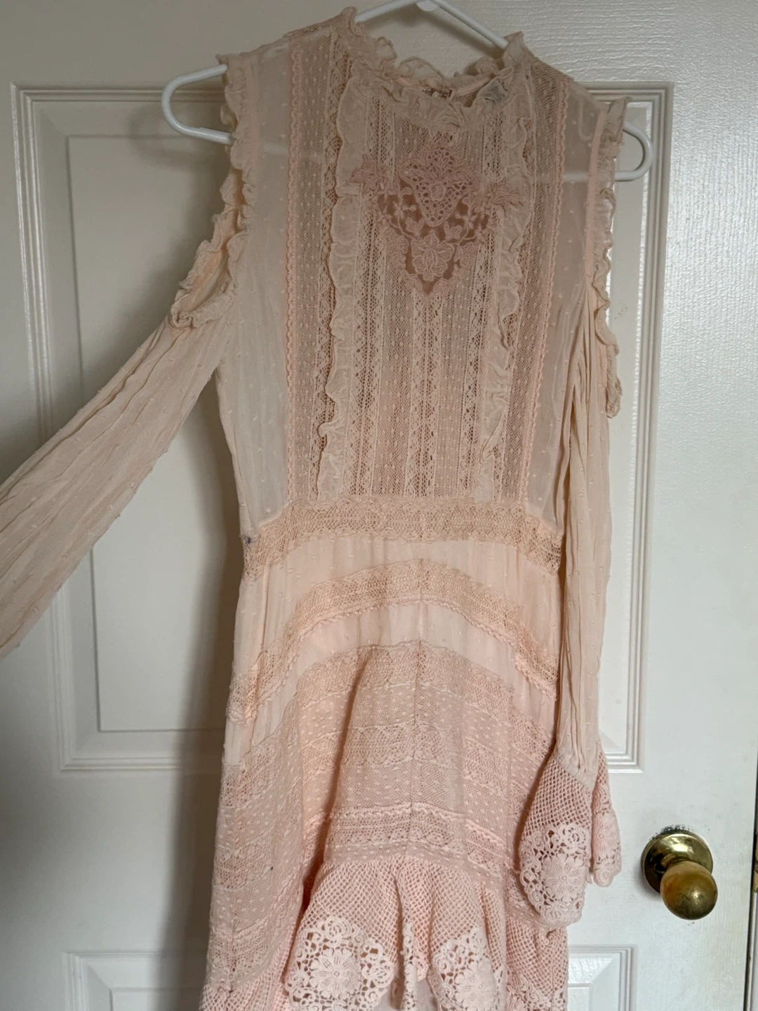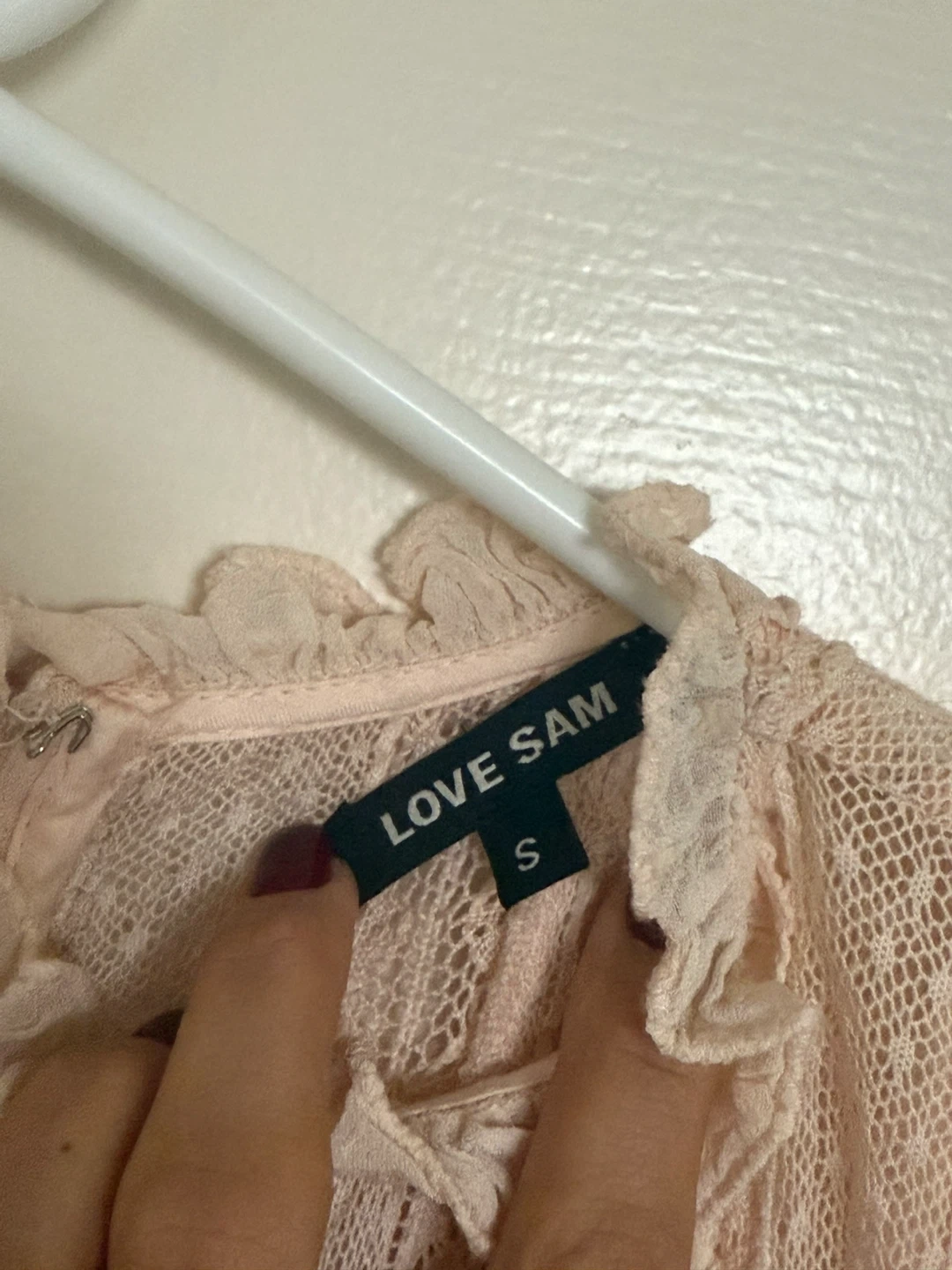 Selling a beautiful Love Sam lace dress in a delicate pink colour. It's a size small and features intricate lace detailing throughout. Perfect for a special occasion or a romantic evening out!