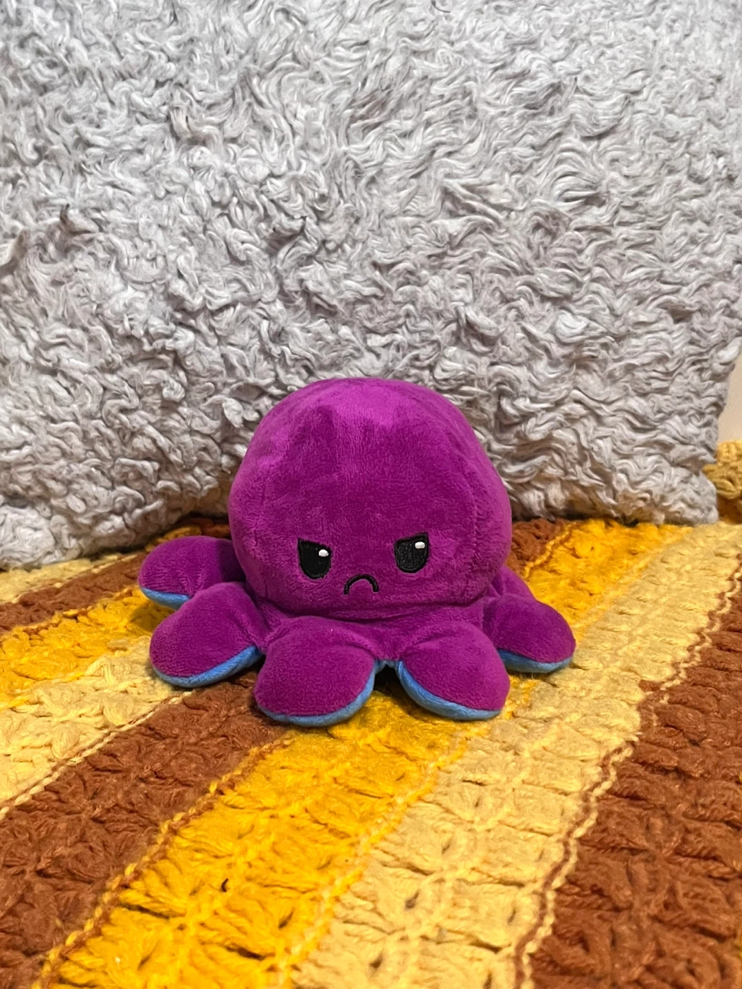 Super cute reversible octopus plushie! One side is blue with a happy face, and the other side is purple with a grumpy face. It's in great condition and ready for a new home!