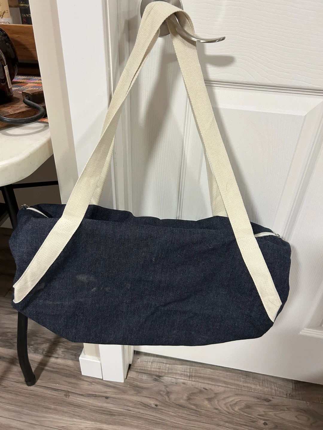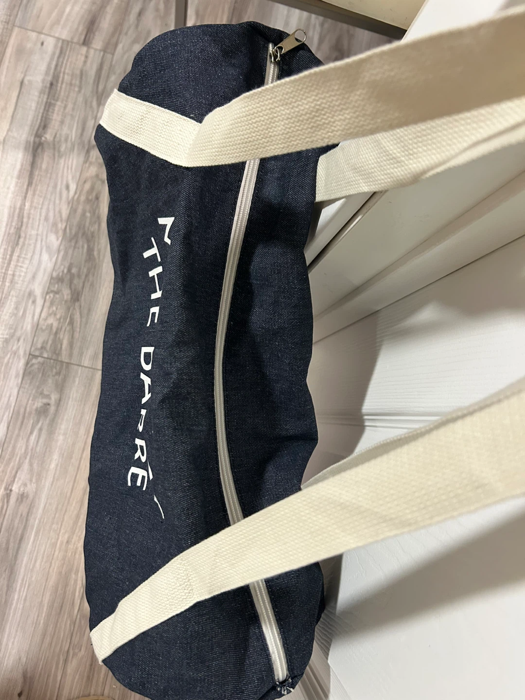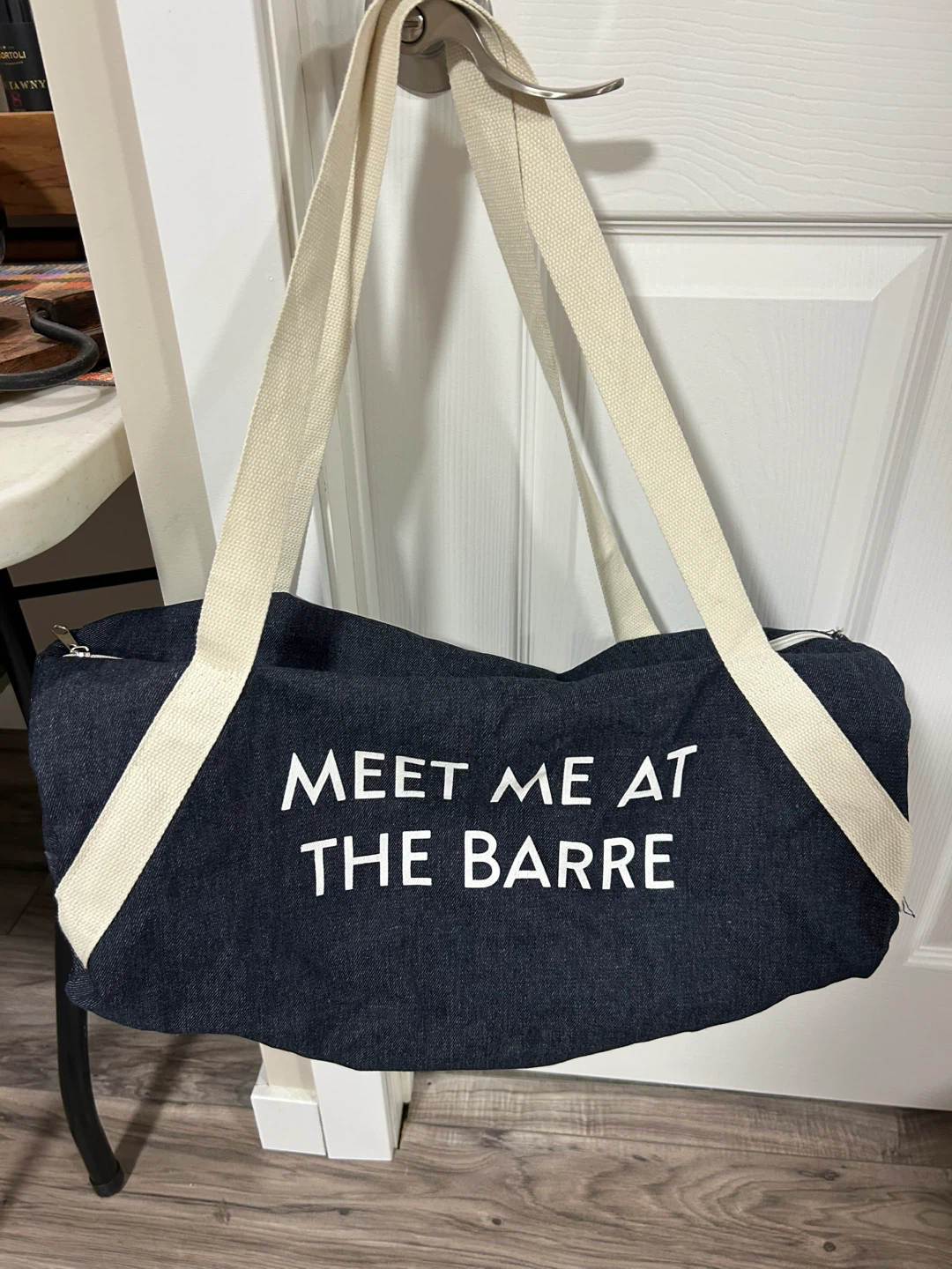 New Denim-look gym bag with the words "MEET ME AT THE BARRE" printed on the side. Perfect for carrying your workout gear to the studio or gym!