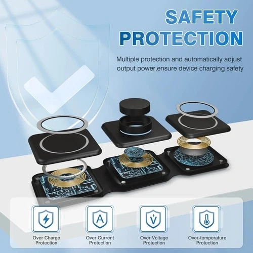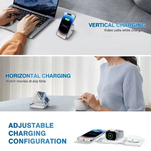 Upgrade your charging setup with this 3-in-1 Magnetic Wireless Charger — a flexible, foldable, fast-charging dock designed for all your Apple and Samsung devices. Perfect for home, travel, or office use. Key Features: 3-in-1 Fast Wireless Charging – Charge your iPhone, Apple Watch, and AirPods simultaneously. MagSafe Compatible – Strong magnetic alignment for secure and stable charging. Flexible & Foldable Design – Easily converts from flat pad to vertical stand; ideal for travel. Fast Charging Output – Supports 7W / 10W / 15W / 3W / 2.5W power delivery for multiple devices. USB-C Powered – Efficient, universal Type-C input for consistent performance. Lightweight & Portable – Compact design fits in bags, backpacks, and luggage. Universal Compatibility: iPhone (MagSafe Wireless Charging – 7W) iPhone 12 / 13 / 14 / 15 / 16 Series iPhone 8 / X / XR / XS / 11 Series Samsung Fast Wireless Charging – 10W / 15W Galaxy S8 / S9 / S10 / S20 / S21 / S22 / S23 Series Galaxy Note 8 / 9 / 10 / 20 Series AirPods (3W Wireless Charging) AirPods 2nd / 3rd Gen AirPods Pro / Pro 2 (with wireless/MagSafe case) Apple Watch (2.5W Wireless Charging) Apple Watch Series 2 to 9, SE, Ultra / Ultra 2 Package Includes: 1× 3-in-1 Magnetic Wireless Charging Station 1× USB-C Cable 1× User Guide Why Buyers Love It: One charger for all devices Great for travel Strong magnetic hold Reduces cable clutter Fast, safe, and efficient charging