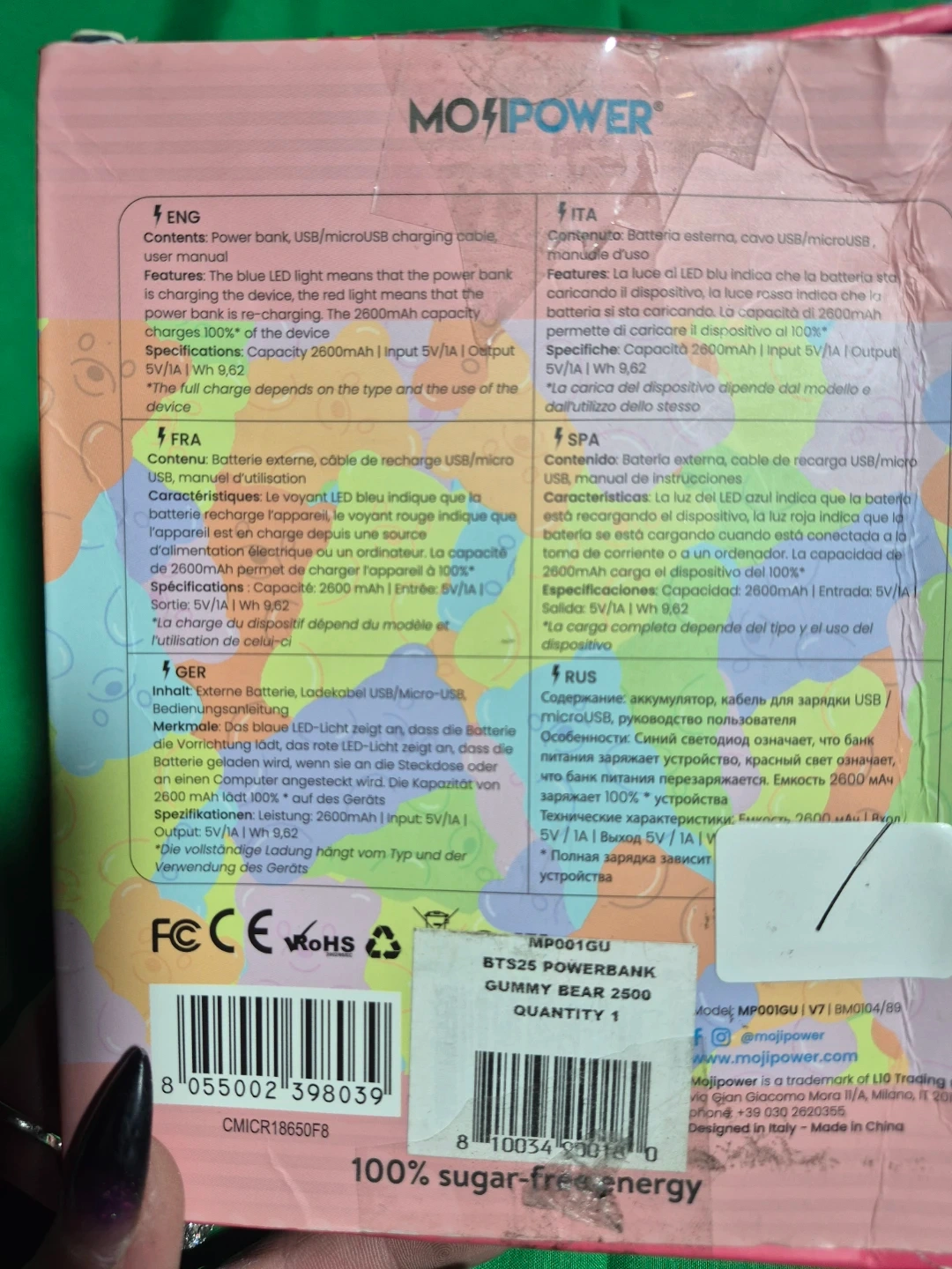 Keep your phone charged on the go with this adorable Moshi Power Gummy Bear power bank! This cute power bank features a 2600mAh capacity and is compatible with both iPhone and Android devices. The blue LED light indicates the power bank is charging the device. Includes a USB/microUSB charging cable and user manual. Comes in the original box!