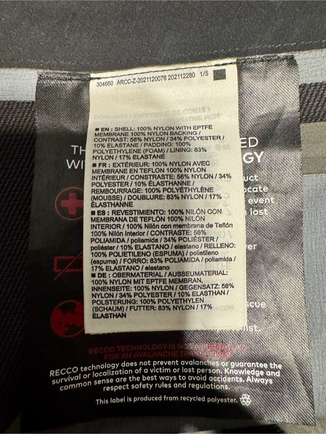 on the bottom part of the pants. Light knee pad protection.They are equipped with RECCO technology. The shell is 100% nylon with an ePTFE membrane, and the contrast is 56% nylon, 34% polyester, and 10% elastane. The lining is 83% nylon and 17% elastane. Goretex Infinium. Good condition.. Cash only and for pick up at 4 Golfinch court north york
