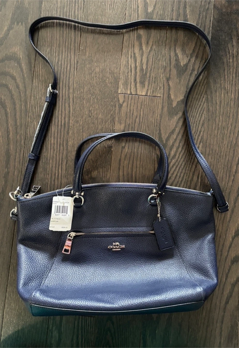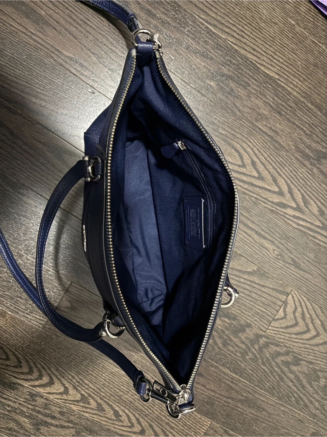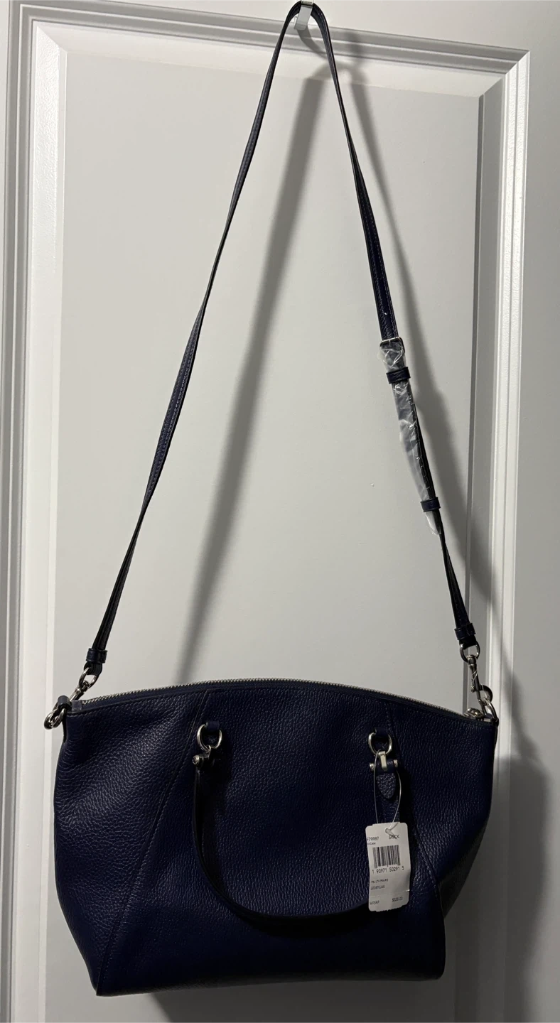 Brand New Beautiful Coach navy blue leather satchel. Features two top handles and a long shoulder strap. Zip closure. Interior zip pocket. New with tags.