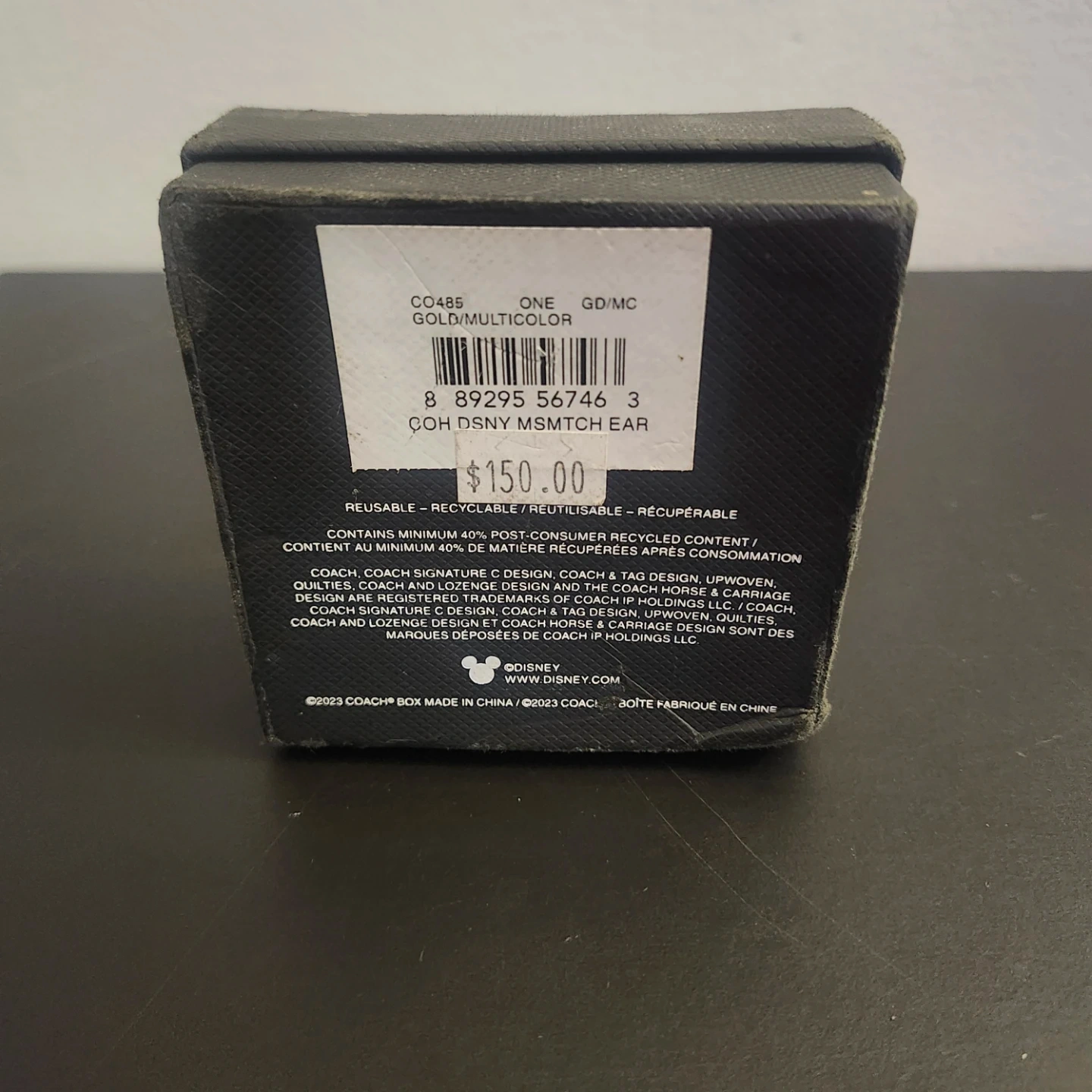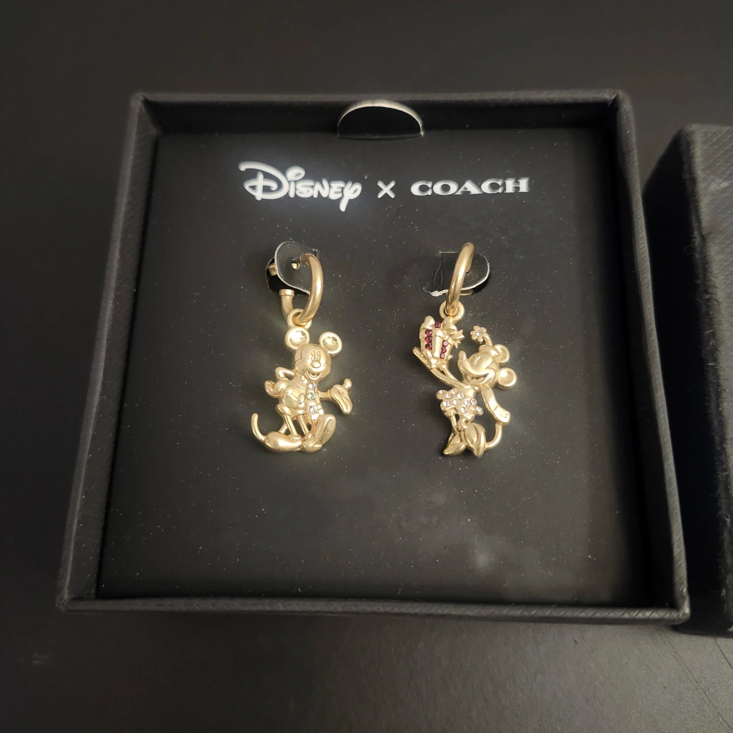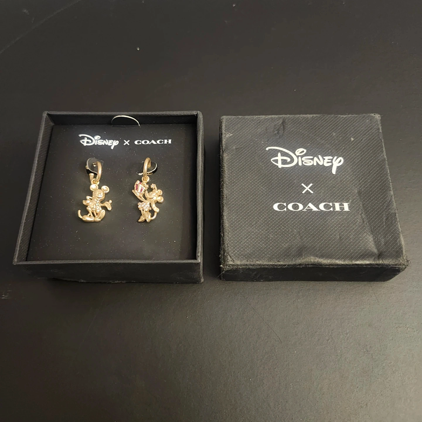 Disney x Coach gold-coloured Mickey, and Minnie Mouse mismatched earrings in their original box. Outside of box has some minor damage (as seen in the photo), but the earrings are in perfect condition. Originally bought for $150. Lowest price found online goes for $90. Willing to let them go for $60.