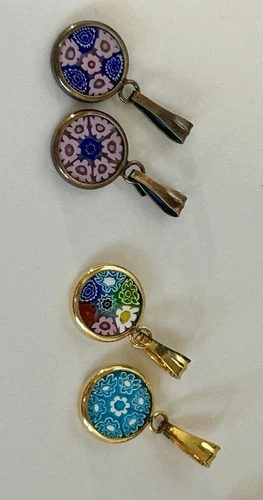 This 6-piece lot includes 4 lovely Millefiori Le Murrine Veneziane pendants, a stunning Murano glass Millefiori bracelet, and a Sterling Silver & Glass Millefiori Cross. Each piece is handmade showcasing the intricate craftsmanship of the artisans in Italy. The multicolor designs of the pendants and the bracelet are sure to add a pop of color to any outfit and the glass millefiori cross pendant adds a touch of elegance. This vintage collection is perfect for collectors or anyone looking for unique glass statement pieces. Made in Murano Italy this fine jewelry lot is a valuable addition to any collection.