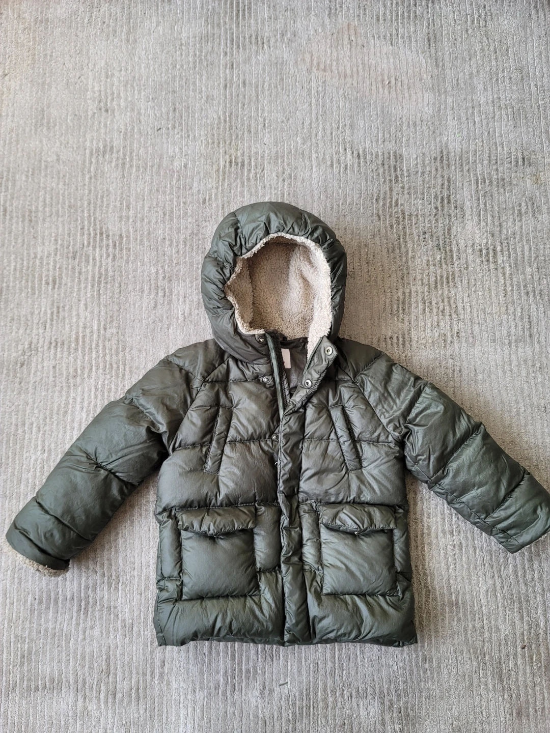 I'm selling an Il Gufo puffer jacket in size 24M. It's a stylish olive green color and features a cozy sherpa-lined hood. Perfect for keeping your little one warm this winter!