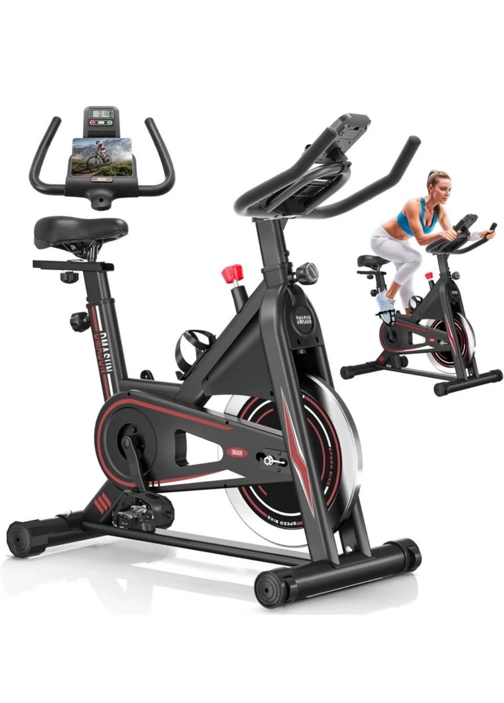 Get your sweat on with this DMASUN indoor exercise bike! It's perfect for home workouts and getting your cardio in. The bike is black with red accents. I literally bought this then needed to move and I have no space it. Probably used twice.