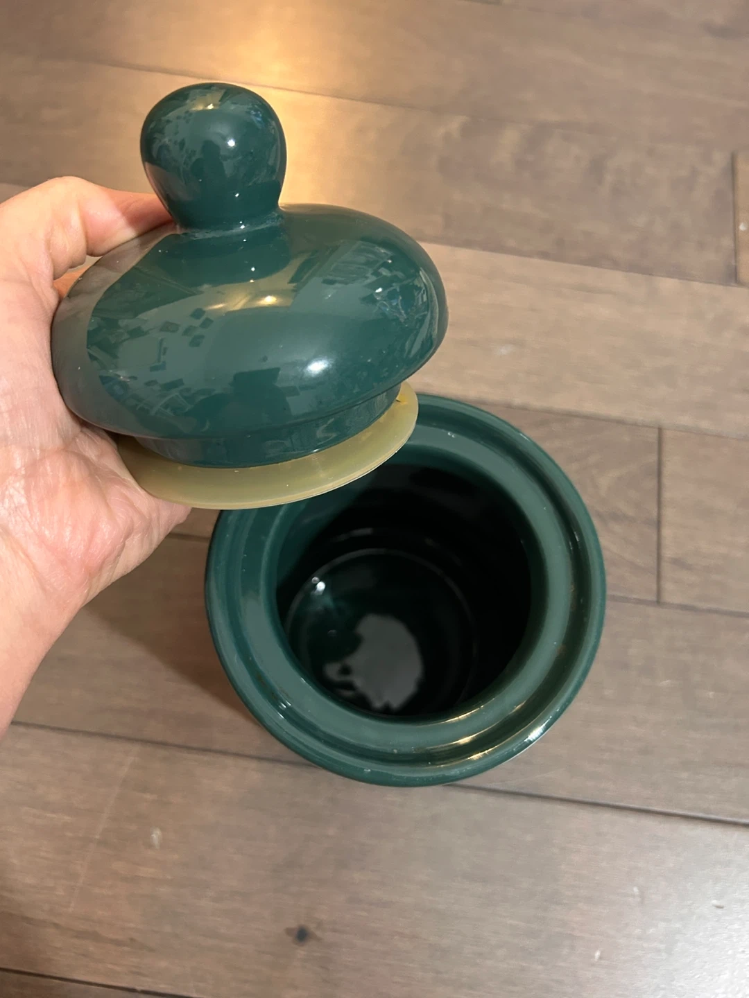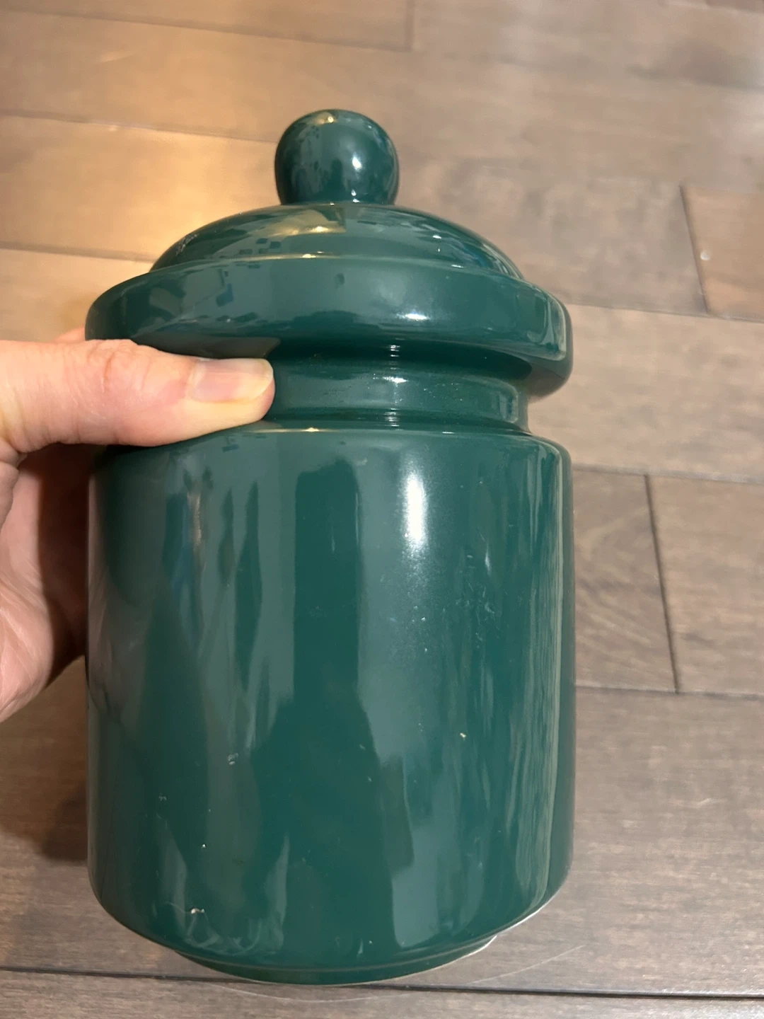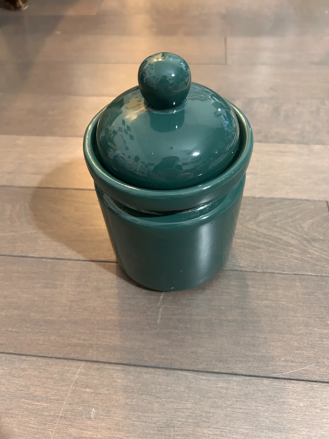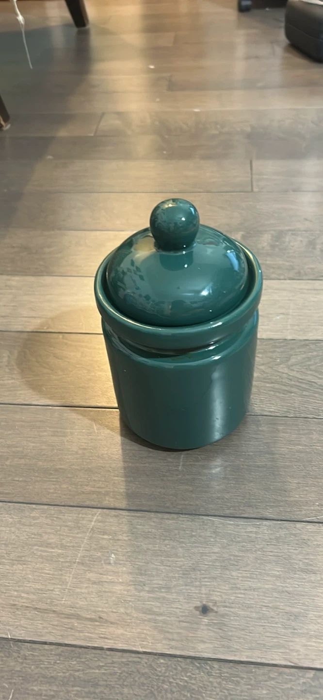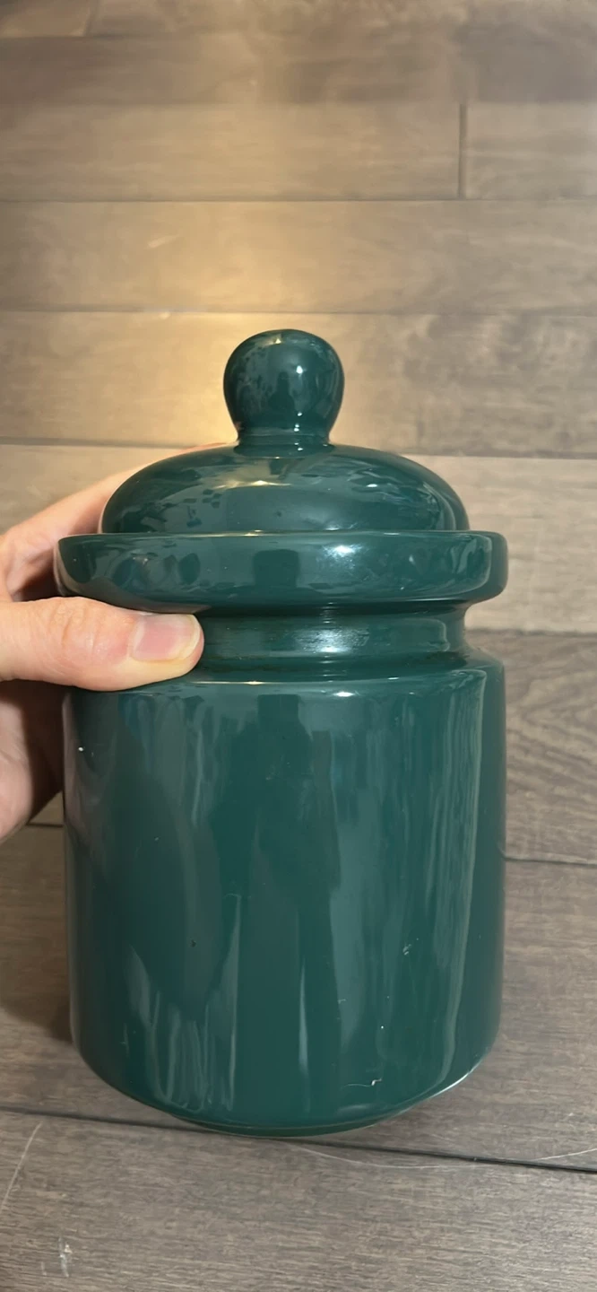 Here's a nice green ceramic jar with a lid. It's in great condition and would be perfect for storing small items or adding a touch of colour to your kitchen