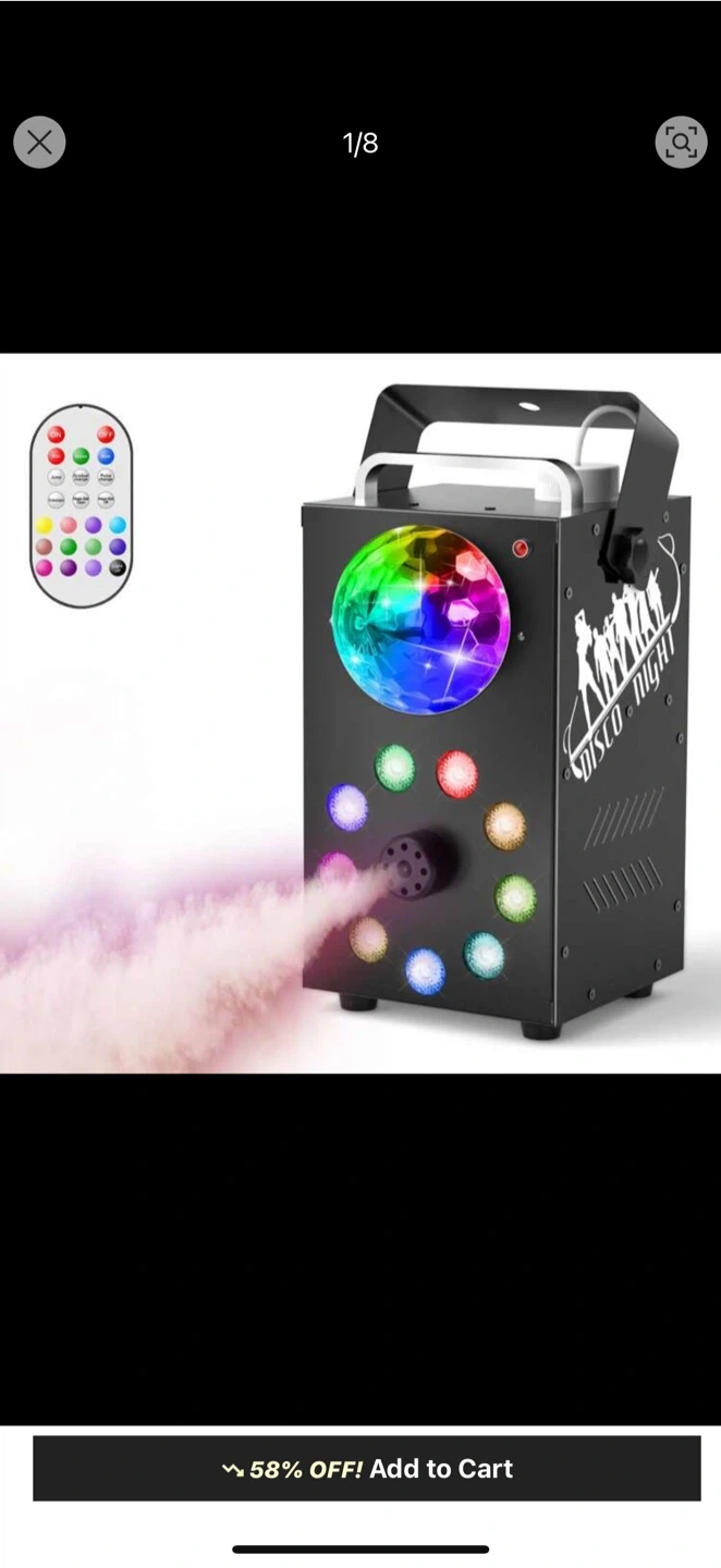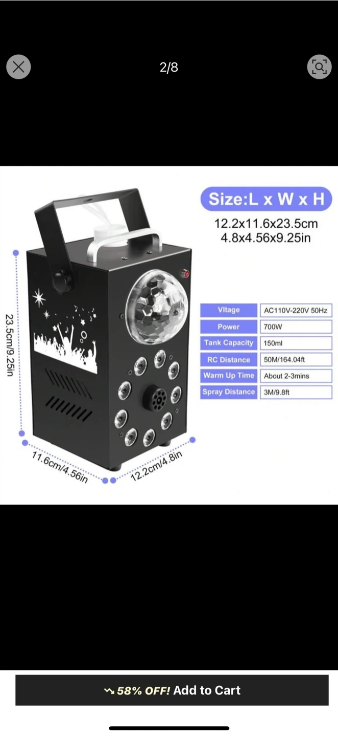 Selling a Disco Night fog machine! It measures 12.2 x 11.6 x 23.5 cm (4.8 x 4.56 x 9.25 inches). It has a power of 700W, a tank capacity of 150ml, and an RC distance of 50M/164.04ft. It warms up in about 2-3 minutes and has a spray distance of 3M/9.8ft