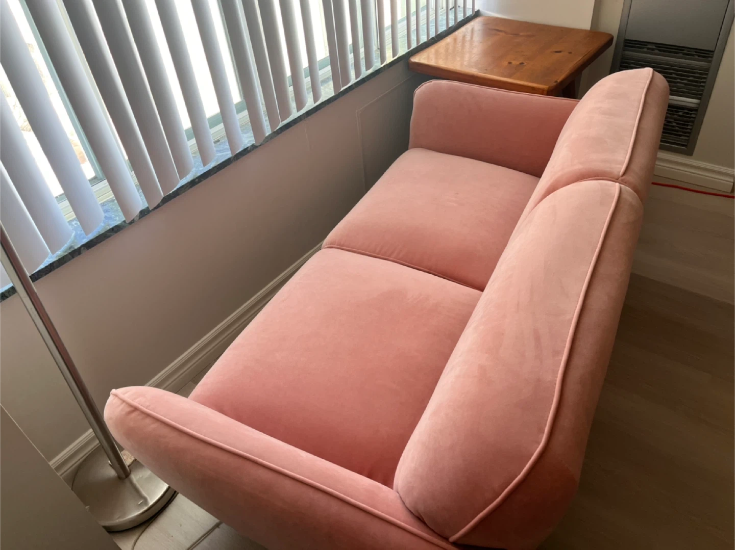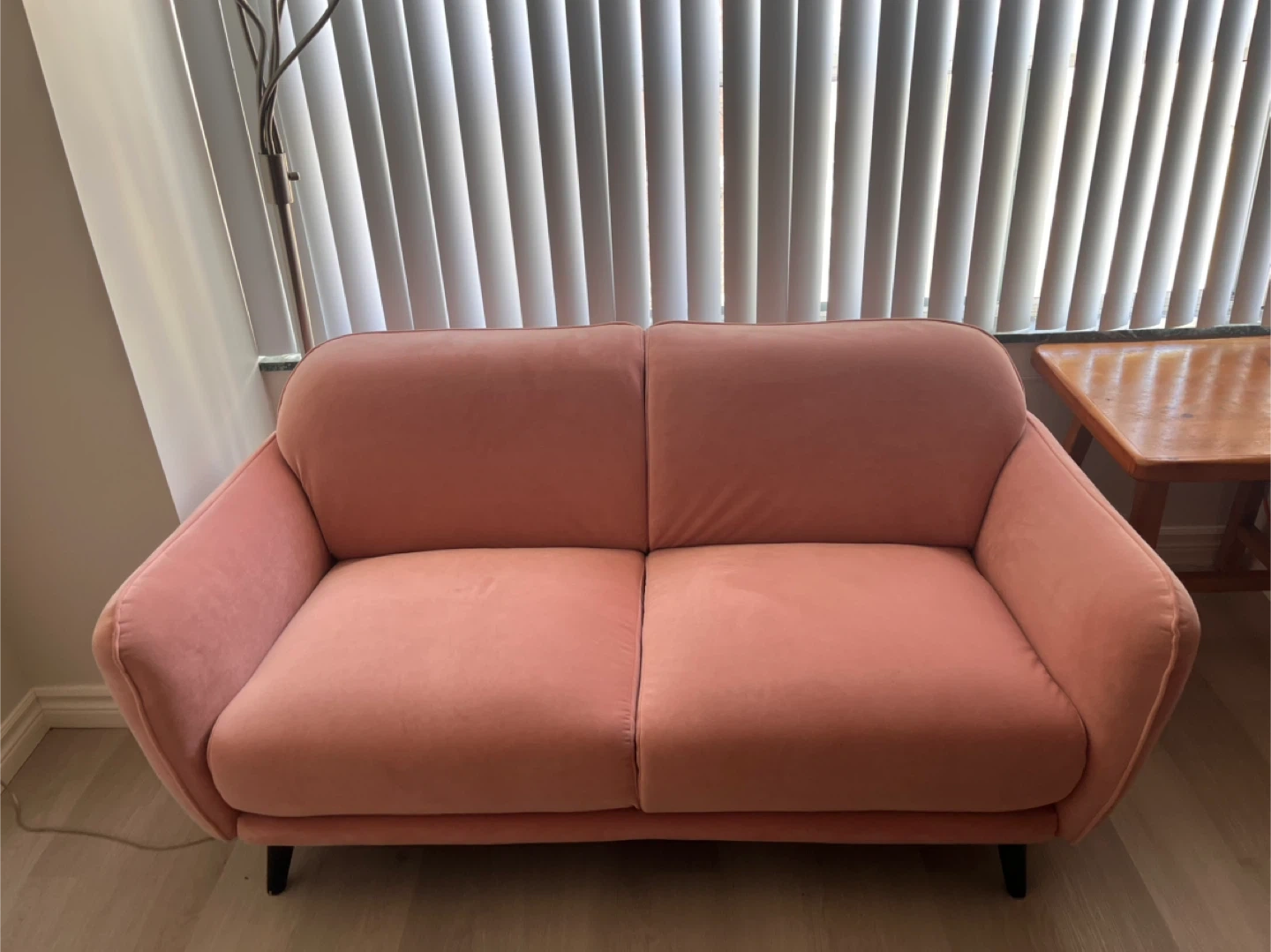 Selling a cute pink loveseat! It's in great condition and would be perfect for a smaller space. The colour is a really nice soft pink, and the material feels like a velvet. It has short black legs. Please message me if you're interested!