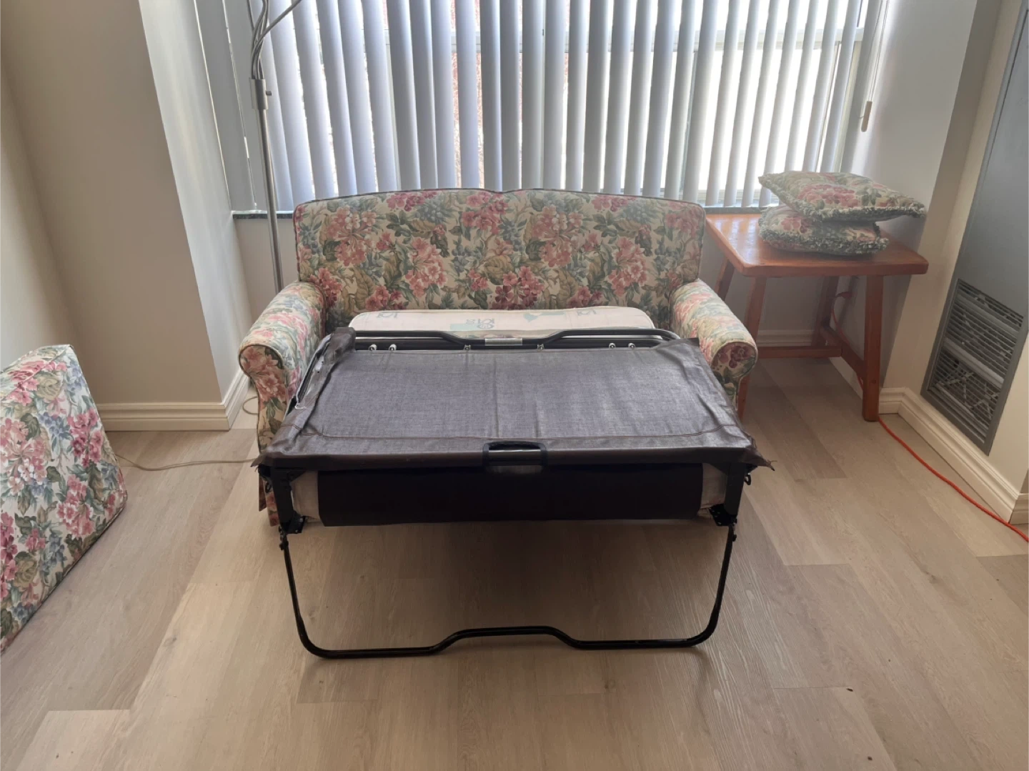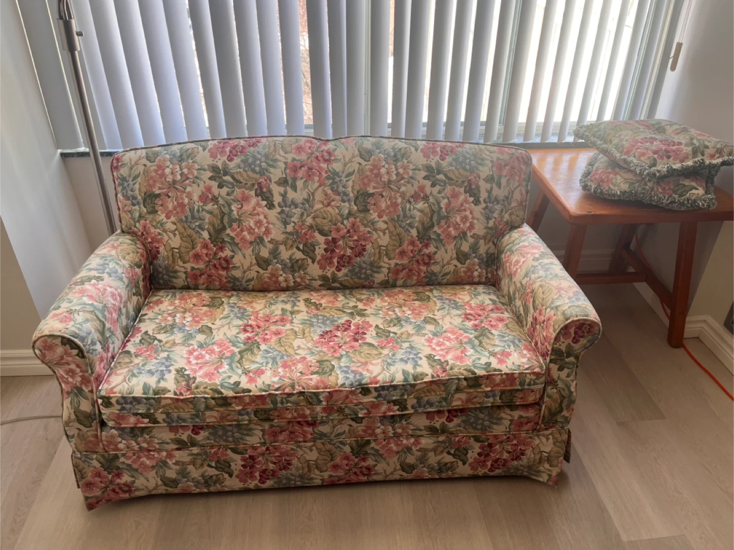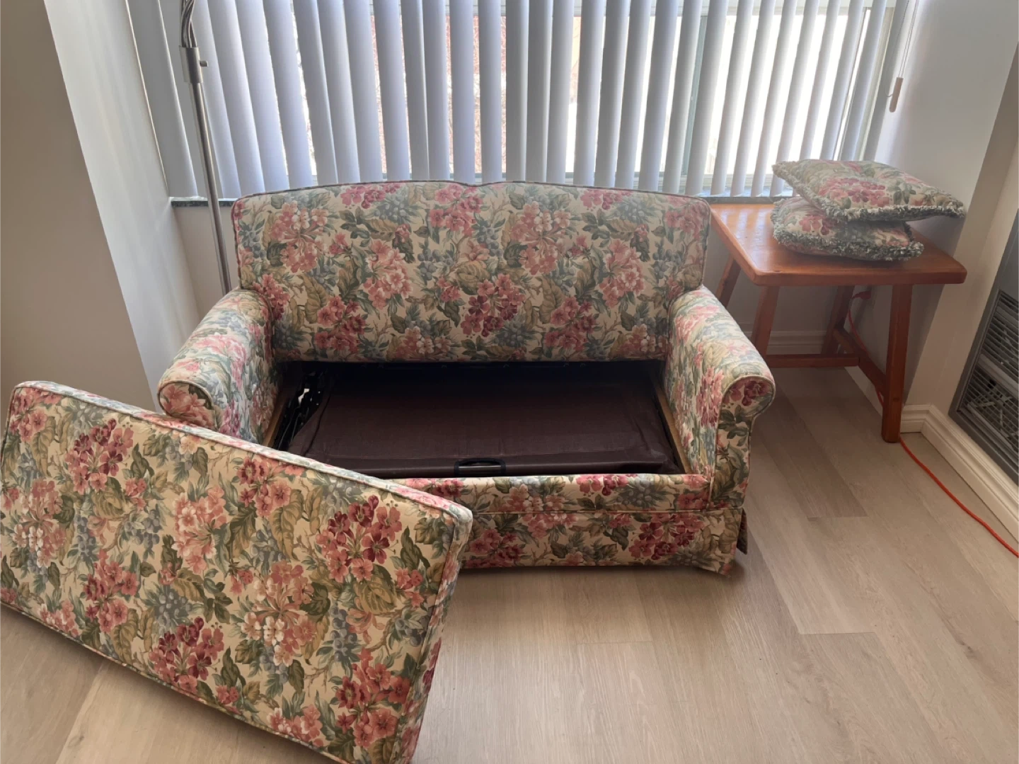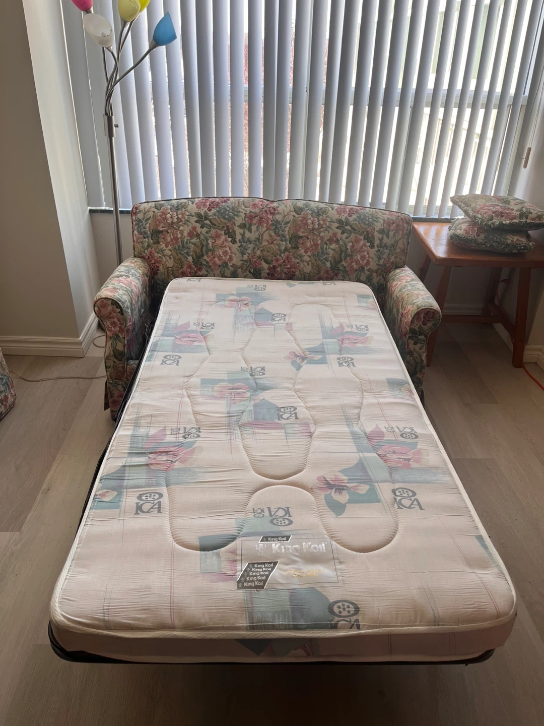 Comfy floral sofa bed in great condition! Perfect for a guest room or small space. It easily converts into a bed for extra sleeping space. Comes with matching floral cushions to complete the look!