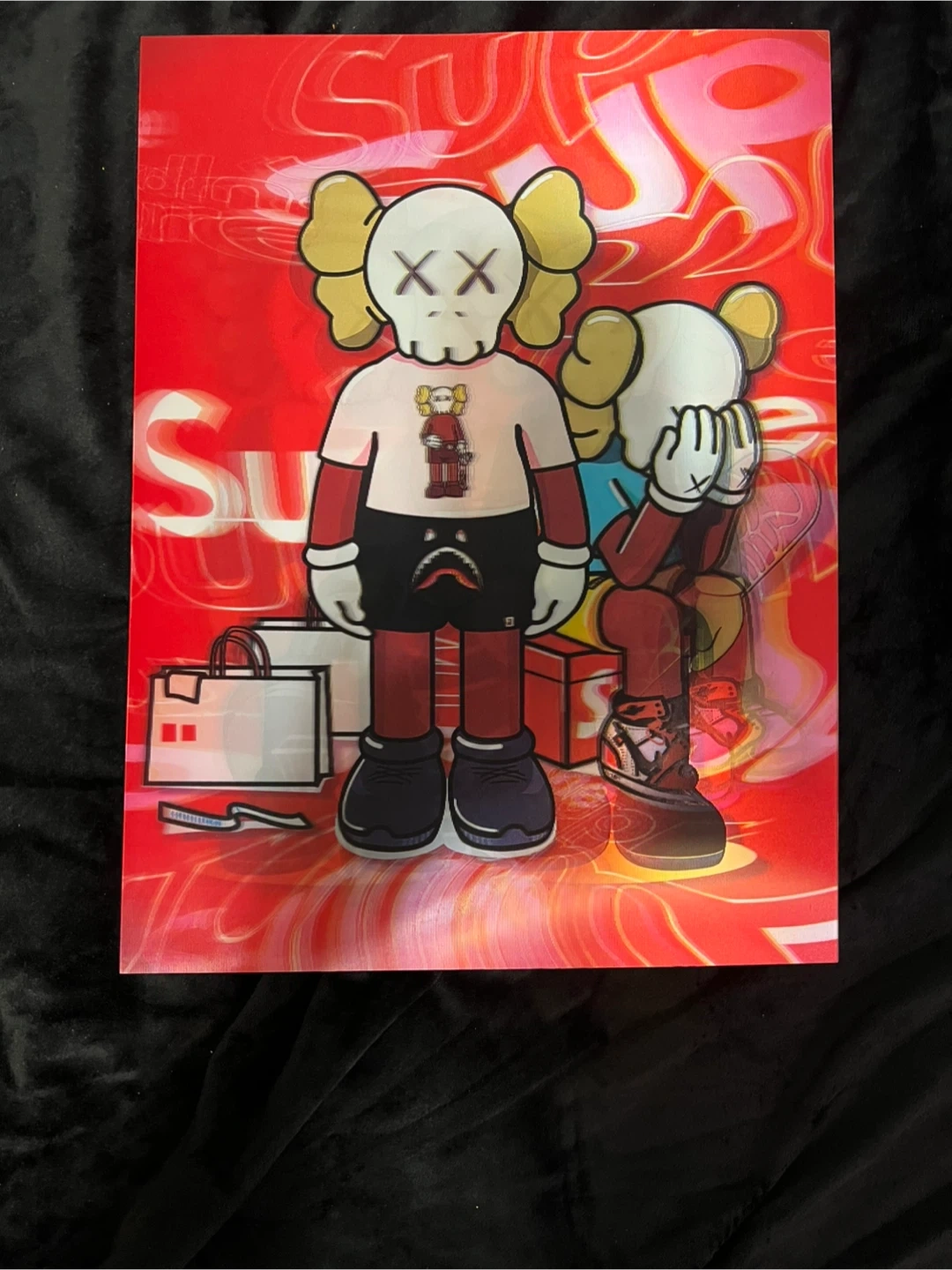 Selling a Supreme KAWS Chum skateboard deck 3D poster. The deck features a red background with a KAWS Chum character design. Great for collectors or skaters!