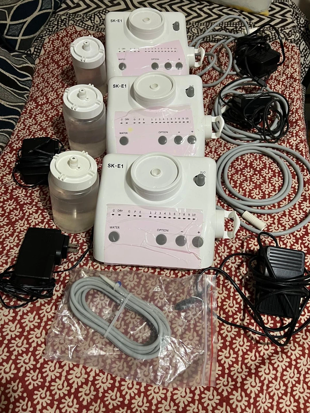 Selling a SK-E1 ultrasonic machine for dental in good condition. It comes with the water bottles, power supply, foot pedal, and hose as pictured , no tips…