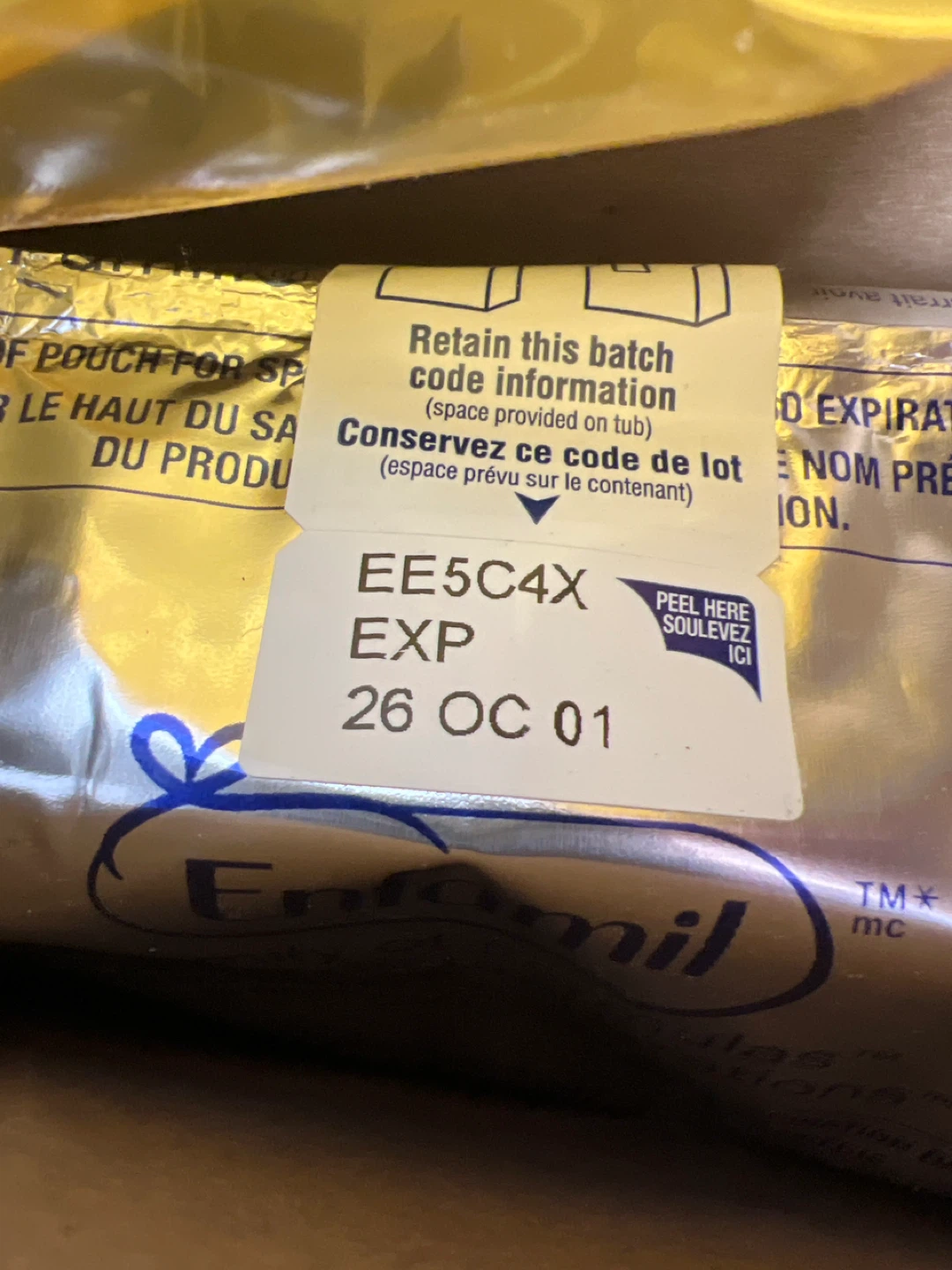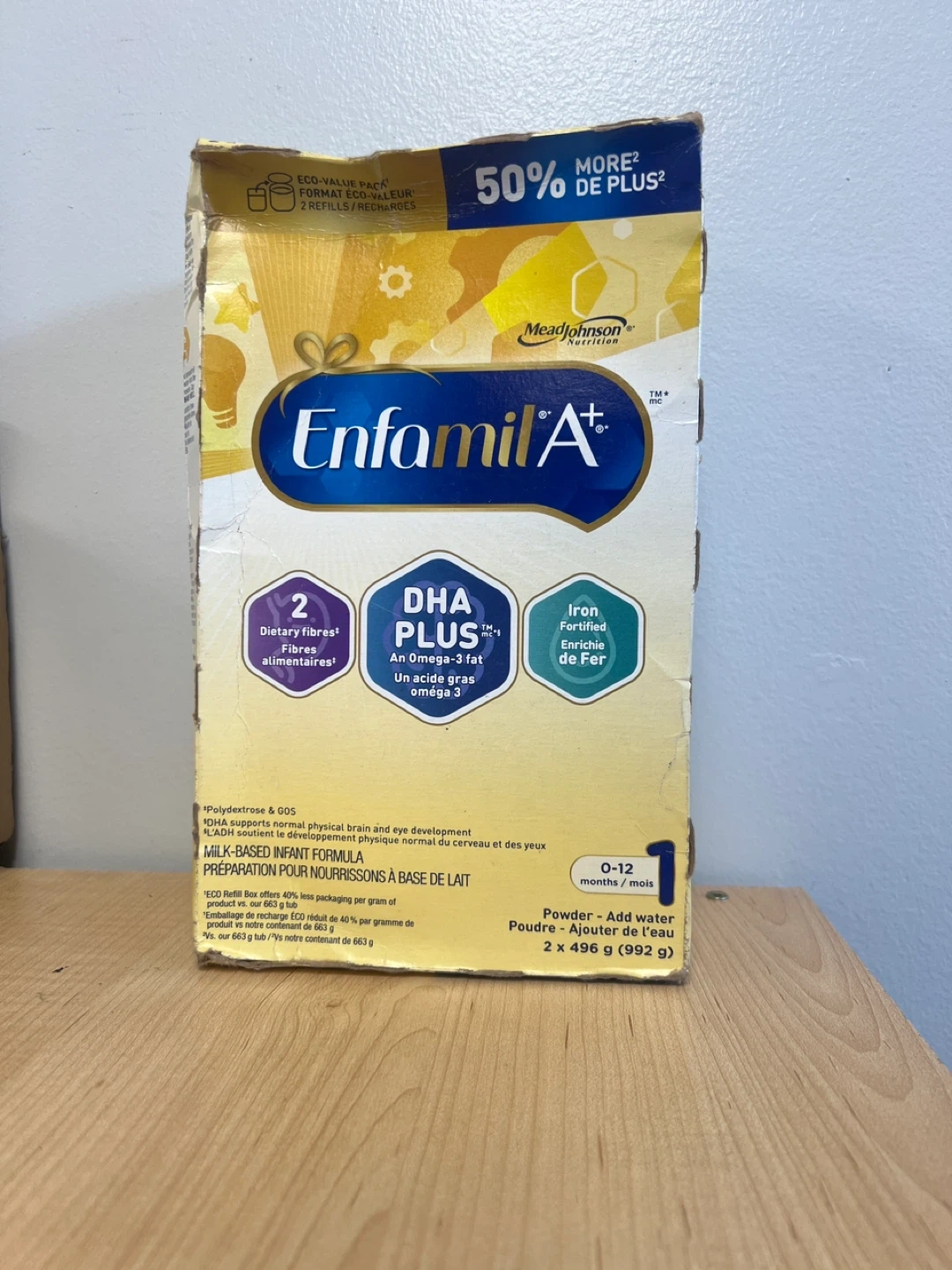 Selling a box of Enfamil A+ infant formula, suitable for babies aged 0-12 months. It contains dietary fibres and DHA PLUS, an omega-3 fat, and is iron-fortified. The box includes 2 x 496 g tubs. Please note that the expiration date is October 26, 2001