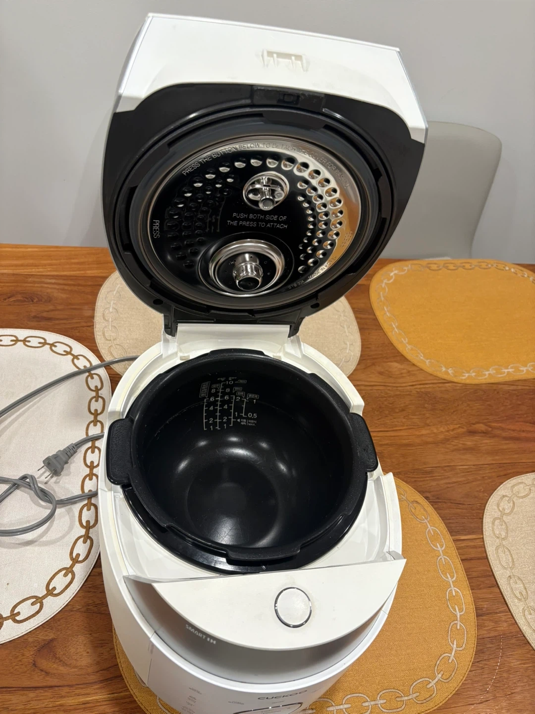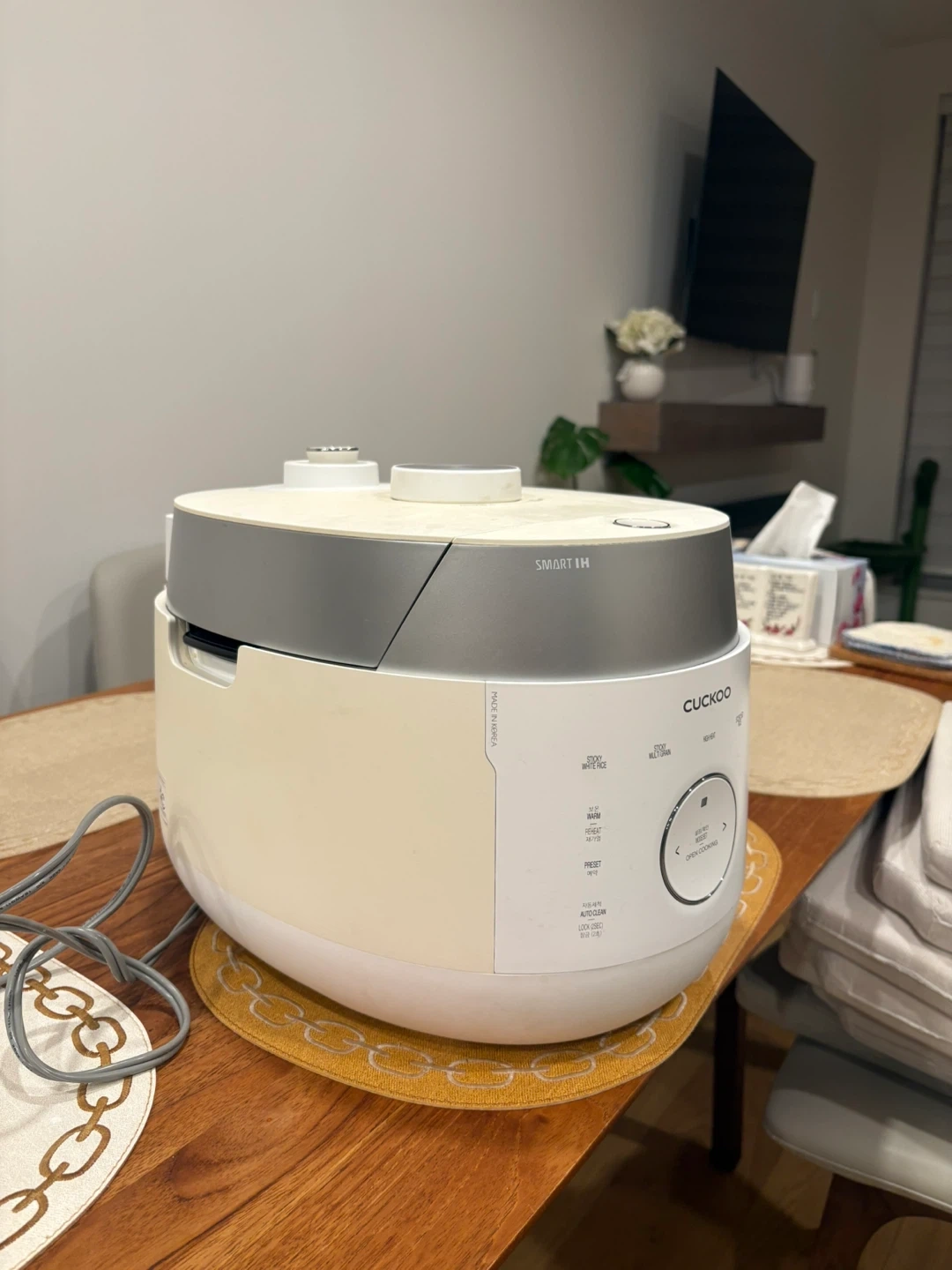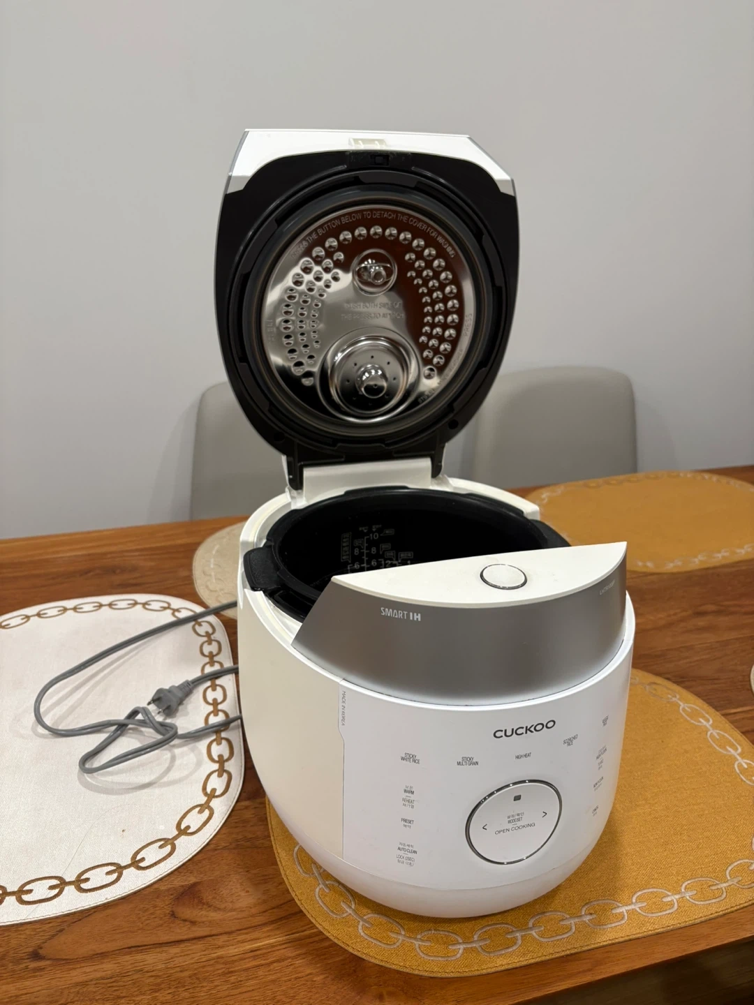 Selling a Cuckoo Smart IH rice cooker, model LHTR1006F. It's in great condition and ready to cook up some delicious rice! It has various cooking modes including cook, multi-grain, high heat, scorched rice, and porridge. It also has a preset function and auto-clean function for easy maintenance