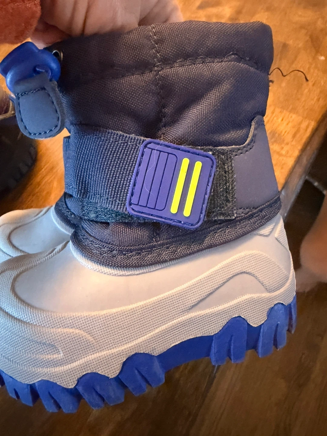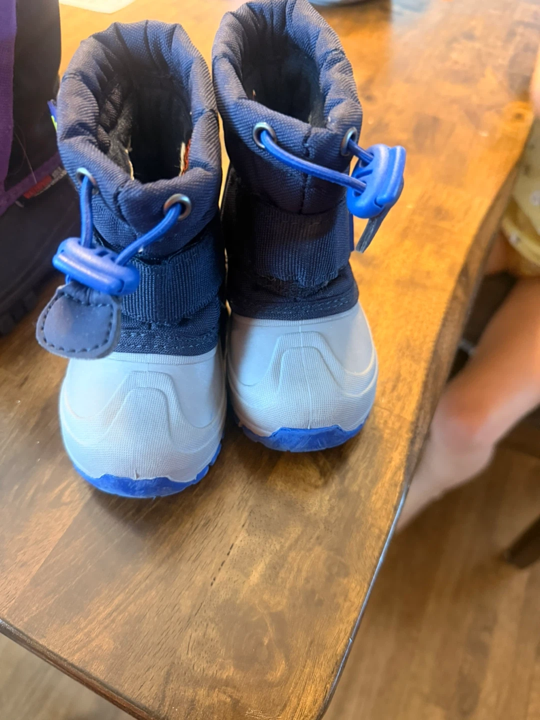 These navy blue winter boots are in great shape and ready for some snowy adventures! They're a size 4 and feature a convenient pull-on style with a secure strap. The soles have good traction, perfect for keeping little feet steady on slippery surfaces