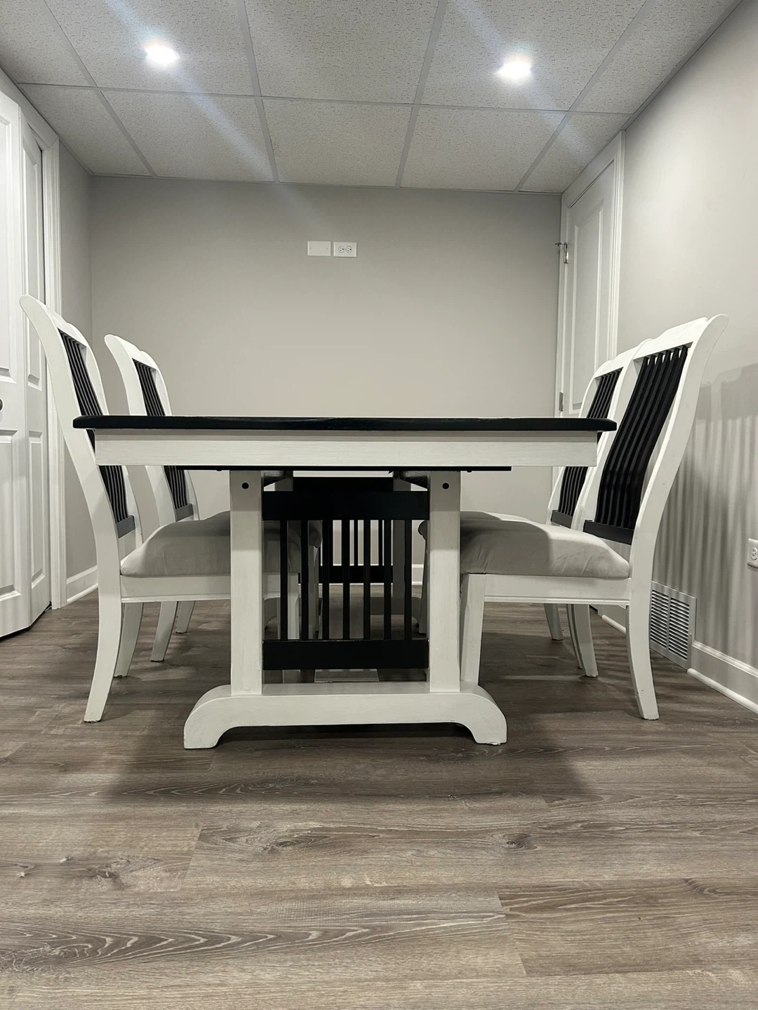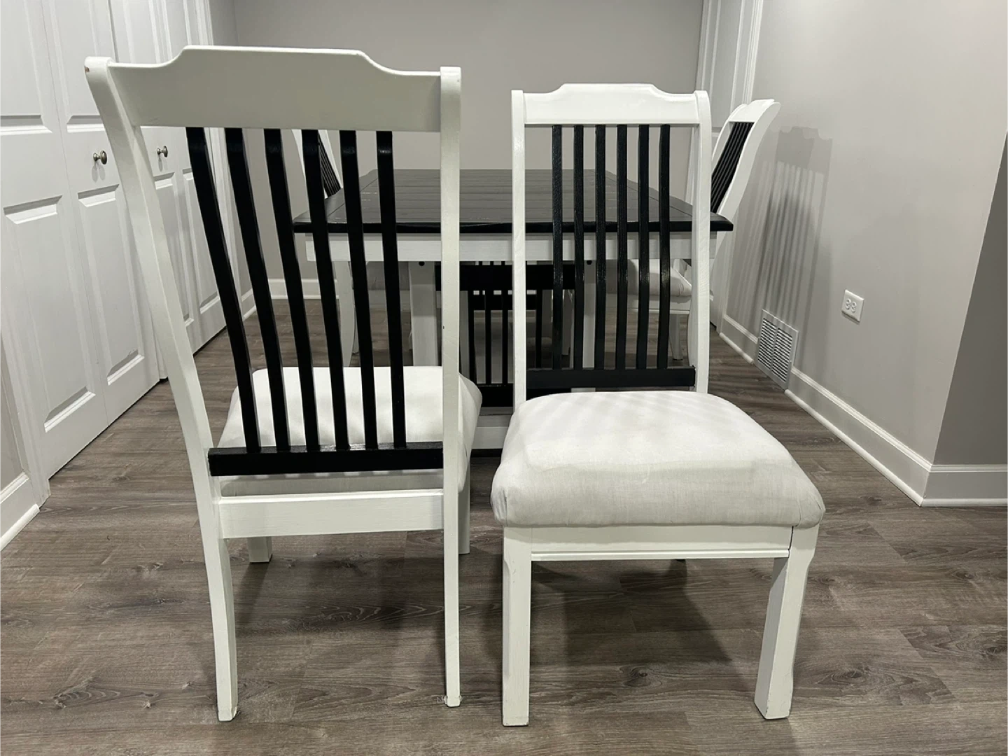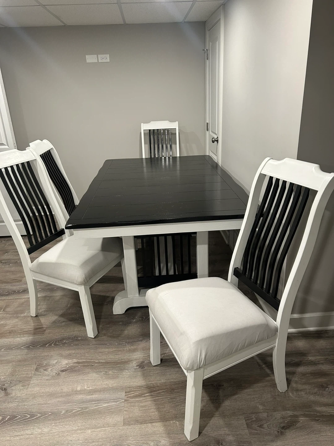 Selling a dining table with four chairs! The table features a black top and a white base. The chairs are white with black accents on the backrests and light gray cushions. Perfect for holiday dinners. Some minor scratches on the table as shown in a close-up in the last picture. Overall amazing table and very solid and sturdy. Pick-up location is far NW Chicago near O'Hare airport.