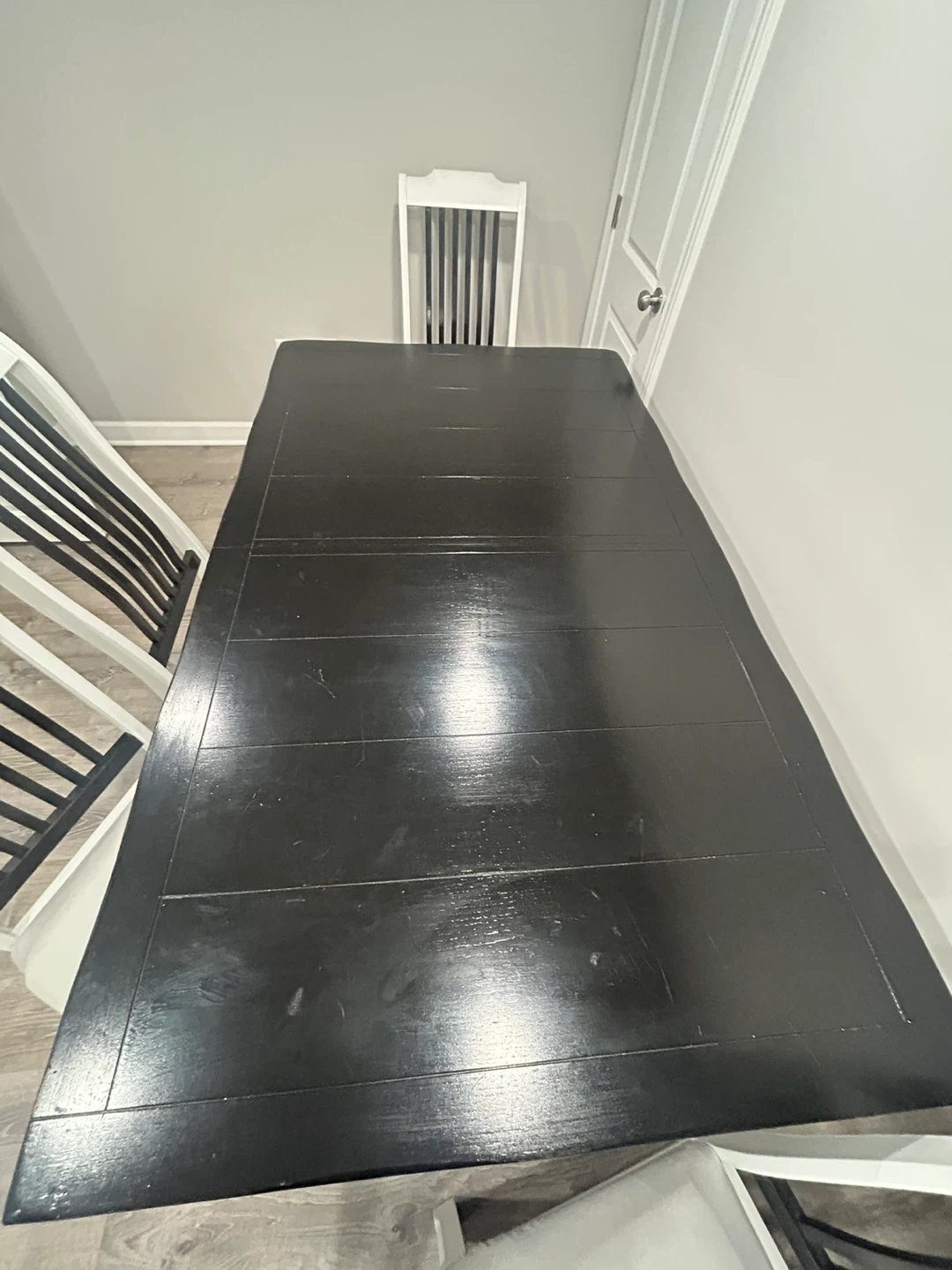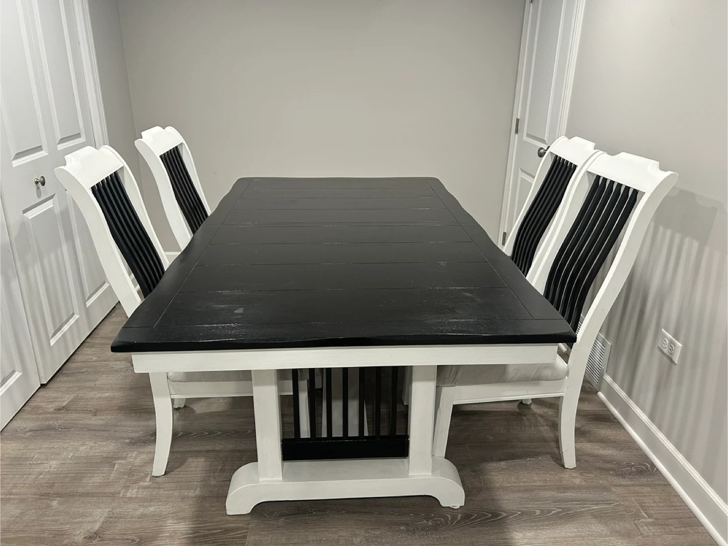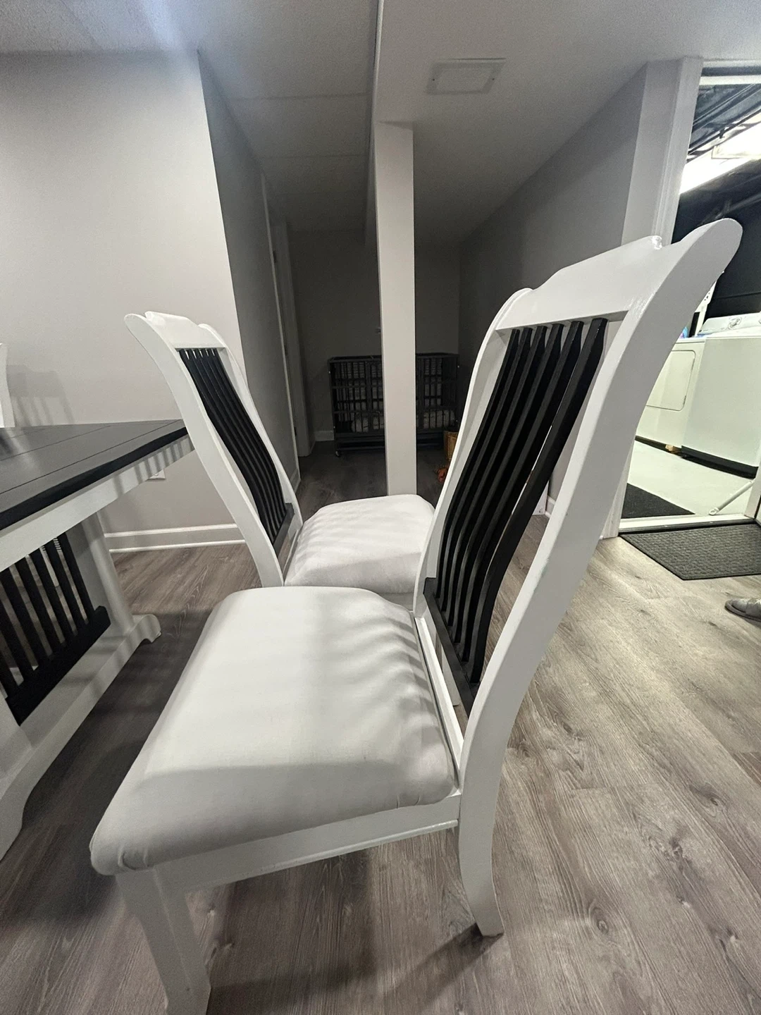 Selling a dining table with four chairs! The table features a black top and a white base. The chairs are white with black accents on the backrests and light gray cushions. Perfect for holiday dinners. Some minor scratches on the table as shown in a close-up in the last picture. Overall amazing table and very solid and sturdy. Pick-up location is far NW Chicago near O'Hare airport.
