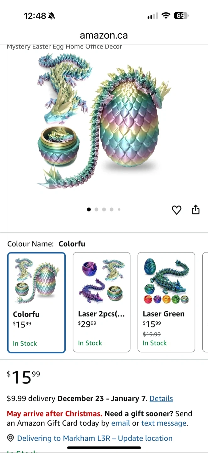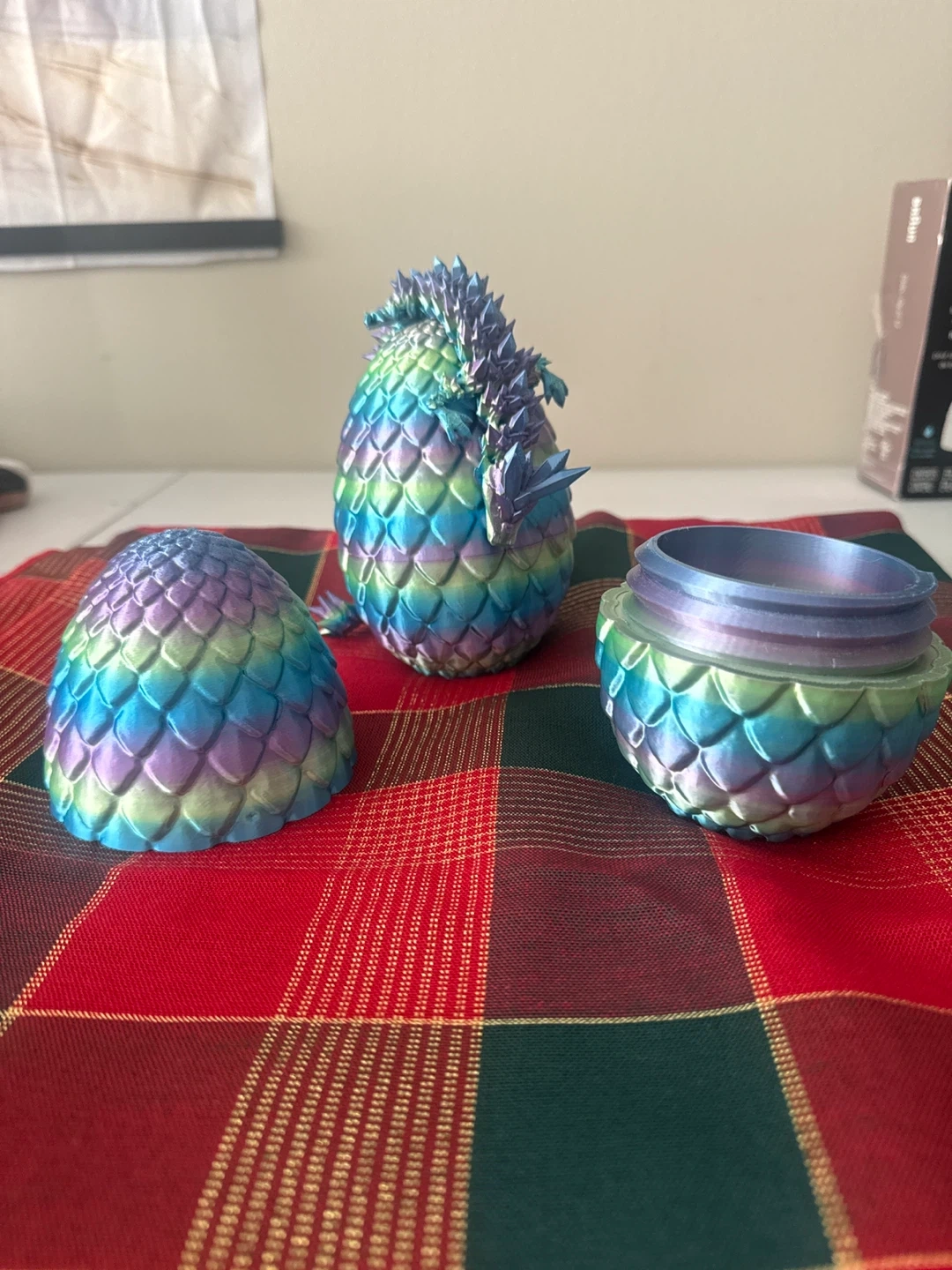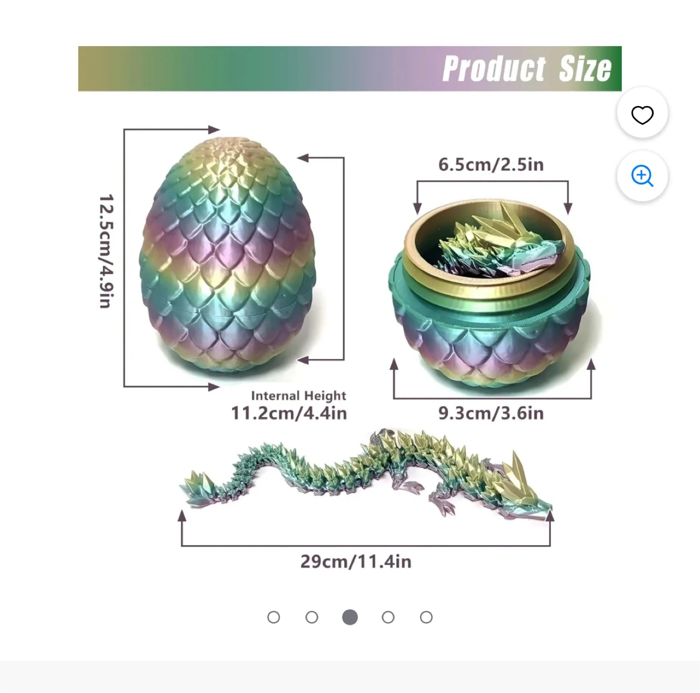 This is a colourful mystery egg home office decor. It is a 3D printed dragon inside of an egg. The egg is 12.5cm/4.9 inches in height. The dragon is 29cm/11.4 inches in length,Dragon means powerful and lucky ,good gift