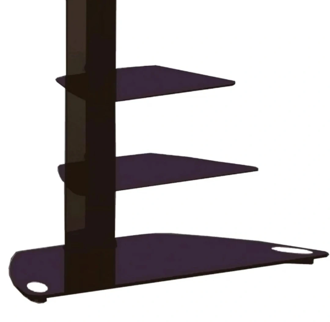 This is a stylish black glass TV stand featuring three shelves. It's perfect for organizing your entertainment system and adding a touch of modern elegance to your living room.