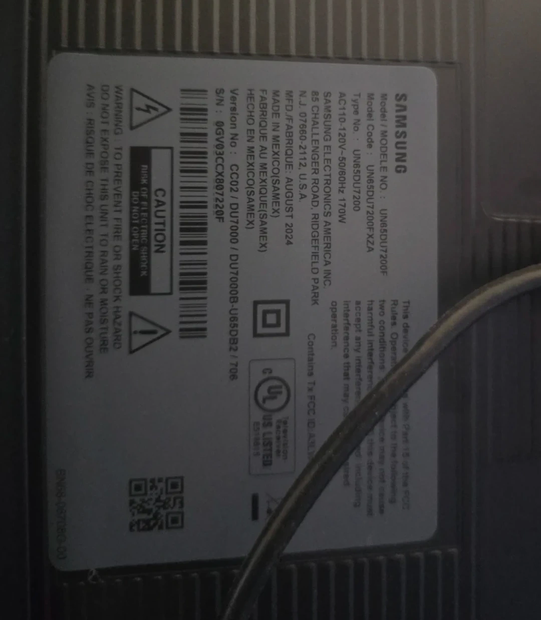 Samsung 65 inch smart TV. Model UN65DU7200F. Manufactured August 2024. 170W, 120V-50/60Hz AC. This TV is great for any living room!