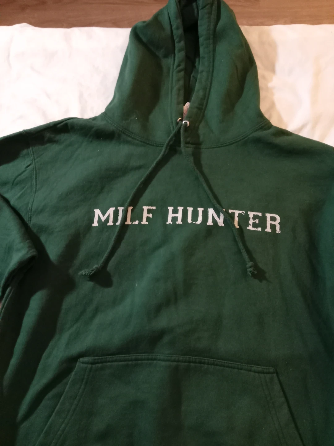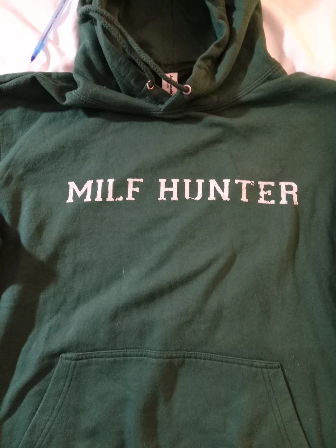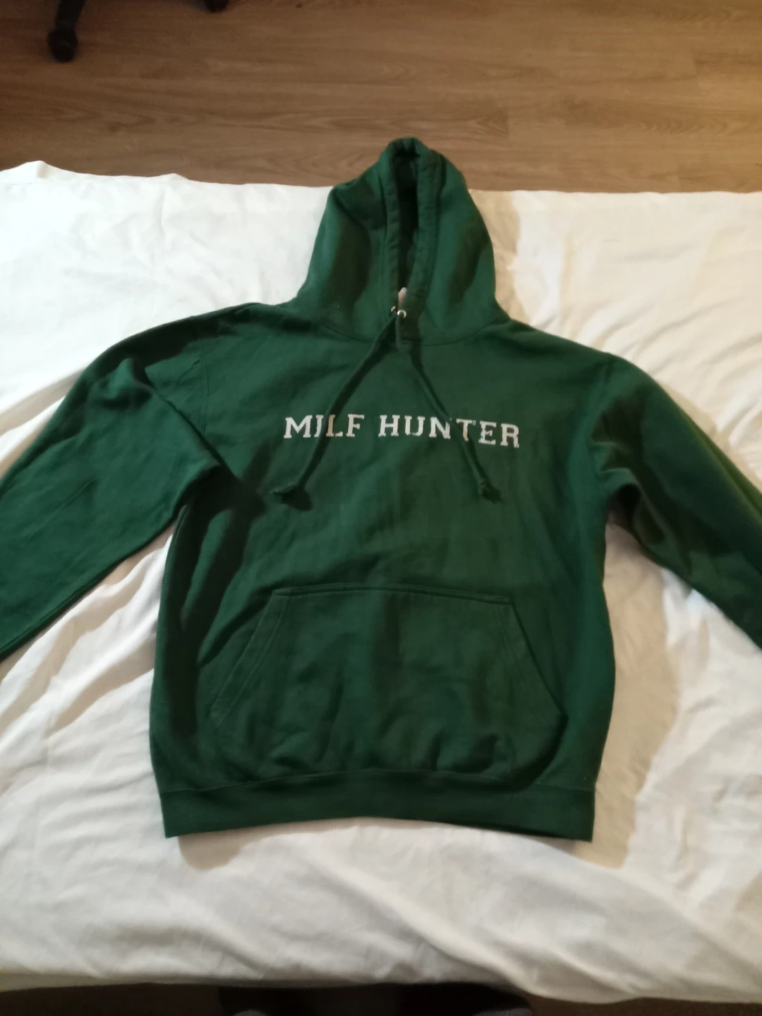 This is a green hoodie from Just Hoods with 'MILF HUNTR' printed on the front. It's a size medium. Made in Pakistan.