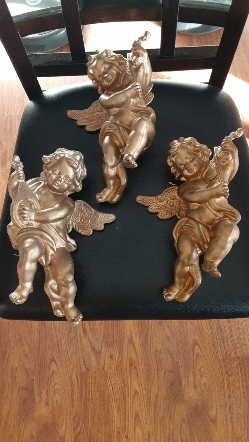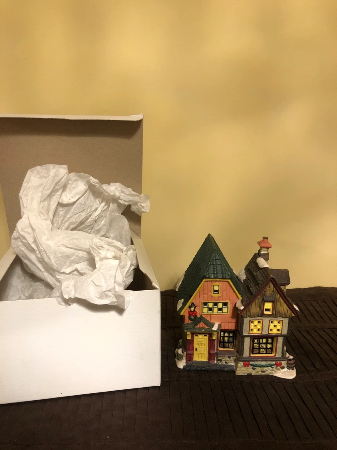 Selling a bundle of Christmas decorations! It includes a small artificial Christmas tree, a decorative house, several Santa hats, a Christmas tree stand, and three angel figurines. Perfect for getting into the holiday spirit!