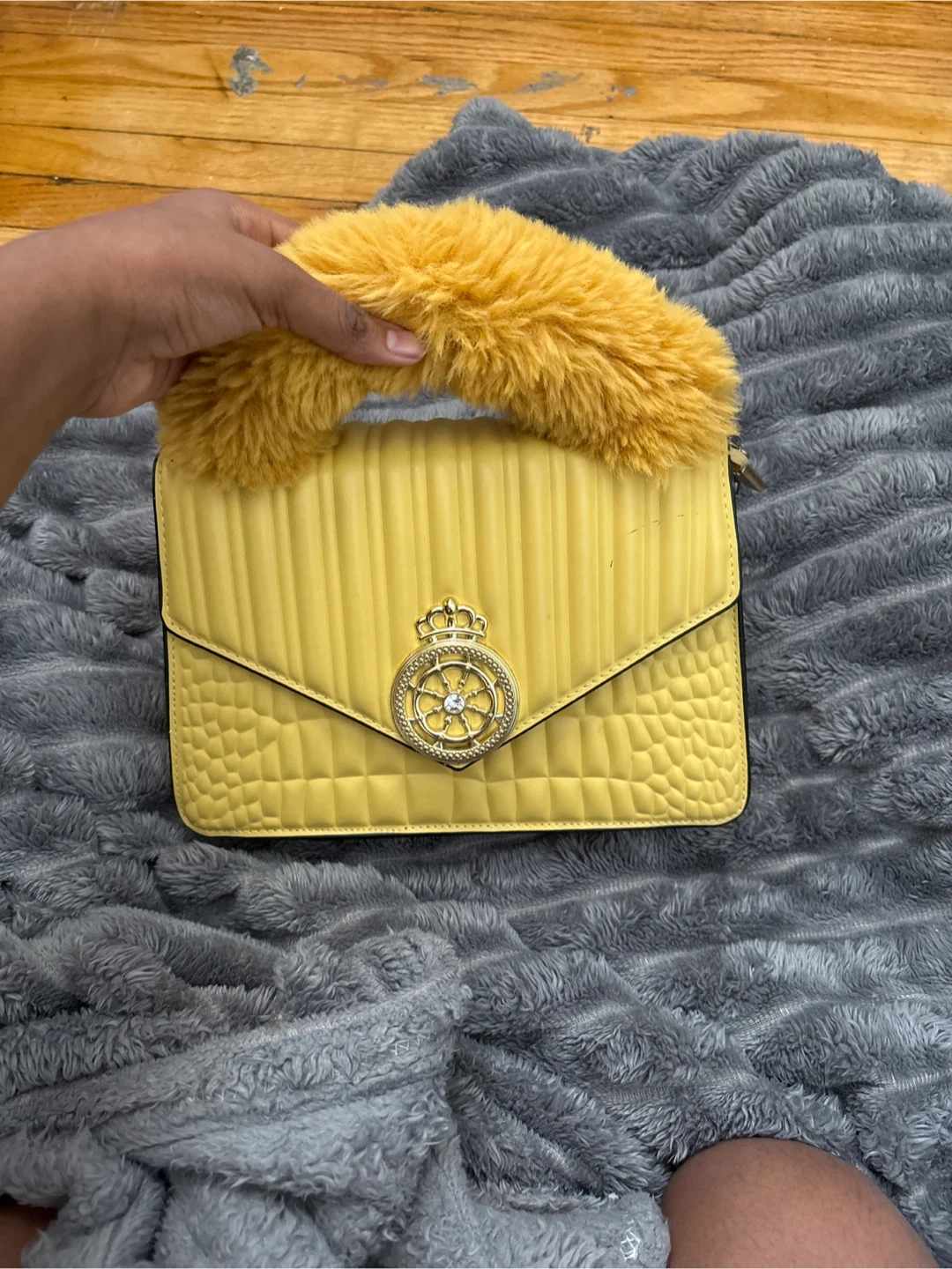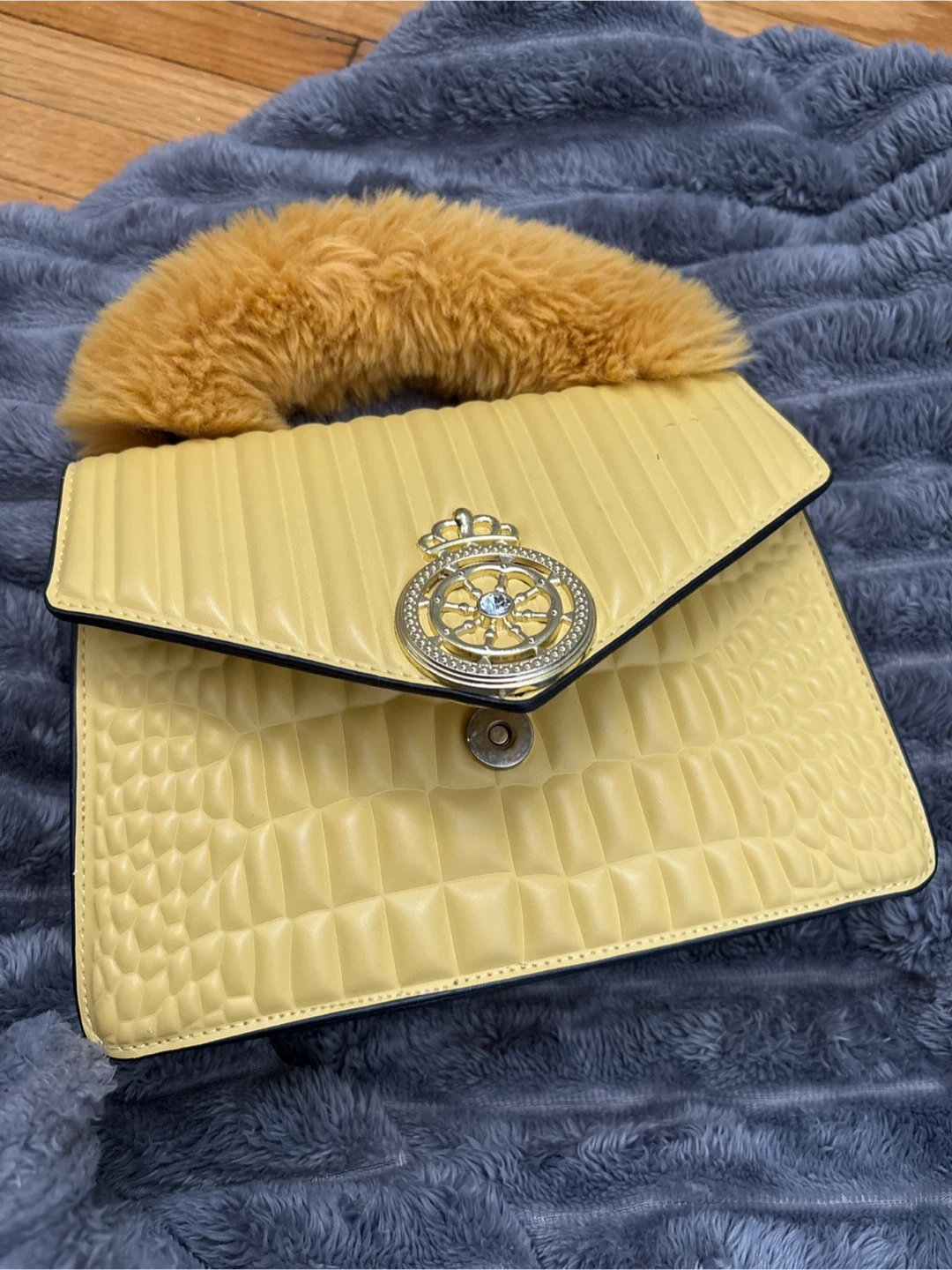 This is a cute yellow handbag with a faux leather texture. It has a unique design on the front and a fluffy handle. It's in great condition and ready for a new owner!