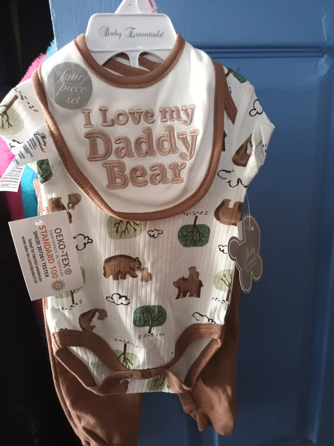 I have a brand new 'I Love my Daddy Bear' four-piece set from Baby Essentials. It features a cute bear and tree pattern with brown trim. Perfect for your little one!