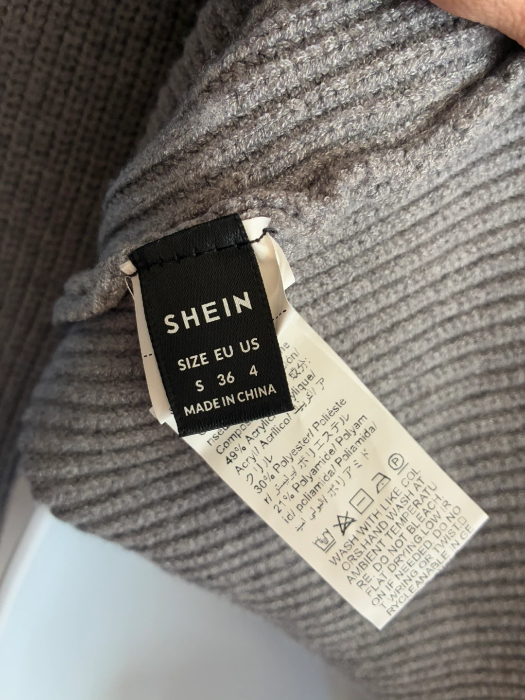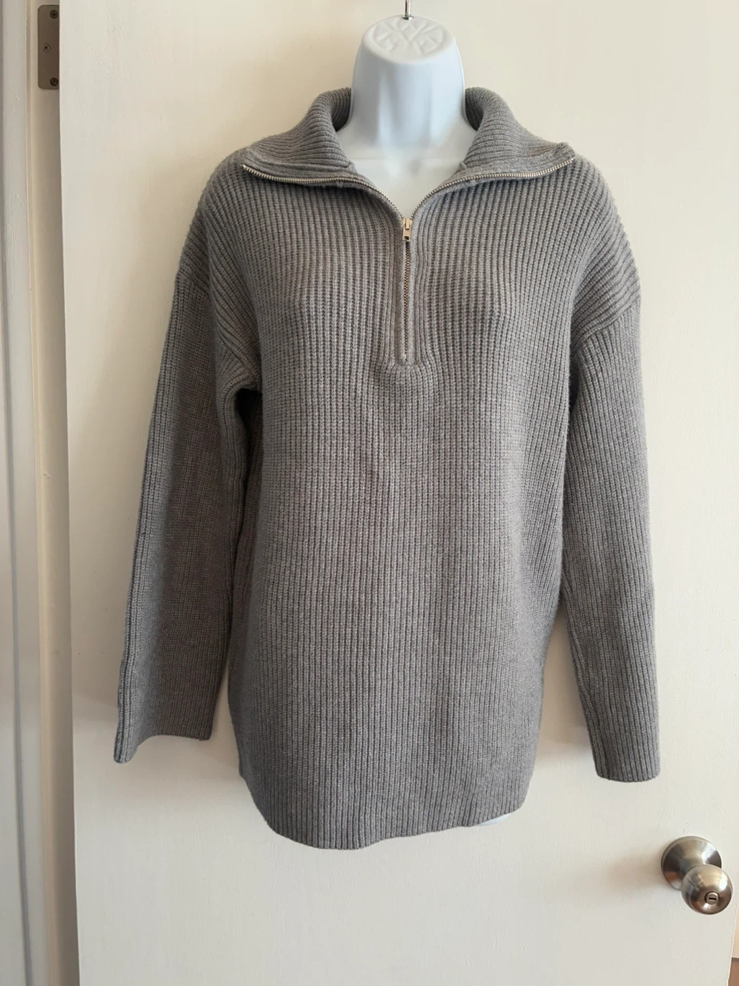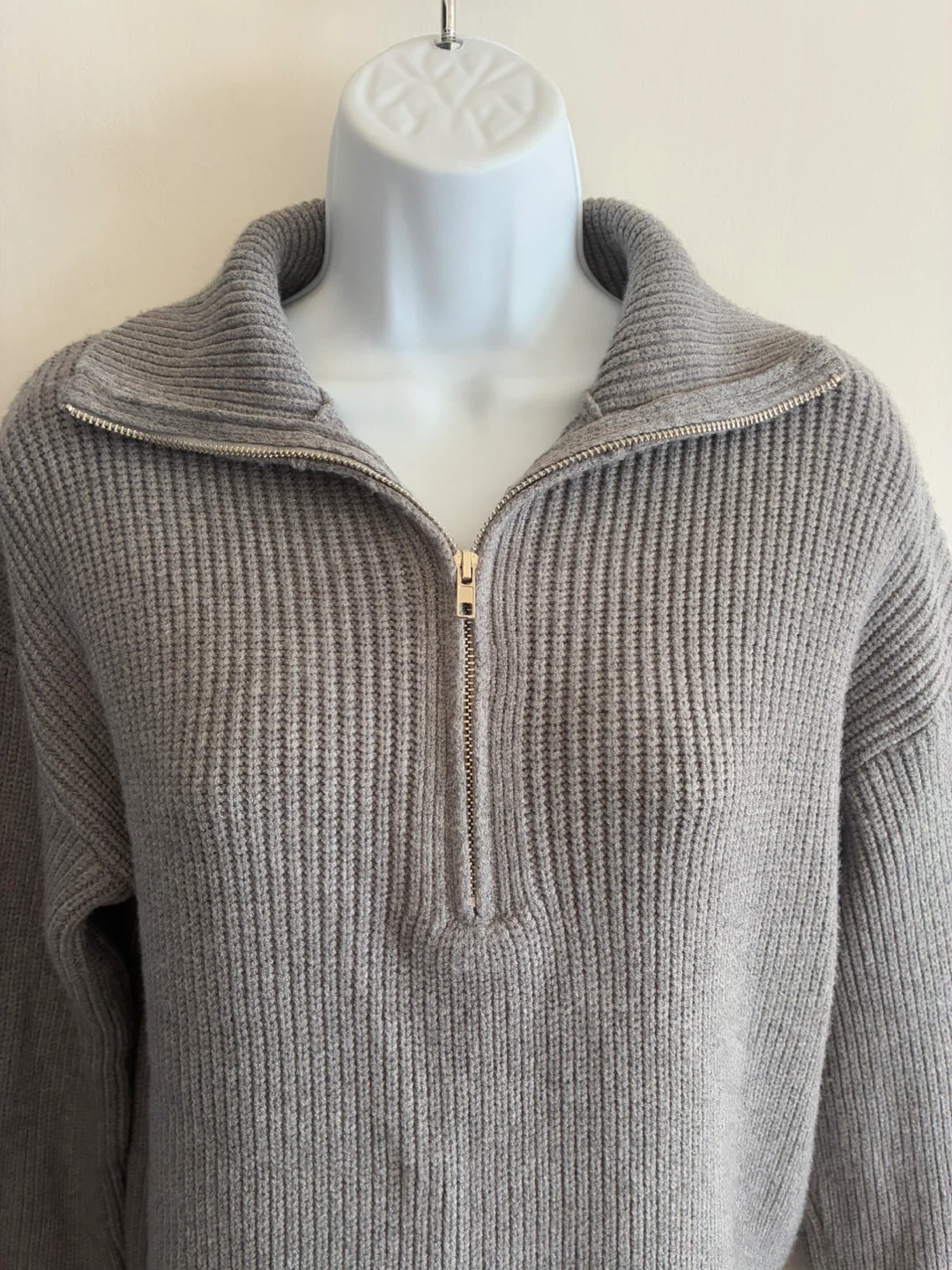 Cozy gray knit pullover from SHEIN! This sweater features a stylish quarter-zip design and is made from a comfortable blend of acrylic and polyamide. It's a size small and in great condition, ready to keep you warm!