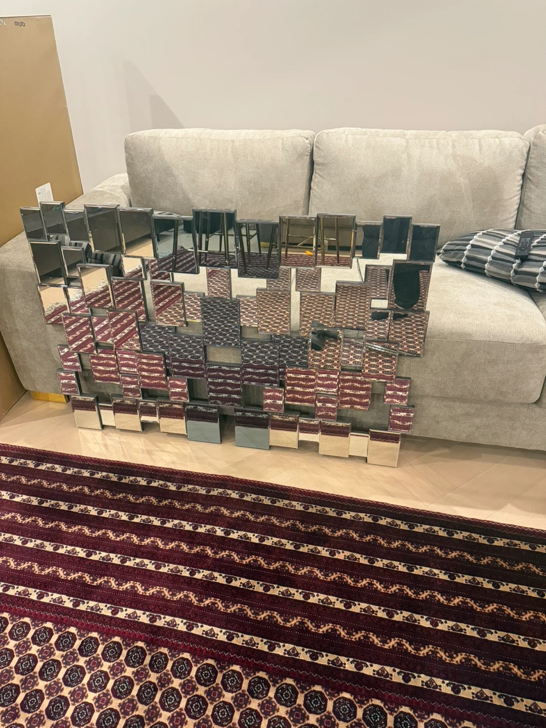 This is a really cool piece of wall art made up of individual mirror tiles! It's a unique way to add some visual interest to your space and reflect light around the room. It's in great condition and ready to hang!