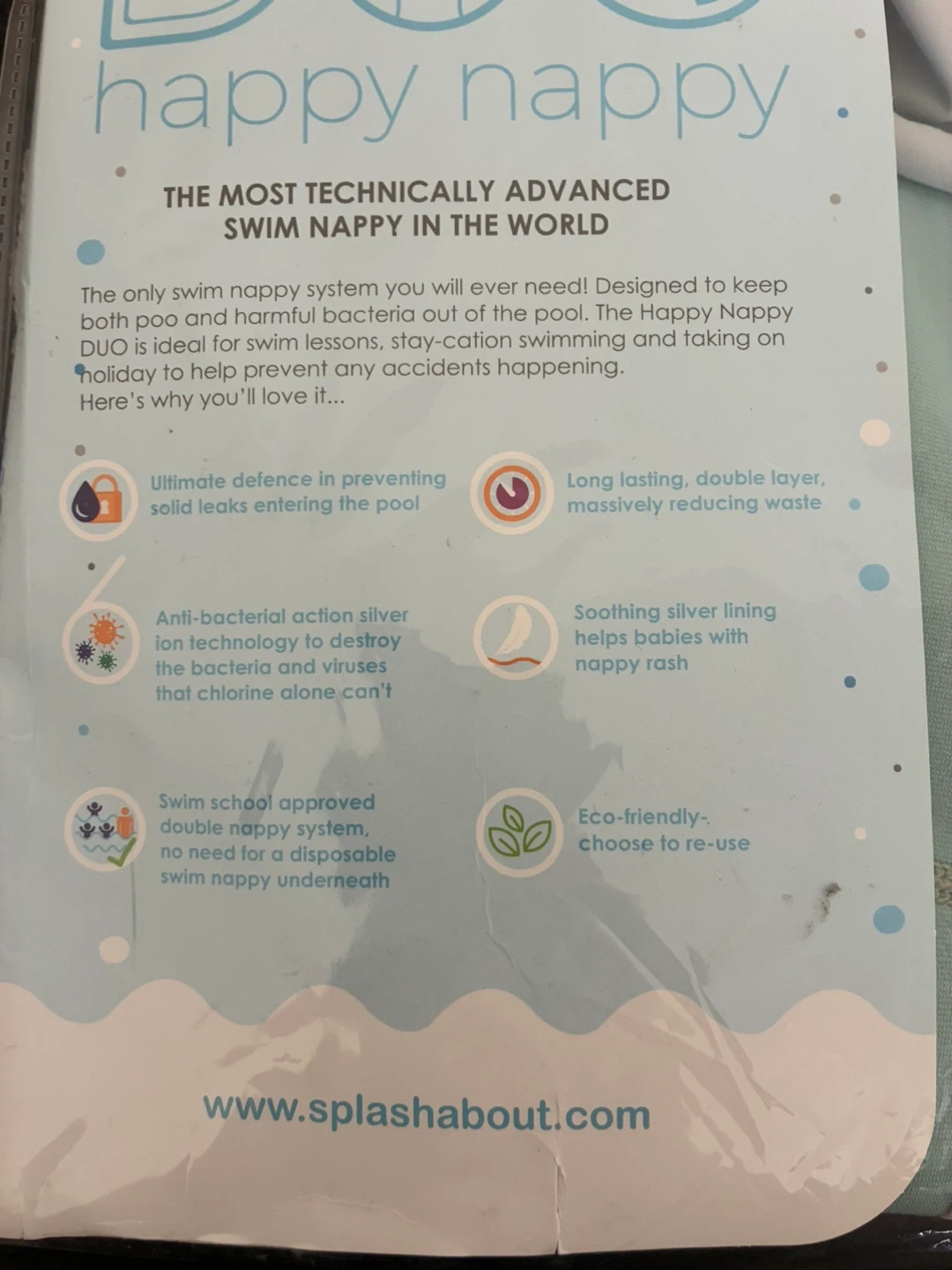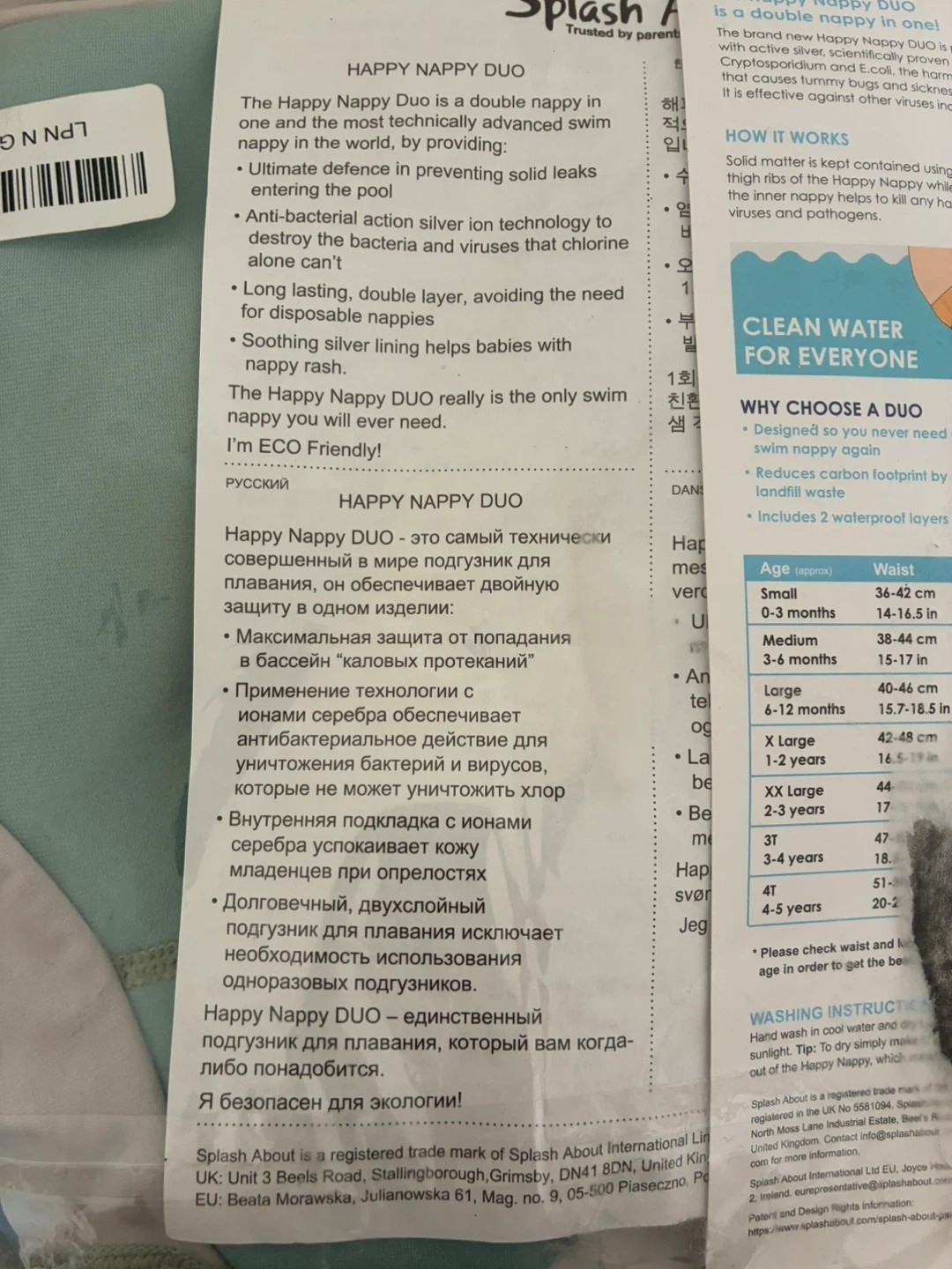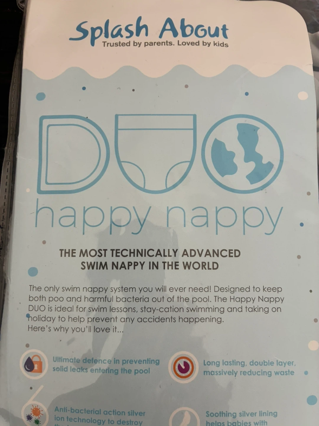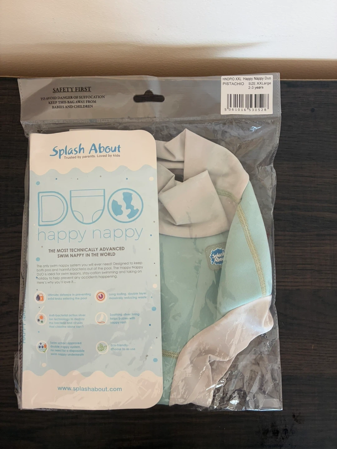 This is a brand new Splash About Happy Nappy Duo in size XXL. It's designed to keep both poo and harmful bacteria out of the pool. The Happy Nappy DUO is ideal for swim lessons and stay-cations. It prevents any accidents from happening. It's also long lasting with a double layer and massively reduces waste. It features anti-bacterial action silver ion technology to destroy the bacteria and viruses that chlorine alone can't, and has a soothing silver lining that helps babies with nappy rash