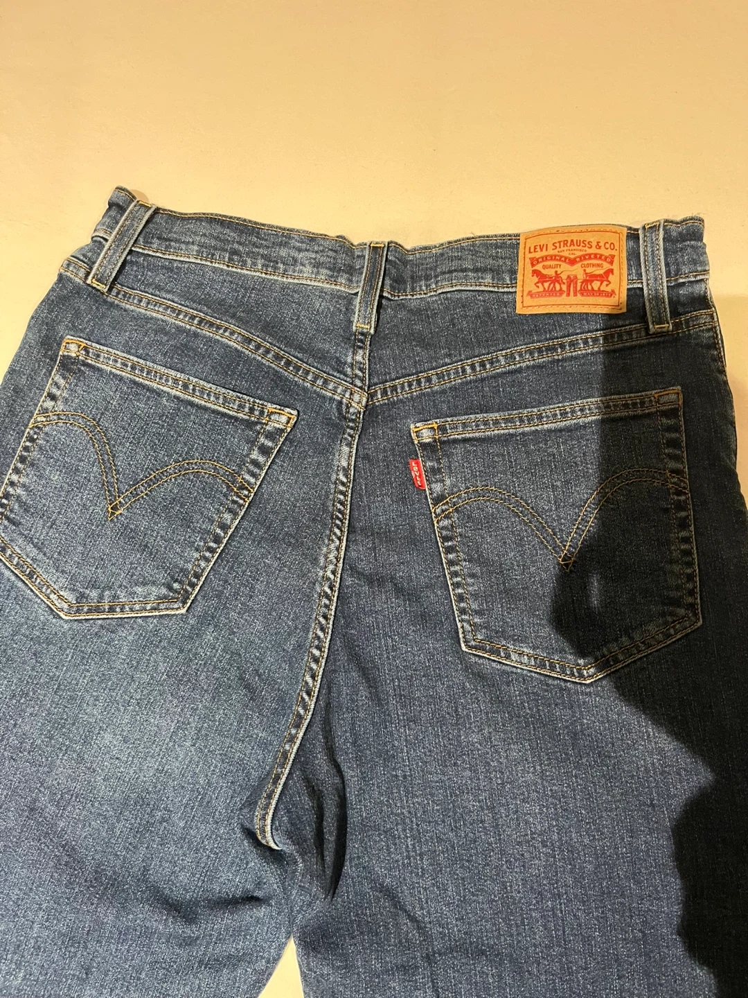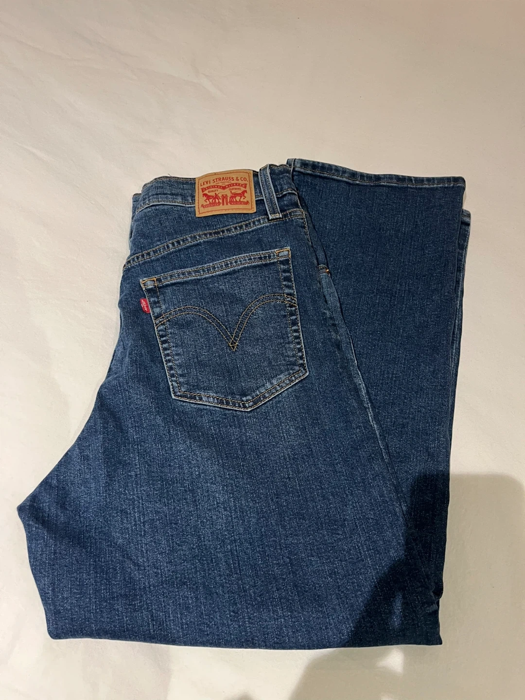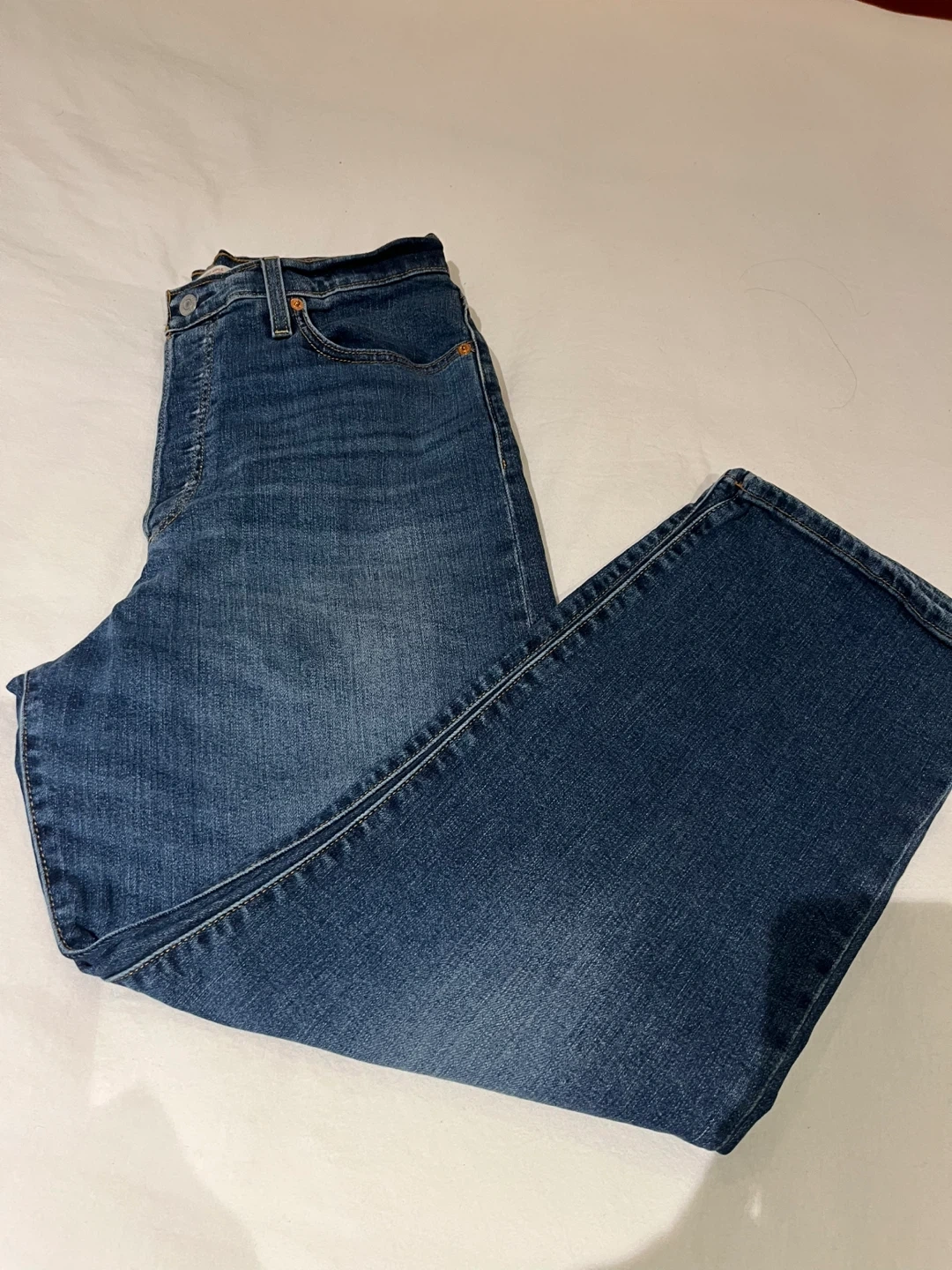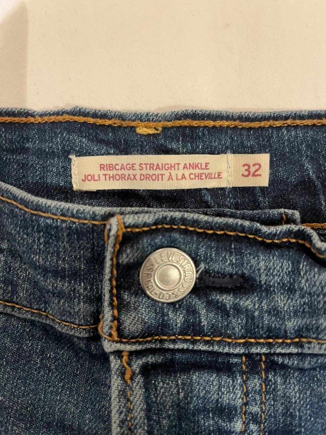 Selling a pair of Levi's Ribcage Straight Ankle jeans in size 32. These jeans are in great condition and have a classic dark wash. Perfect for everyday wear!
