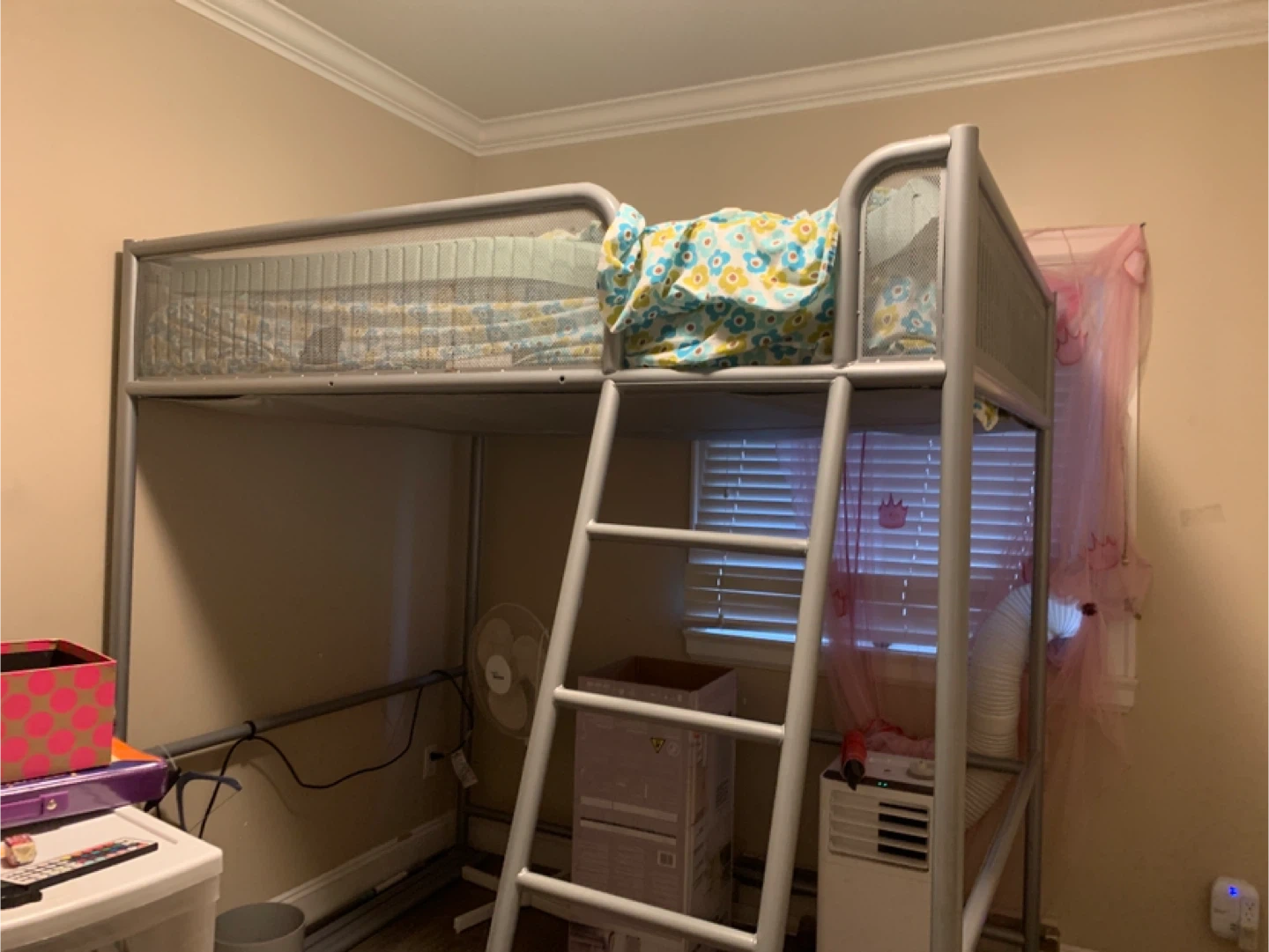 Selling a loft bed frame in silver. It's in good condition and perfect for saving space in a smaller room. Great for kids or teens! Or office under the bed